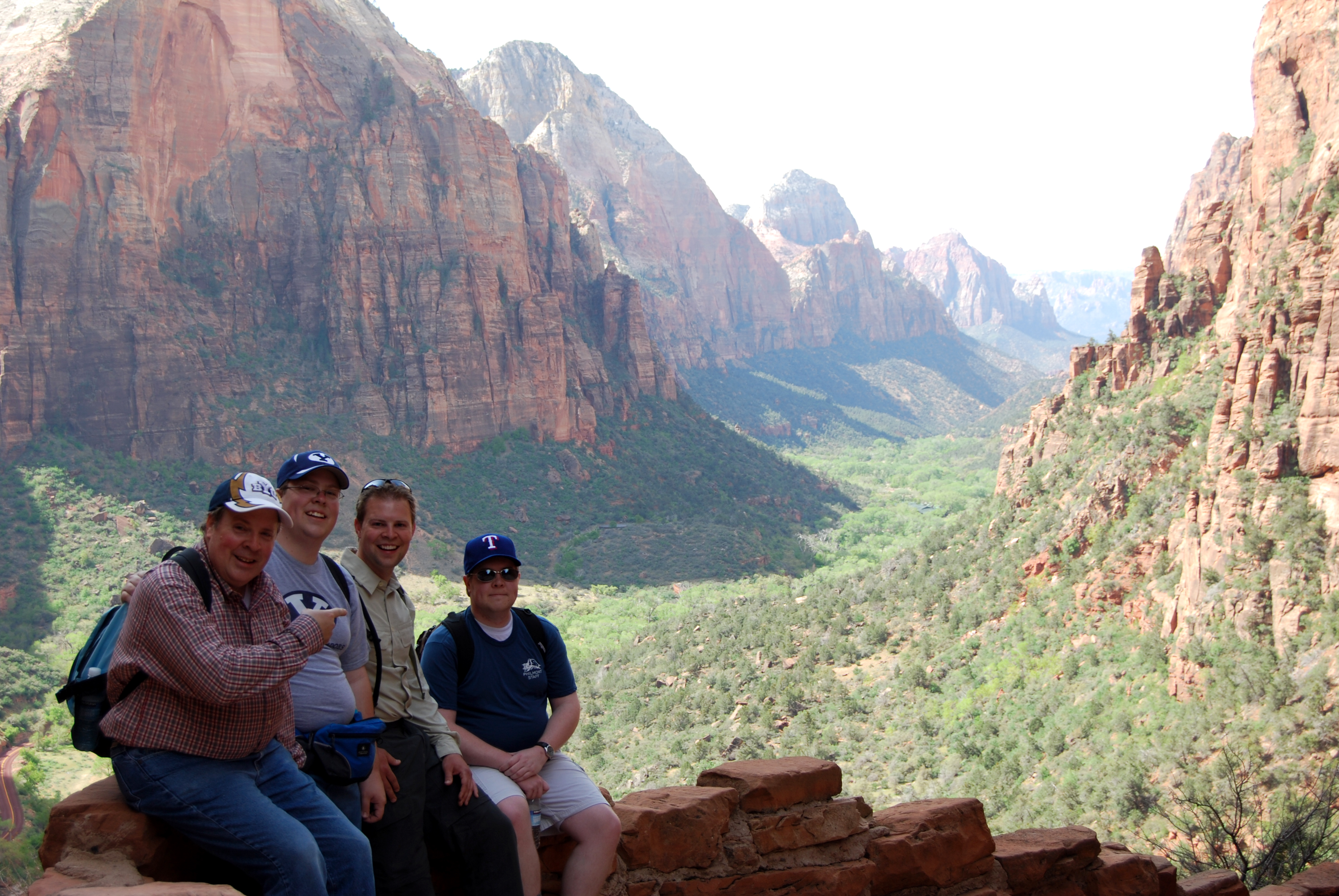 When we reached the top we had a grand vista of Zion Canyon. Looking up the canyon we could see the Temple of Sinawava. Looking to the side of us we could see the Weeping Rock, Observation Point, the cable system from the 1800s and more. Looking down the canyon we could see all the way to the campsites. It is majestic. After a while of sitting and looking out, the wind started picking up and we headed down. Later we heard that someone got spooked by the height and froze on the trail. They had to send rangers up to get the person down and they had search and rescue waiting at the bottom of the cliff.