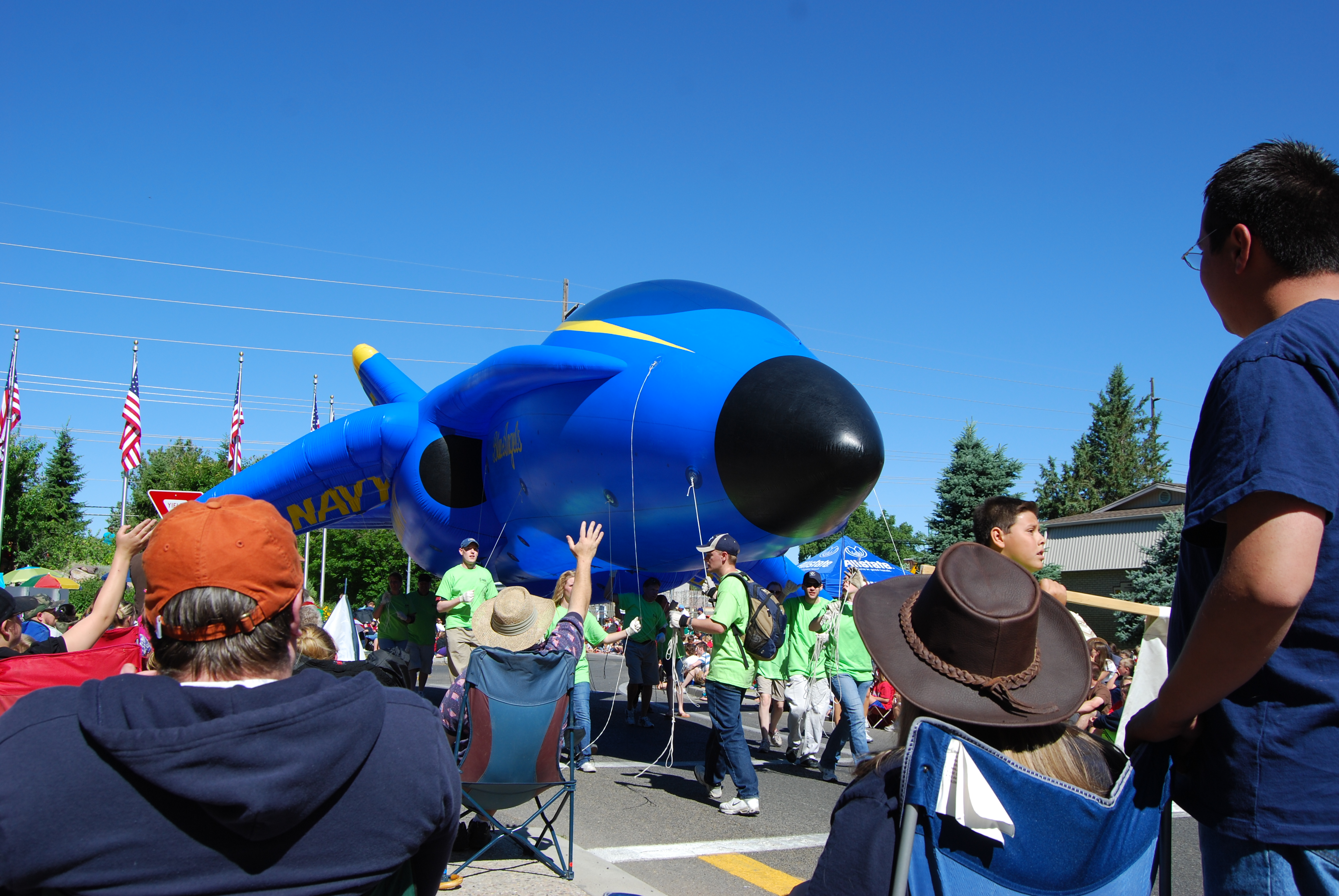 We were up close and personal with all of the floats, participants, bands and more. The floats alternated which way they went around the circle so we got to see both sets just as close. Some of the bands even came around both sides giving us a stereo performance with band on both sides. The only downside was the balloons that had to be lowered until they made it all the way around and past the roundabout because of low-hanging power lines. Because of this we got smothered by a couple like the Blue Angel jet. As we waited for the parade we also got to watch the hot air balloons from the balloon festival fly up over Provo from the high school. It was a fun parade and a great way to celebrate Independence Day.