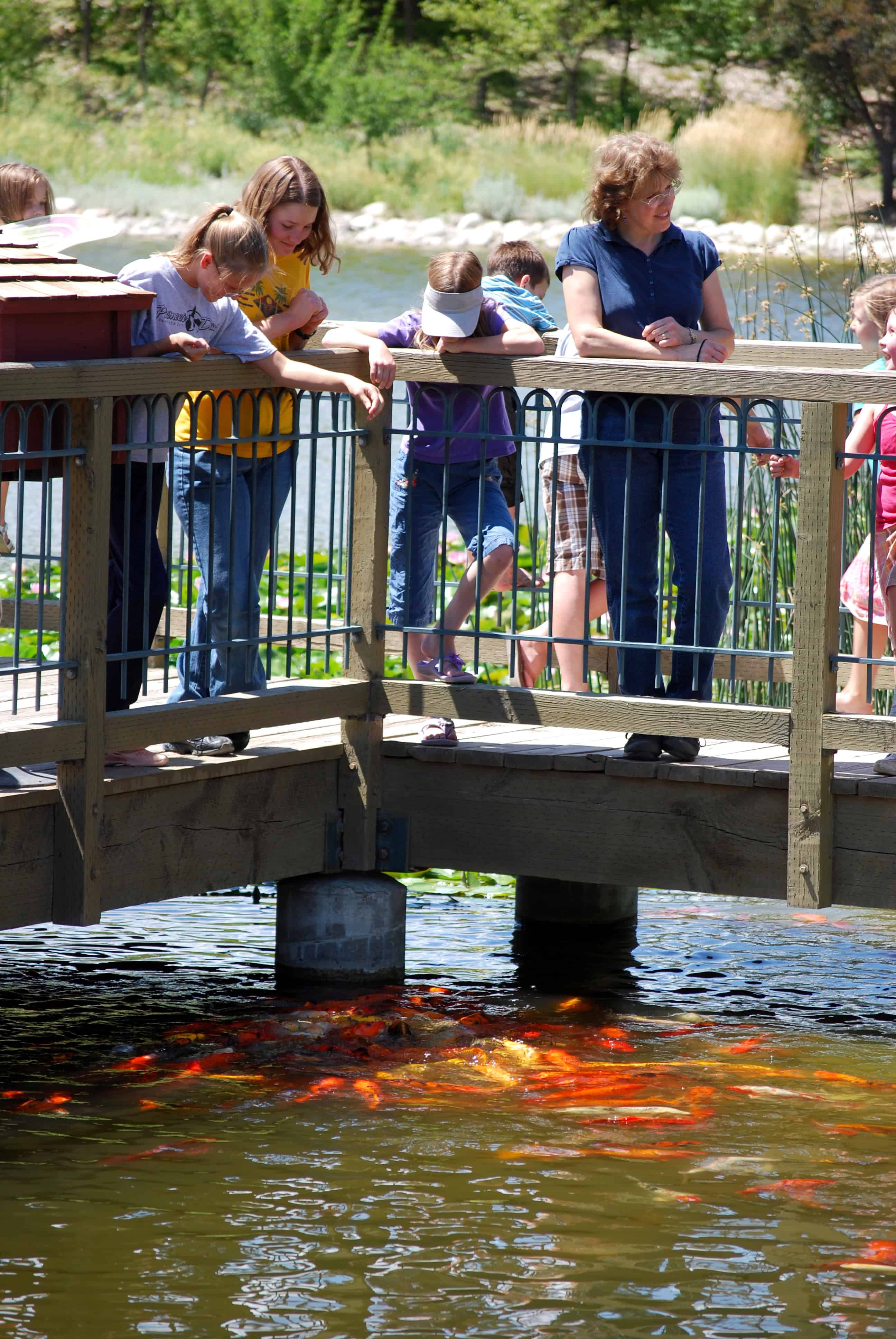 Throughout the gardens there are features that are very European like fountains, a rose garden and arbors. There are also other water features like the water lily pond, named for Monet, and a stream that runs from the waterfalls to the pond. In the lily pond are big koi fish that kids love to feed, and if you keep your eyes sharp, you may see frogs or snakes.