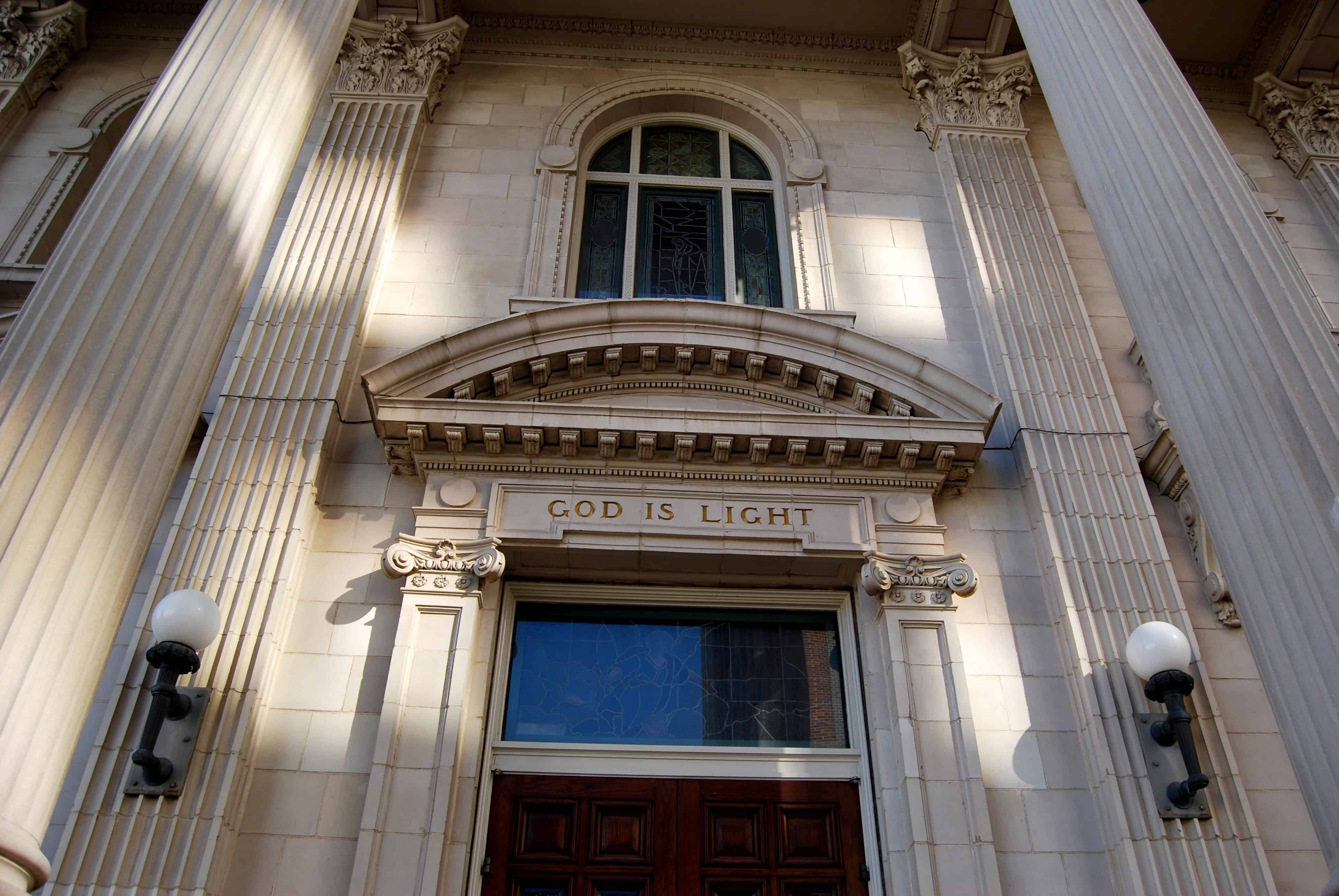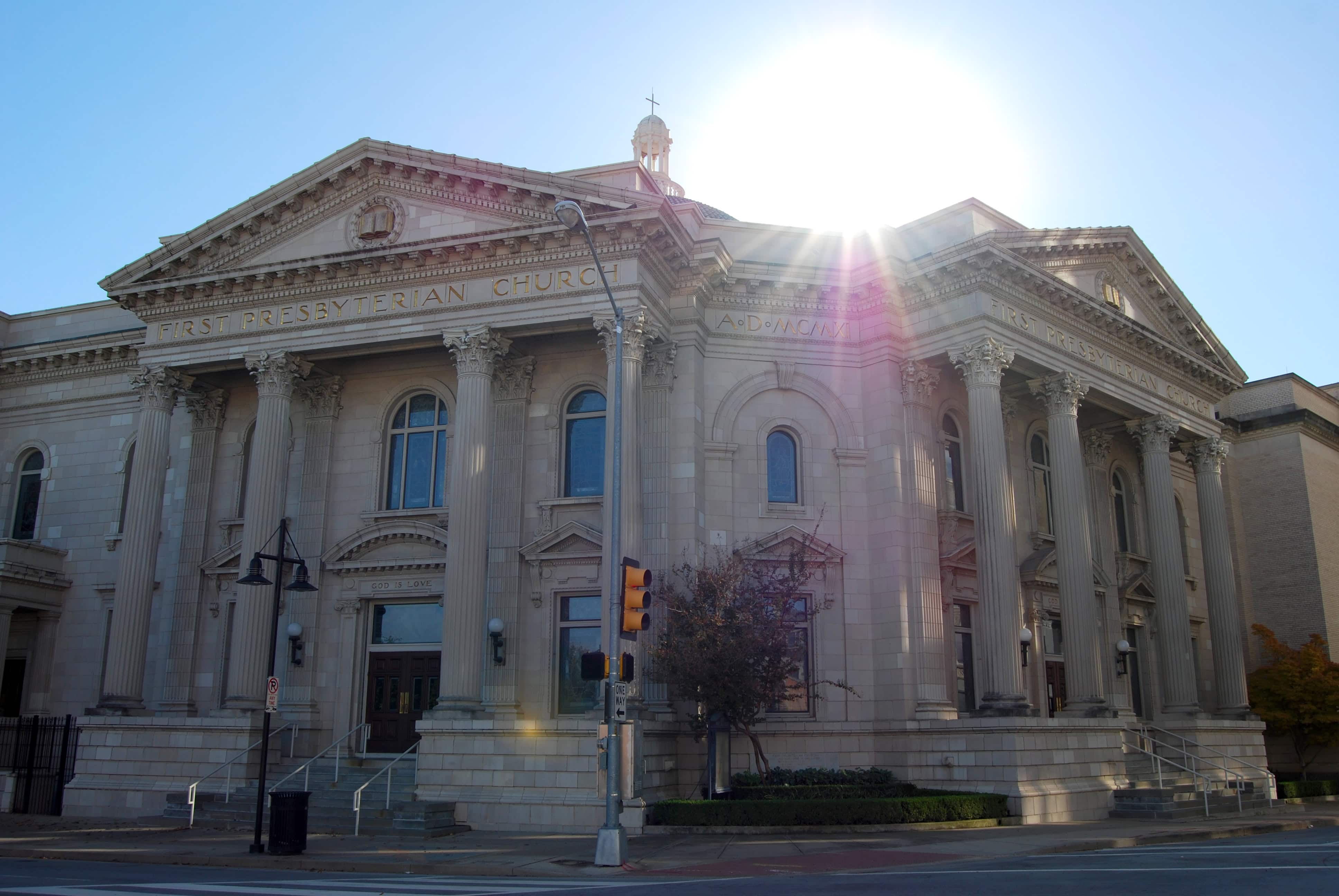 Down the street is another beautiful building, the First Presbyterian Church, built in the early 1900s. This one also Neo-Classical Revival in style. There are two wonderful porticos to this church with single-piece, solid columns flanking the entrances that have wonderful arched pediments over the doors.