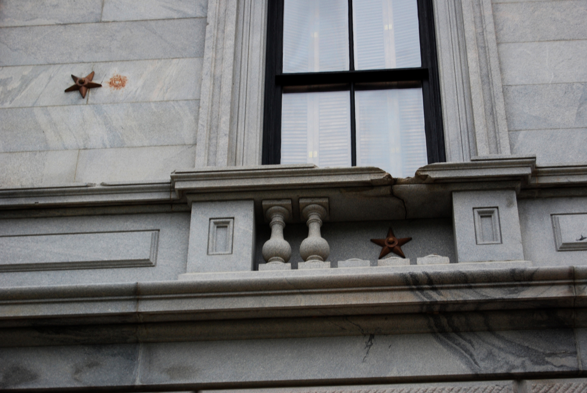 All around the building are monuments and memorials to veterans of different wars, to African Americans and to important individuals. One of the most interesting memorials is part of the building itself. During the Civil War, Union troops closed in on Columbia and from the river fired their cannons at the new building. Six balls hit the exterior damaging decorative details and leaving divots. Today these hits are memorialized by six stars on the façade next to each of the places that were hit.