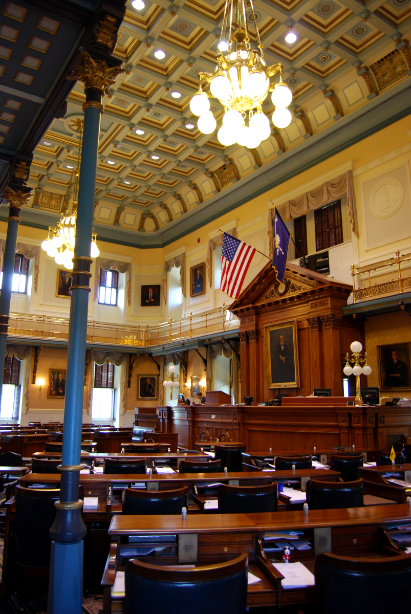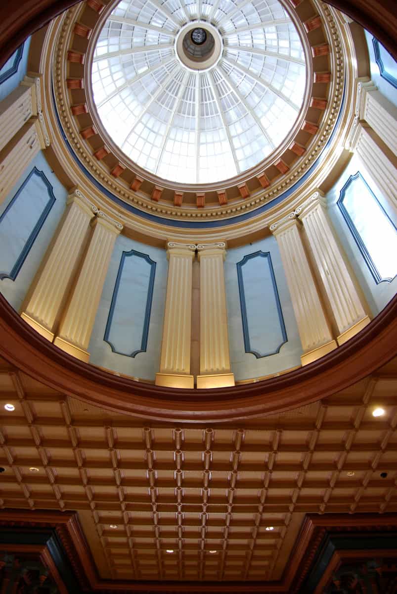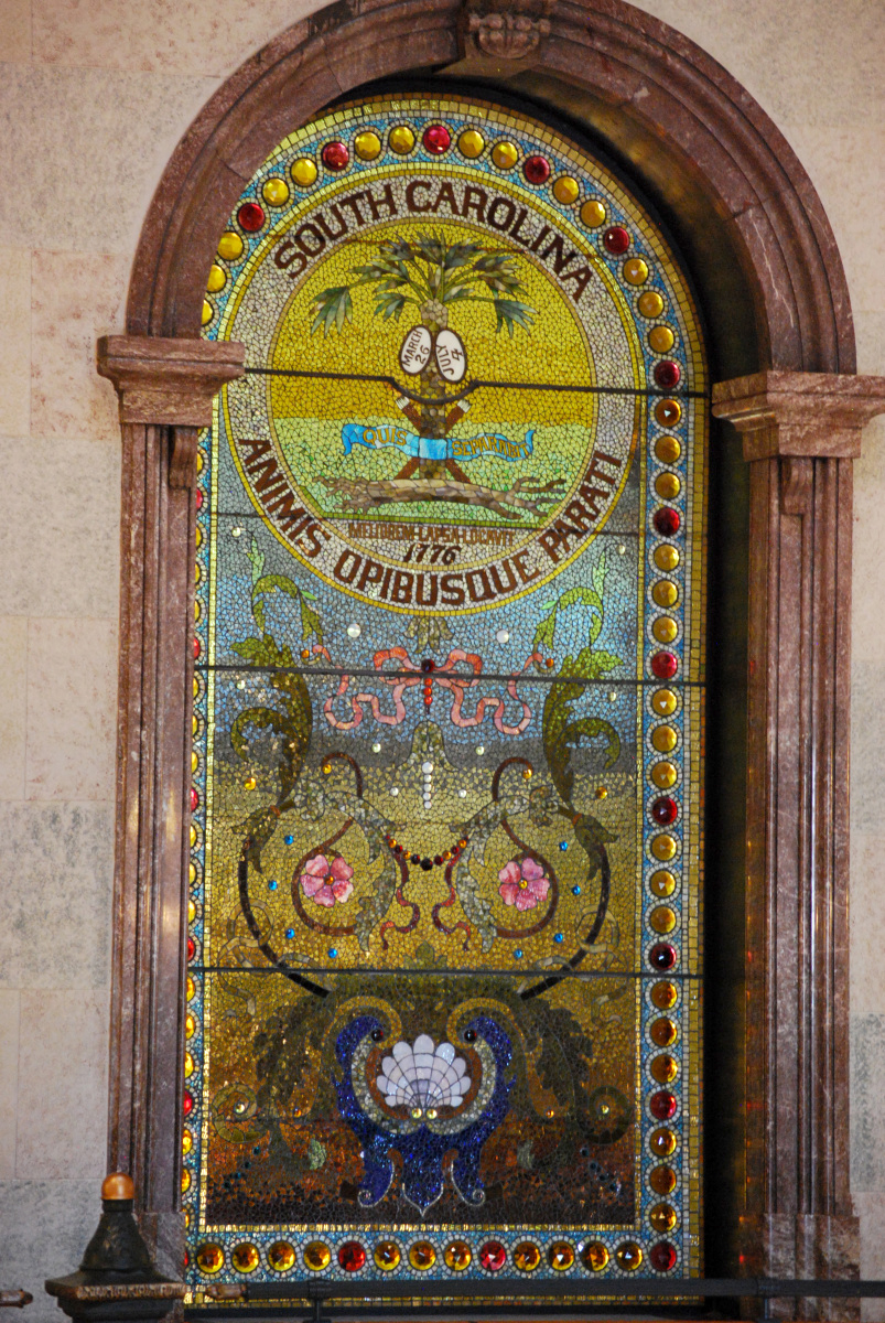 The inside is also beautiful. It seems to be a very simple building with four main areas. In the basement are the offices of the governor and lieutenant governor. The main floor has a large meeting room for each house of legislature, the state’s Senate and House of Representatives, and a large library/reading room. These three spaces come off of a large open lobby area that is beautifully decorated with the rotunda at the center. Around the second level of the lobby is a balcony that runs around with access to spectator galleries for the two house chambers. In the lobby is a beautiful stained-glass window, South Carolina’s statement of succession from the Union and many beautiful paintings of people and stories of the state.