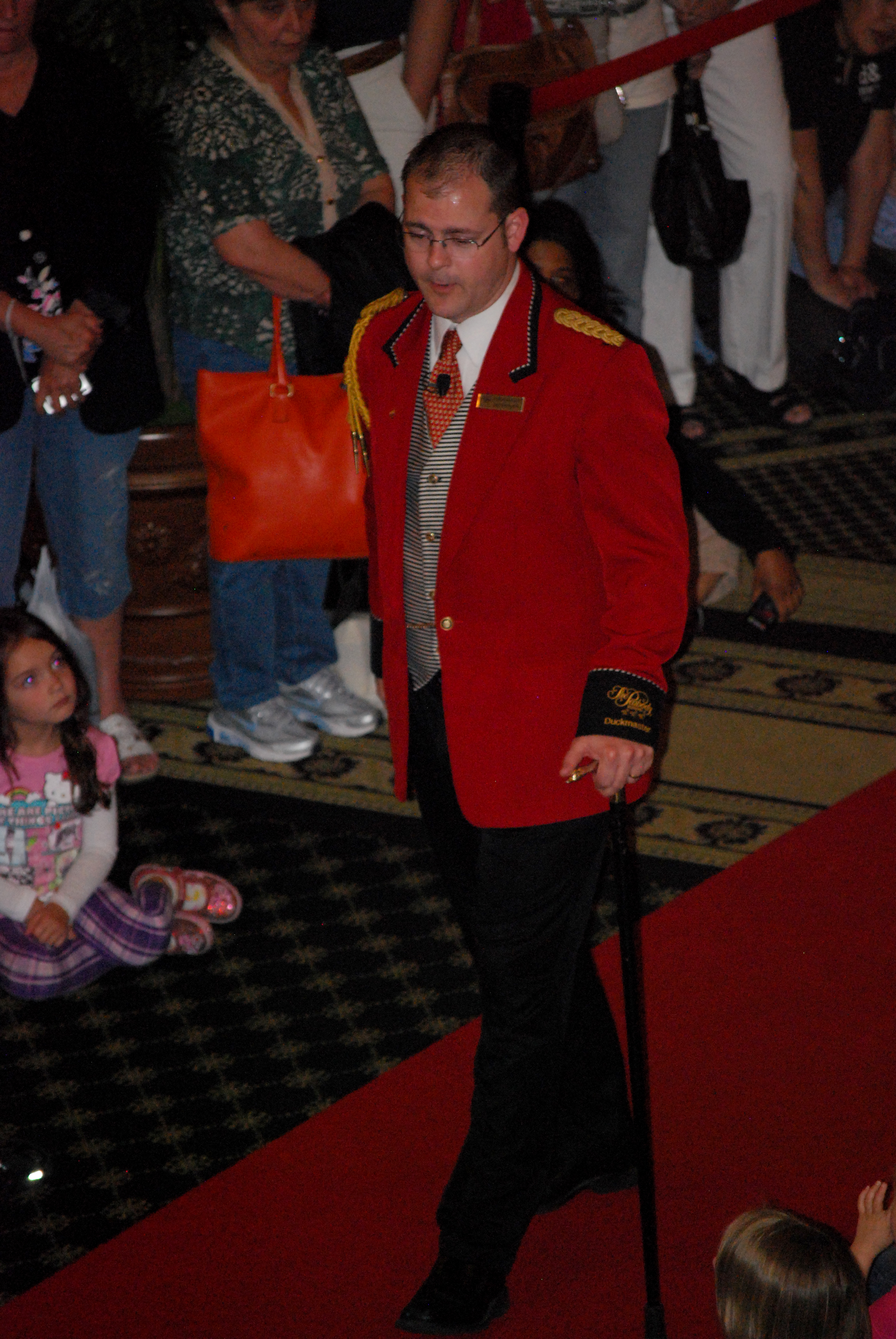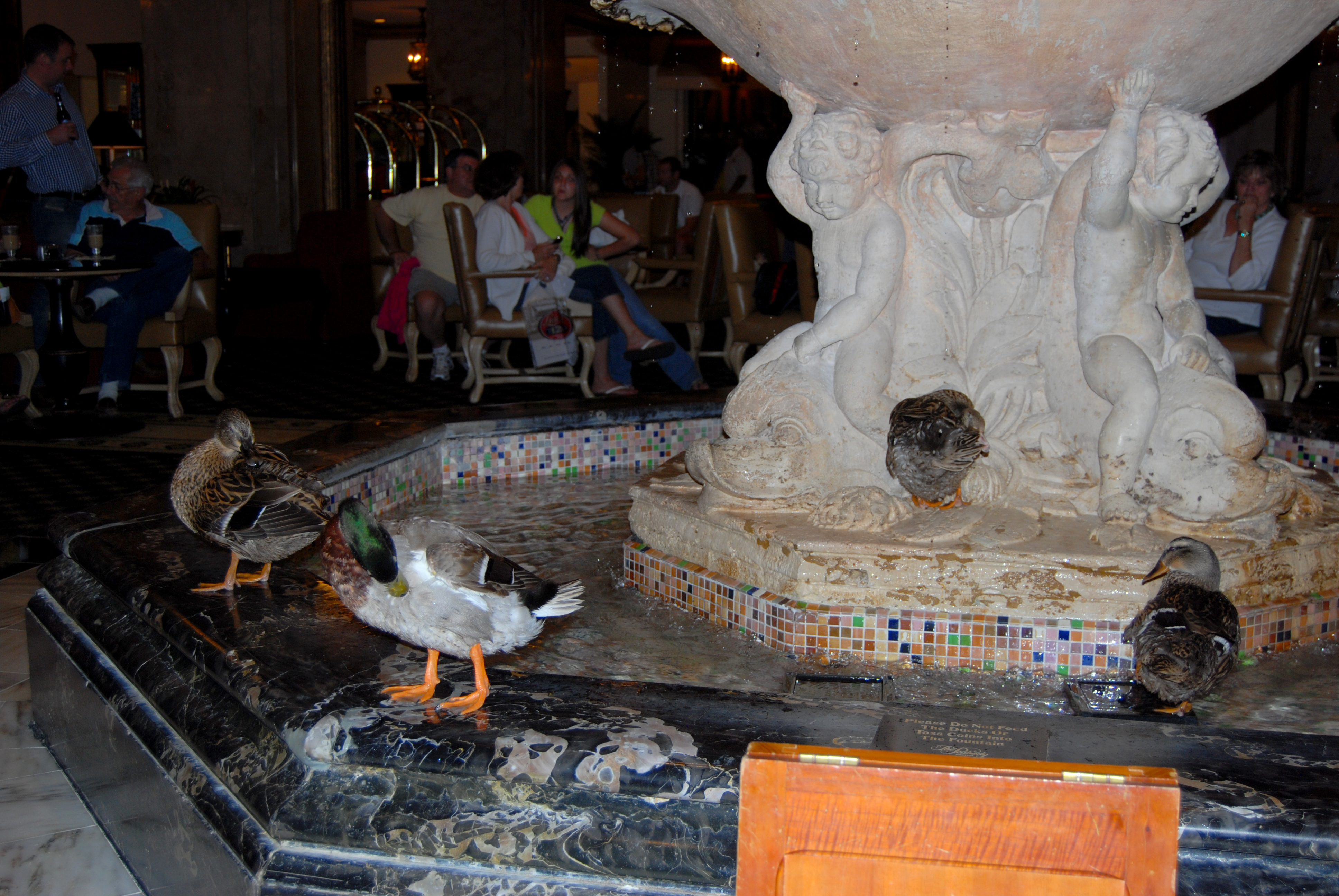 Every day at 11 a.m. the ducks are led from their penthouse on the roof down the elevator and across the red carpet to the fountain in the center of the lobby where they spend their day. At five the ducks march back across the red carpet to the elevator and back up to their home on the roof. They are led and cared for by the Duck Master, a job that I think I would love having.