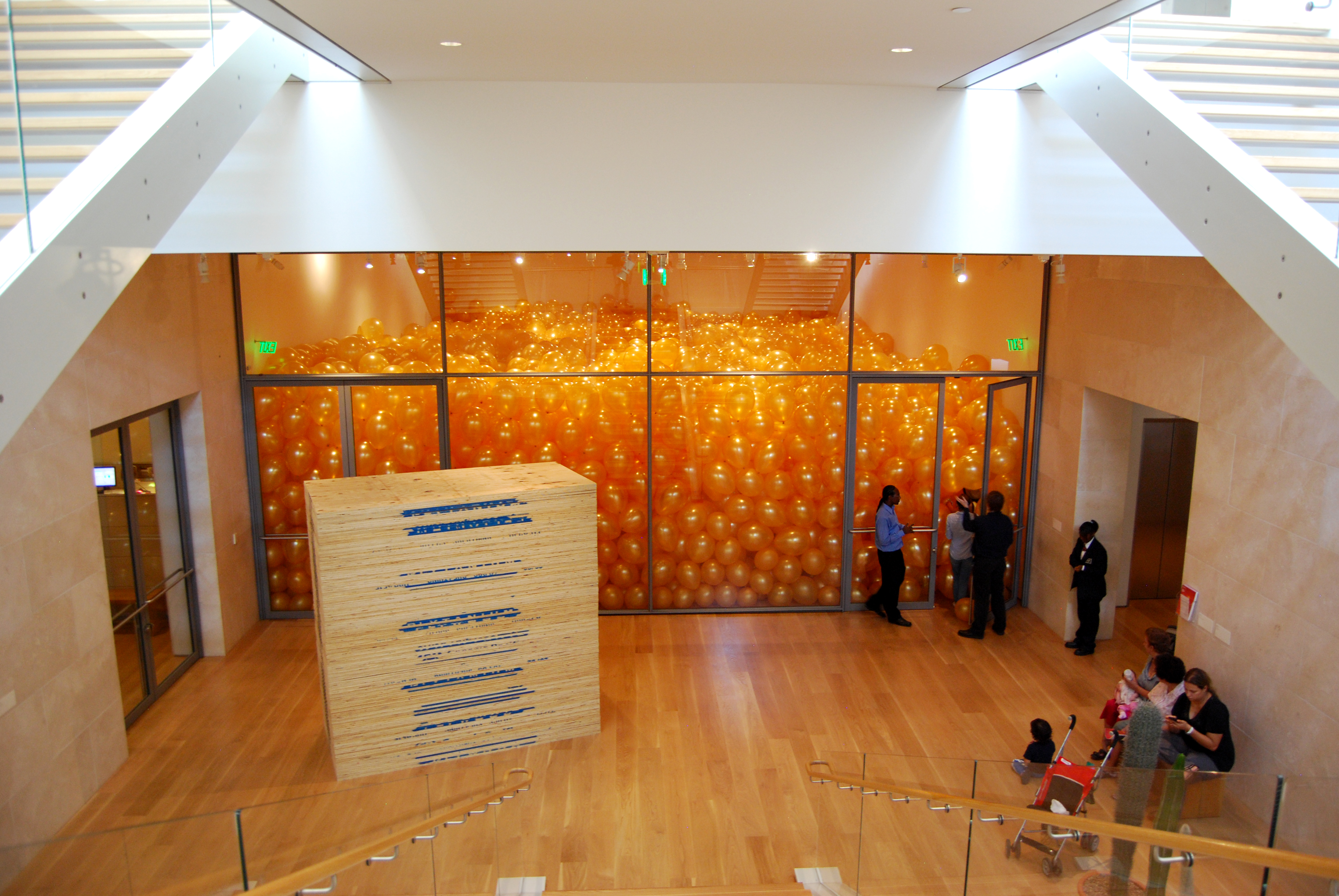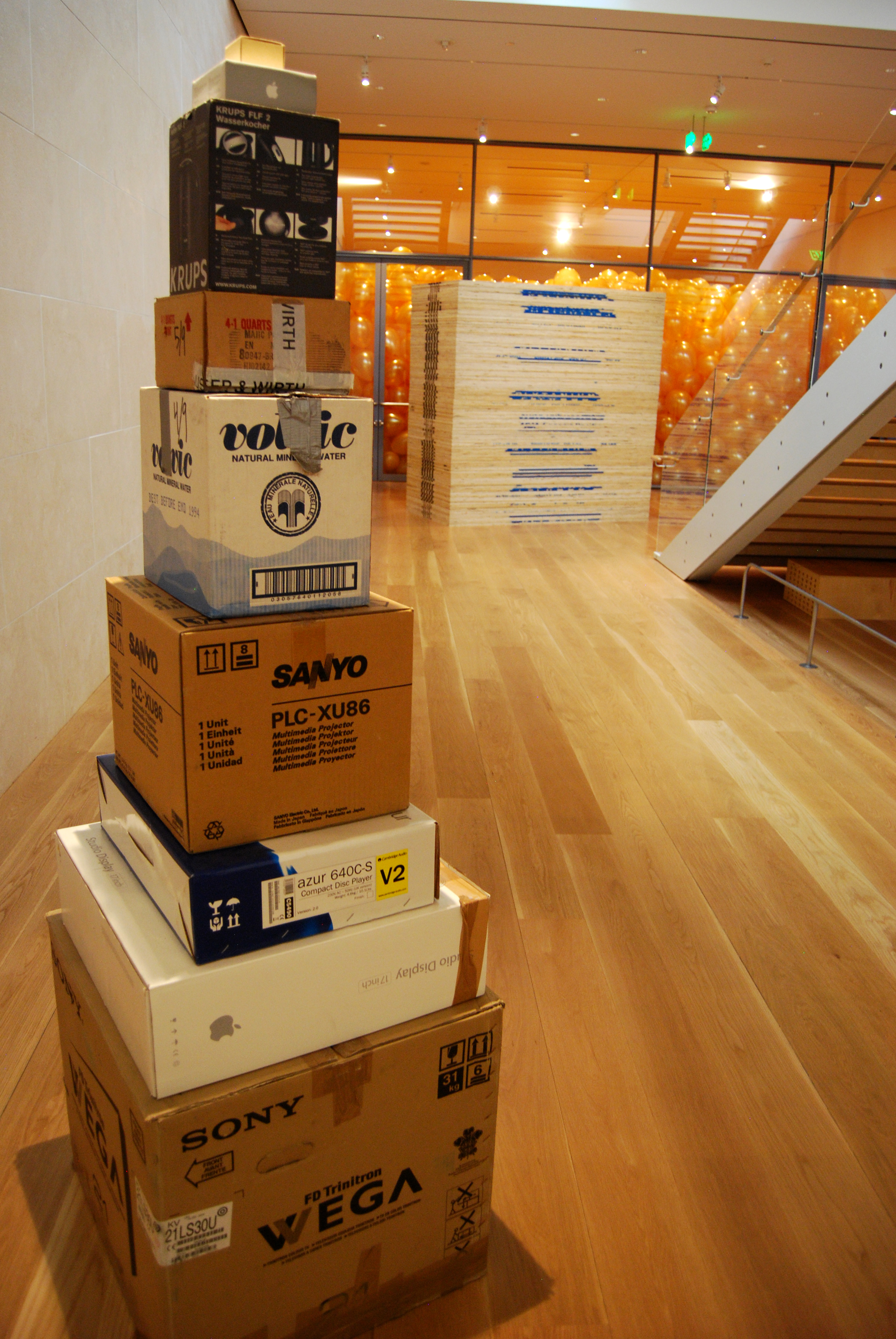 Outside the balloons at the bottom of the piano stairs are more sculptures from Creed. These sculptures bring me back to my opening thoughts on what art is. His other displayed works included a stack of plywood about eight feet tall, a pile of nine boxes stacked from largest to smallest, and a line of cacti from tall to short. I really liked the cacti but the plywood and boxes seemed a little bit of a stretch. After all, I have a pile of boxes in my closet and my mom has lots of piles of boxes in the garage, and I’ve seen stacks of plywood like that at Home Depot or Lowes. This exhibit was extended until 21 August 2011.