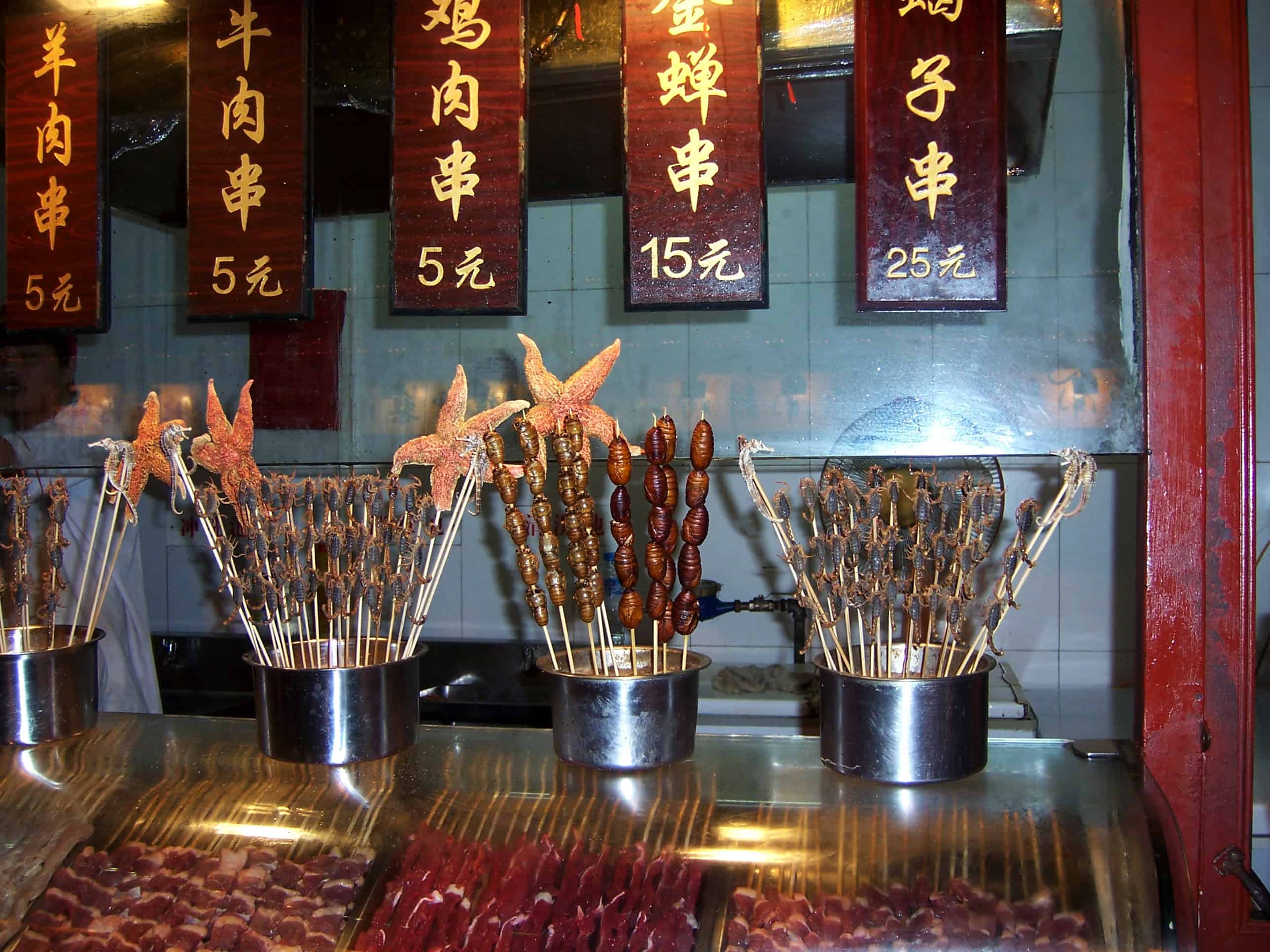 Off of this street is a little alley we found with food vendors. What were they selling? Nothing much, just scorpions, starfish, cicadas, sea horses, silk worm pupae and more. Its like we were on the set of a Bizarre Foods episode. I half expected to see Andrew Zimmern there sampling the morsels. We went back another night to test these delicacies and tried scorpion. It didn’t taste like anything except the seasoning and it was really, really crunchy.