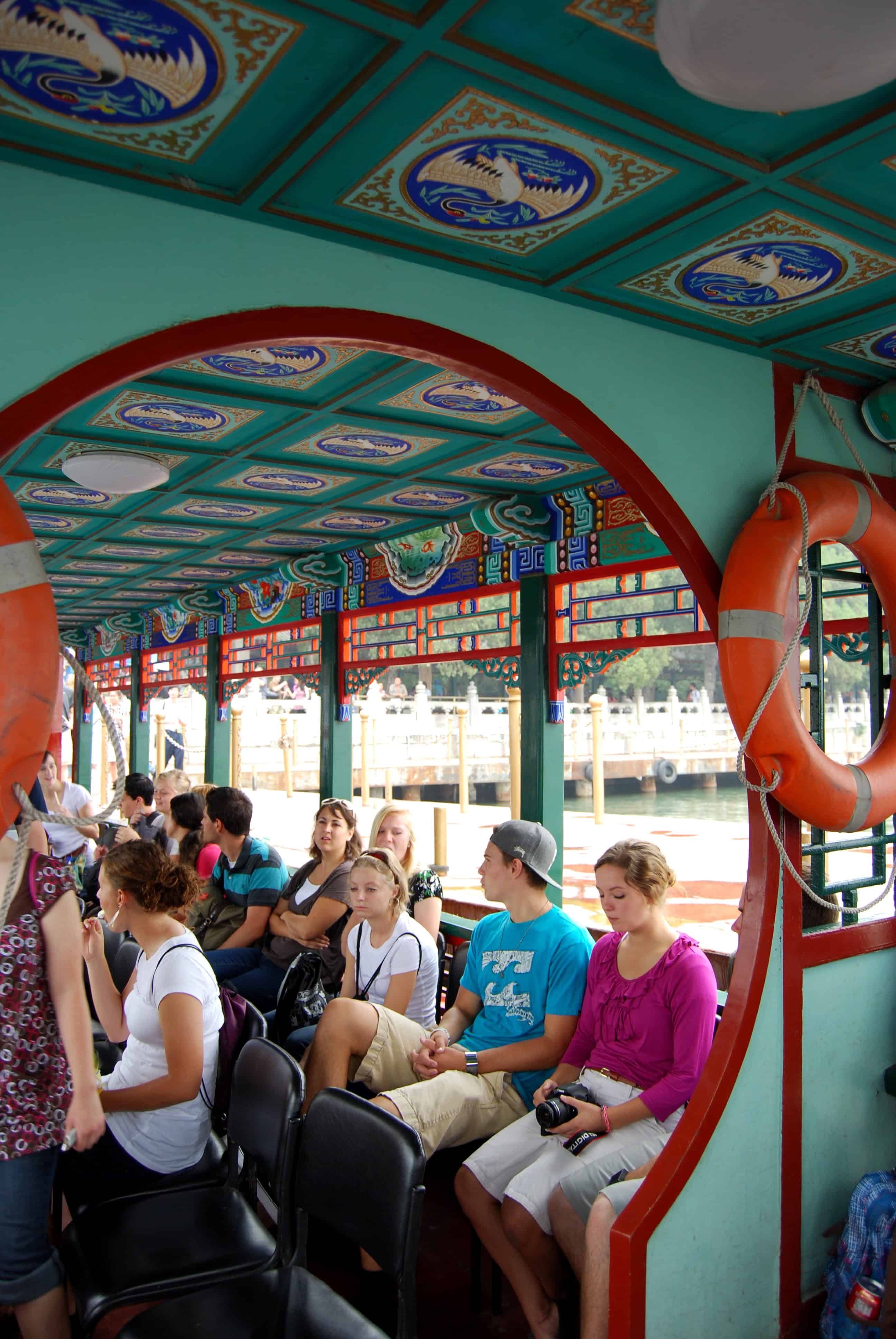 Once we reached the other end of the lake and were below the giant pagoda, we found our way to the dragon boats. Next to their docking area was the marble boat built by the empress. We rode the dragon boat across the lake and docked next to a long bridge with many arches leading to an island. We had a few minutes to check it out before leaving the Summer Palace. Once again we found a large group of people with a band and director gathered singing.