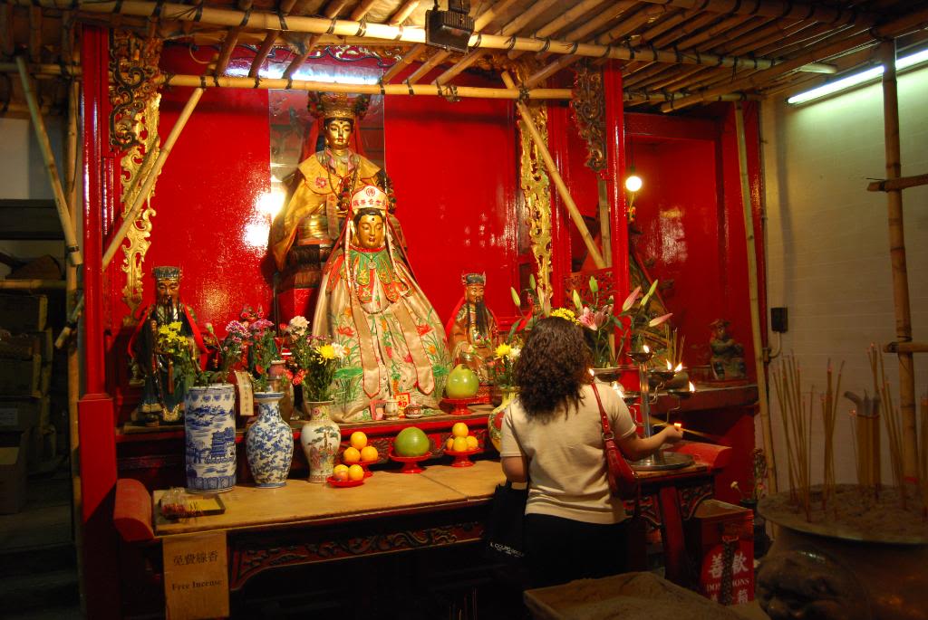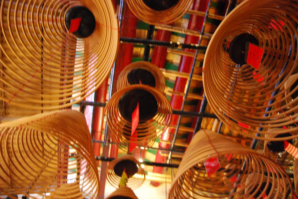 Inside are several altars set up to worship various all of the gods and goddesses of Toaism with the main two of this temple being the Gods of Literature and Marshal Arts or War or Man and Mo. There were offerings in front of each statue of fruit and incense. And there was a lot of incense burning all over including some really cool coils of incense hanging from the ceiling.