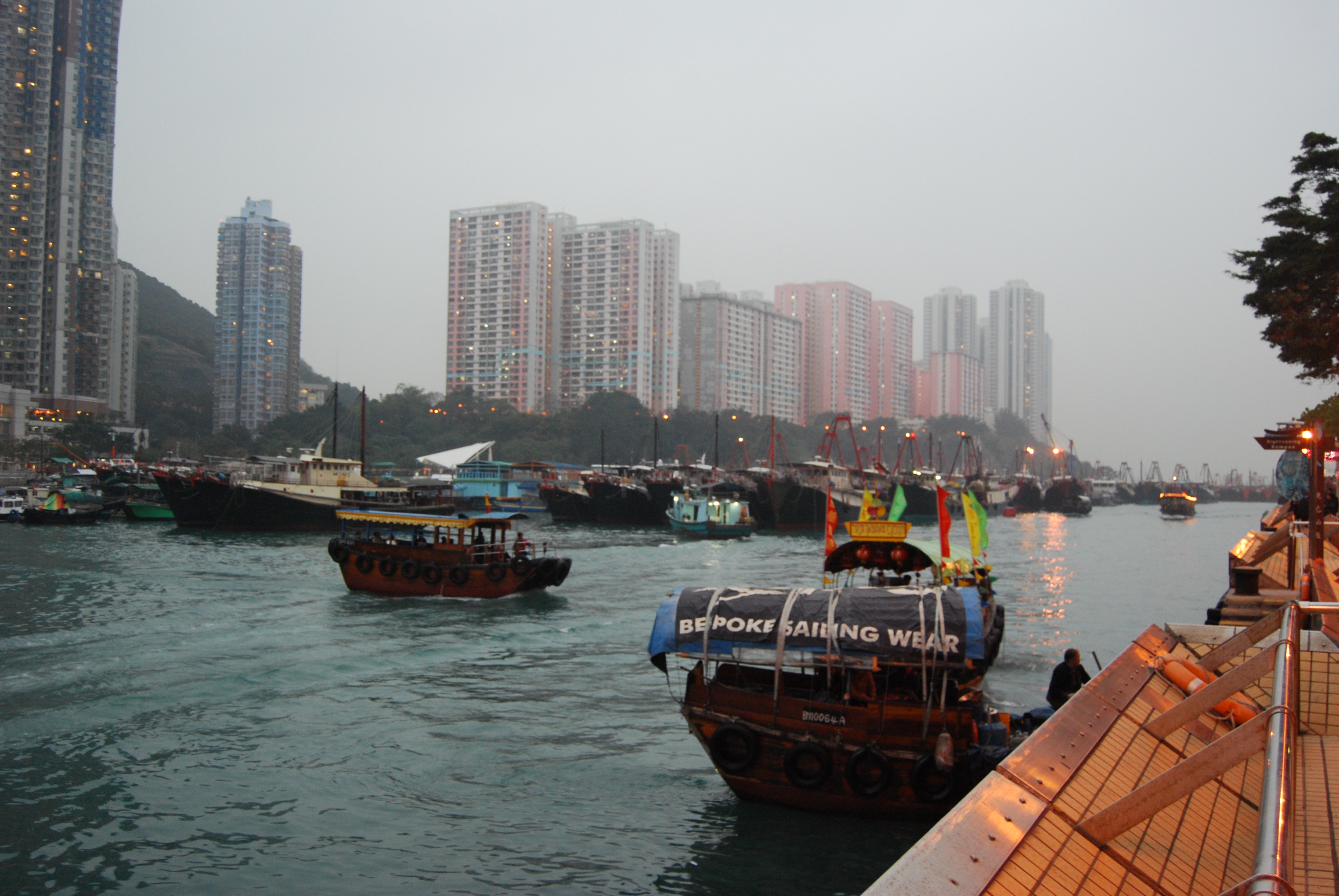 Our excitement was met with a harbor full of junks and fishing boats with people pestering us for about half a mile to ride their sampans, which are actually just little sampan-type boats with motors, no sails, and ugly tarp or plastic covers. They take you on a tour up and around the harbor or typhoon shelter to see the boats and the boat-house community.