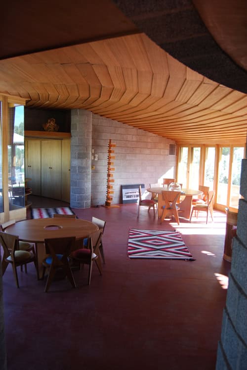 The painted, molded tin roofs are fantastic and reflect a refined use of dentils like Wright used at his winter camp up the road to reflect the desert surroundings. Wrapping around the main silo is a ramp that leads to the rooftop deck with spectacular views of the Valley all around and is the perfect spot for watching stunning Arizona sunsets.