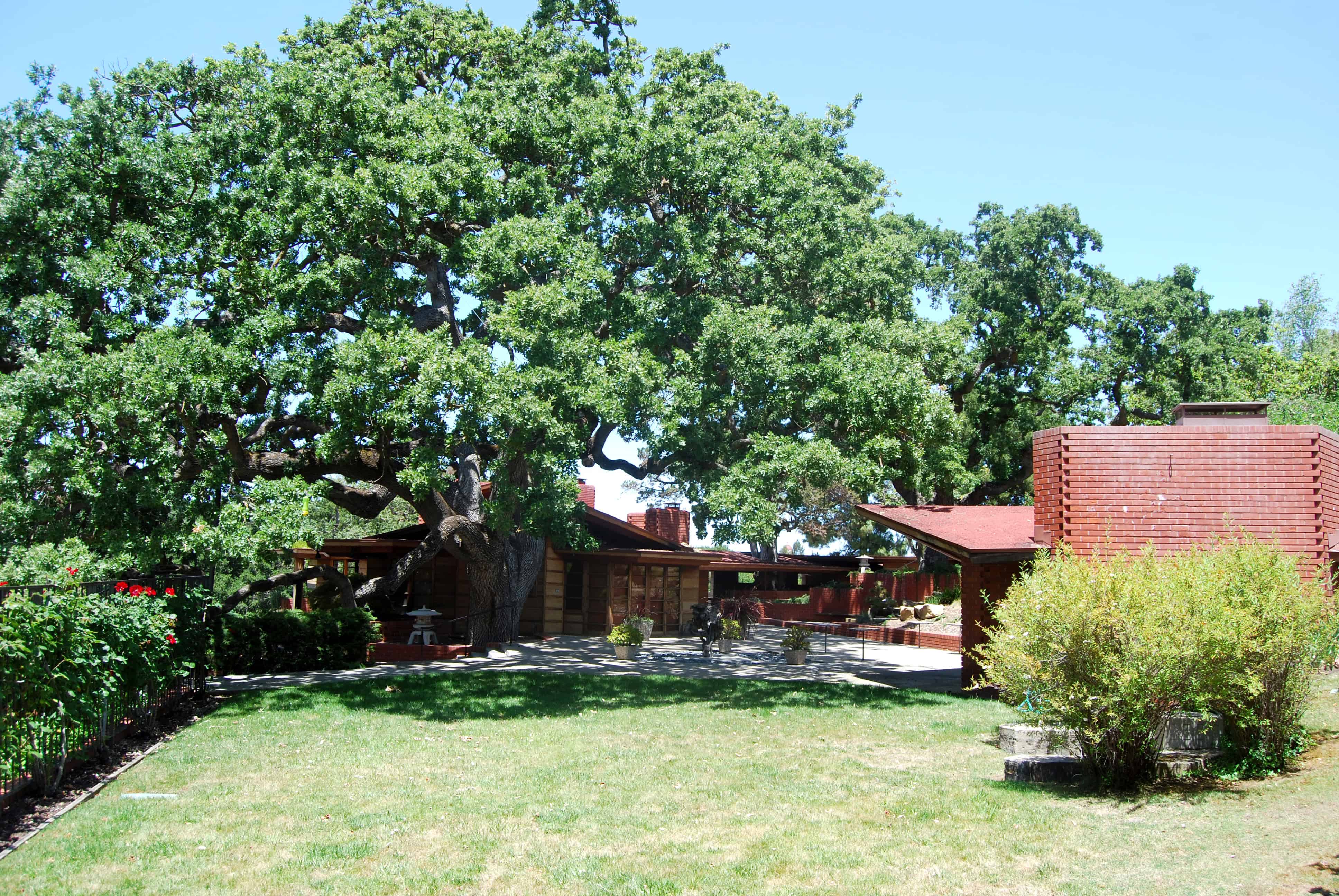 Keeping in sync with his organic architecture philosophy, Wright designed the home around the mature oak trees already on the property, one of them is now 80 inches in diameter, and he built with the lay of the land being on the side of a hill.