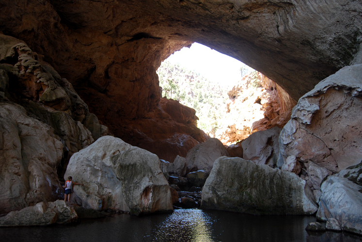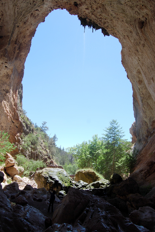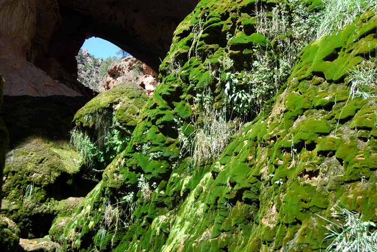 The geologic feature is like a cave, the sides of which have been ripped off by a giant creating a breezeway sheltering an oasis in the high Arizona desert. When I arrived at the state park, I expected to see the bridge in the side of a cliff or at least prominently visible. However, access to the park is down a steep winding road with the same high desert scrub on either side. At no point can you see the bridge or have any idea that it is there.