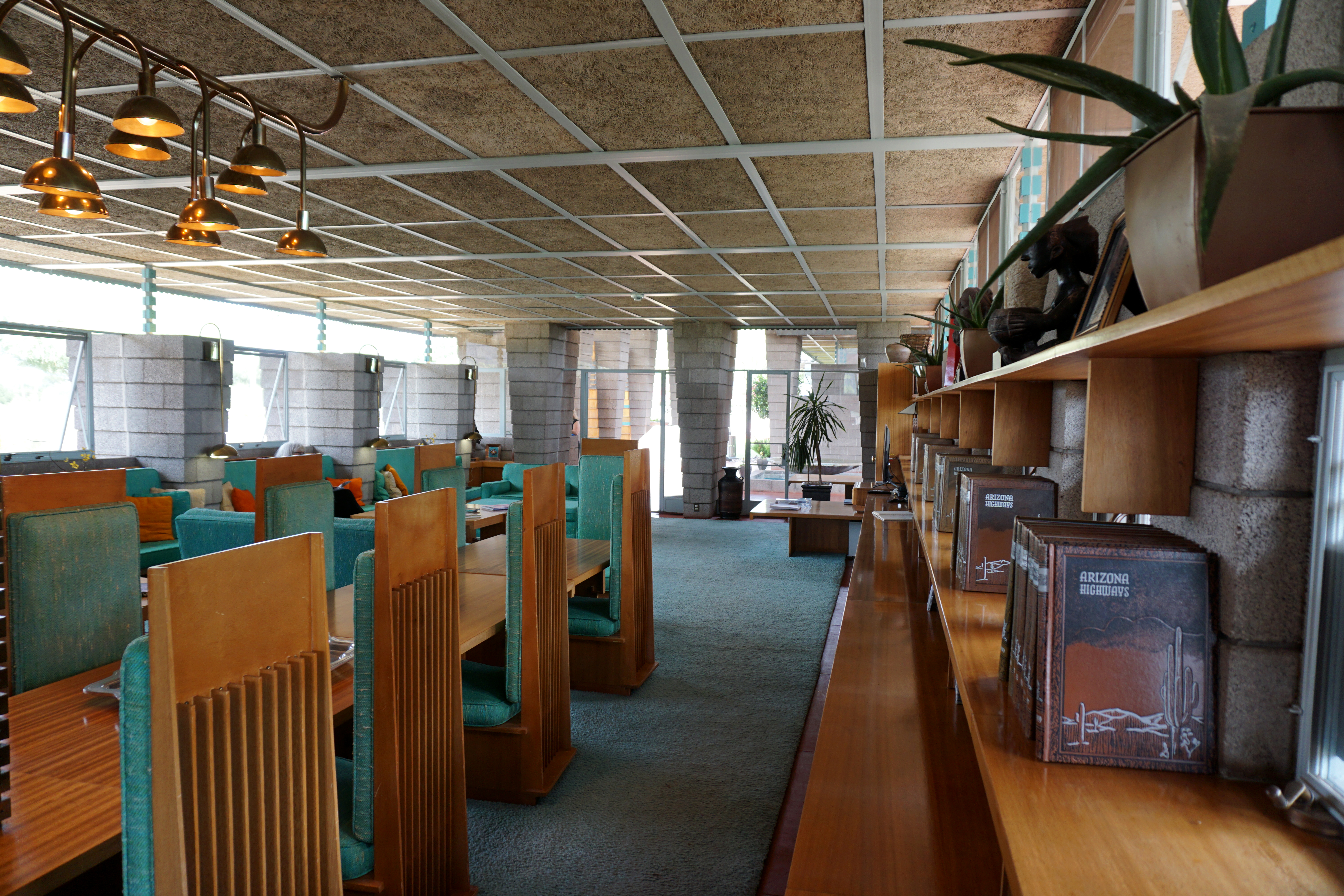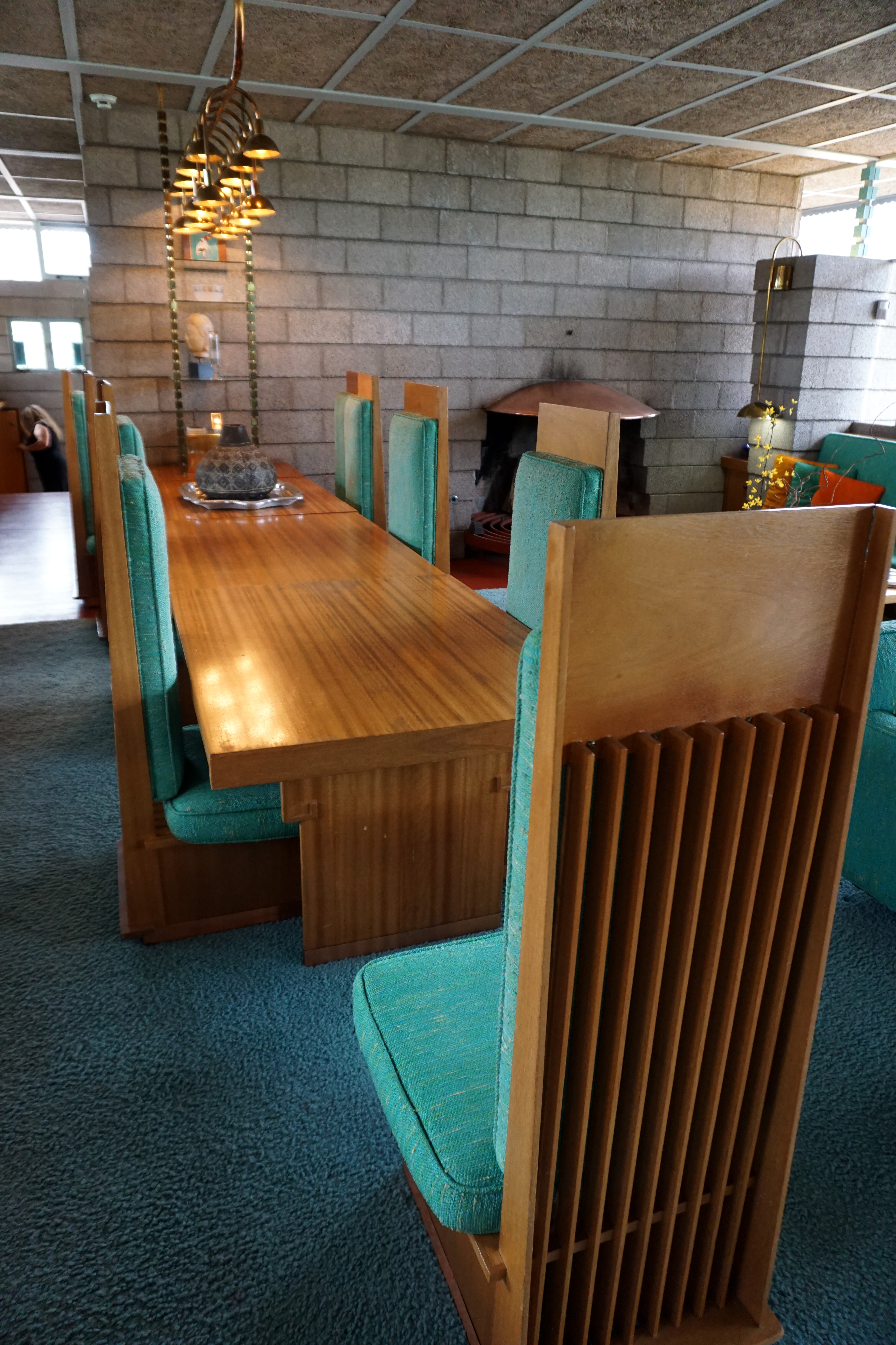 At the other side of the atrium is the living spaces of the house, a large open living room with integrated dining area followed by the kitchen. The living room has beautifully designed furnishings with lots of seating. Along both long walls are bookcases and shelves with the homes collection of art and Arizona Highways magazines. The dining furniture is especially Wrightian with the high-backed vertical chairs.