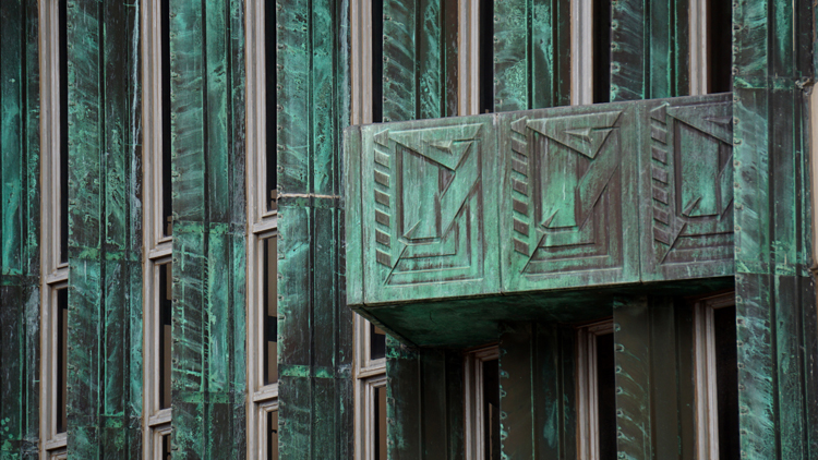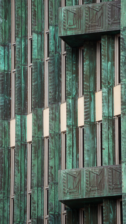 Those views are even better when most of the exterior walls are windows. Around the exterior of the building are copper louvers that act to shade and provide privacy. Most are fixed, but these shutters toward the top of the tower were designed to move as needed.
