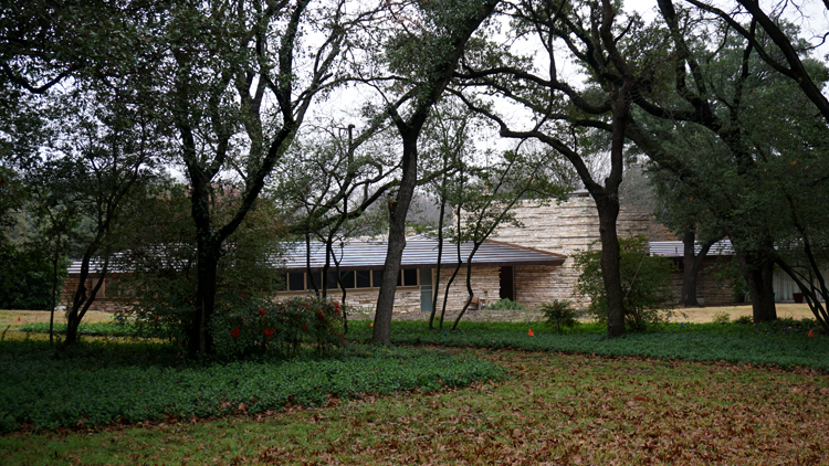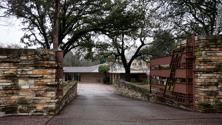 Wright’s other work in Dallas is a private home just north of Dallas Love Field Airport. It is a spectacular, sprawling house set back from the road. It appears to be similar to Wingspread in Wisconsin with wings extending off of a round or hexagonal central room. I say this because of the roof in the middle having the round kiva like roof, sort of like the meeting room at the AZ Biltmore attributed to him.