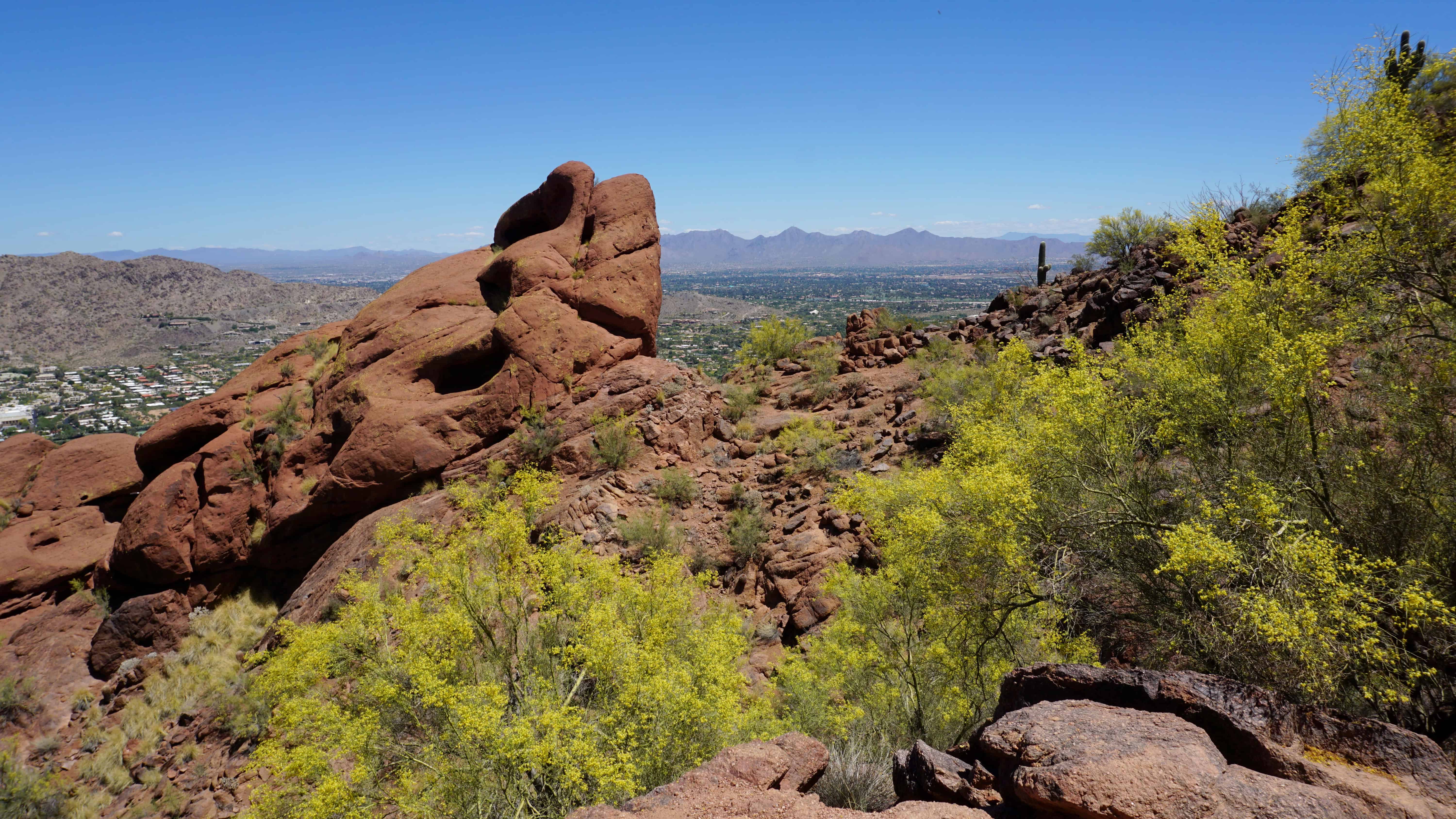 This end of the mountain is dominated by lush desert landscapes of ocotillo, saguaros, and palo verde trees in the shade of the sandstone formations that comprise the camel’s head. This includes the wonderful formation call the praying monk. There is also a shorter, much less difficult trail in this area that doesn’t take you to the top.