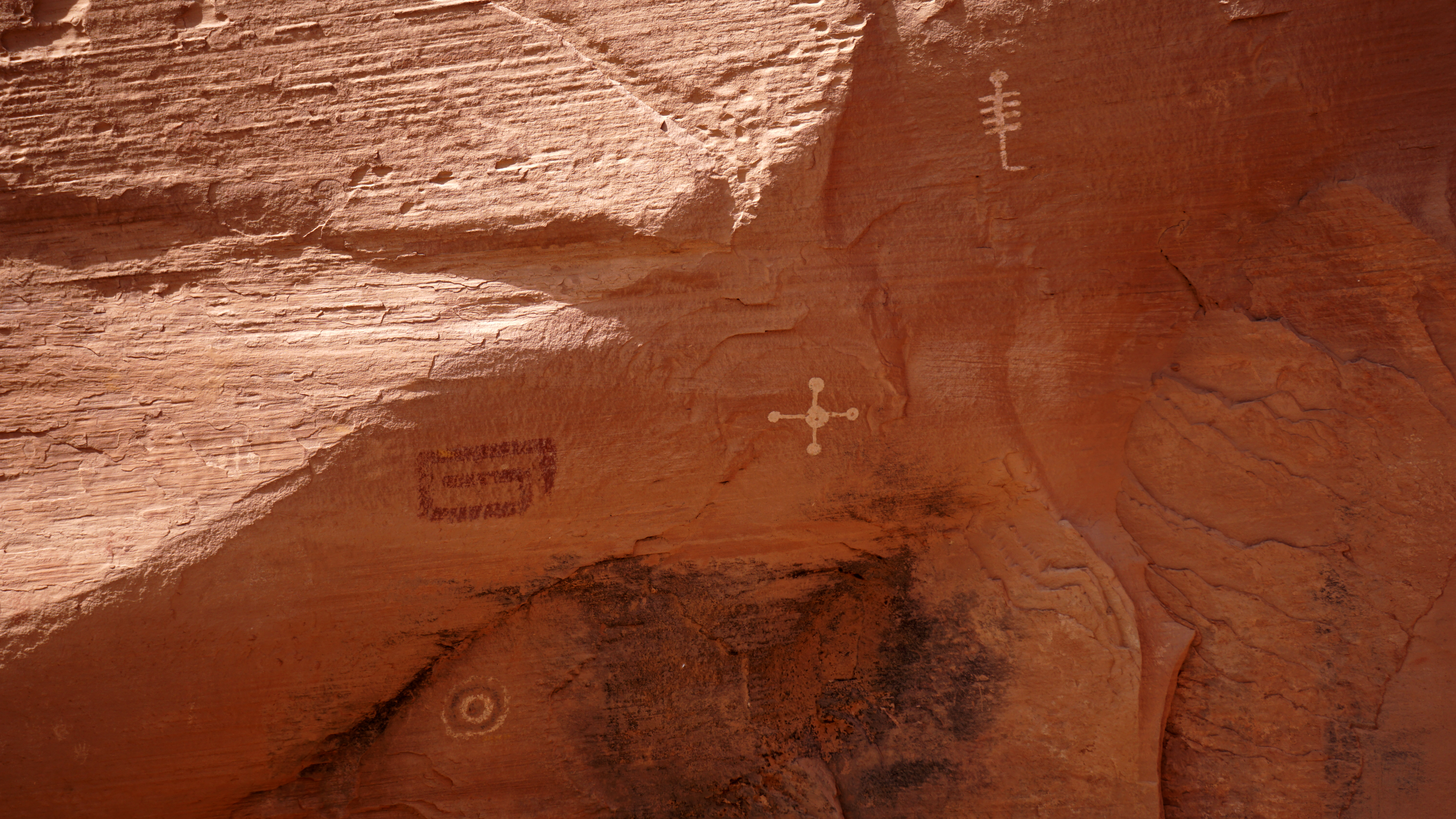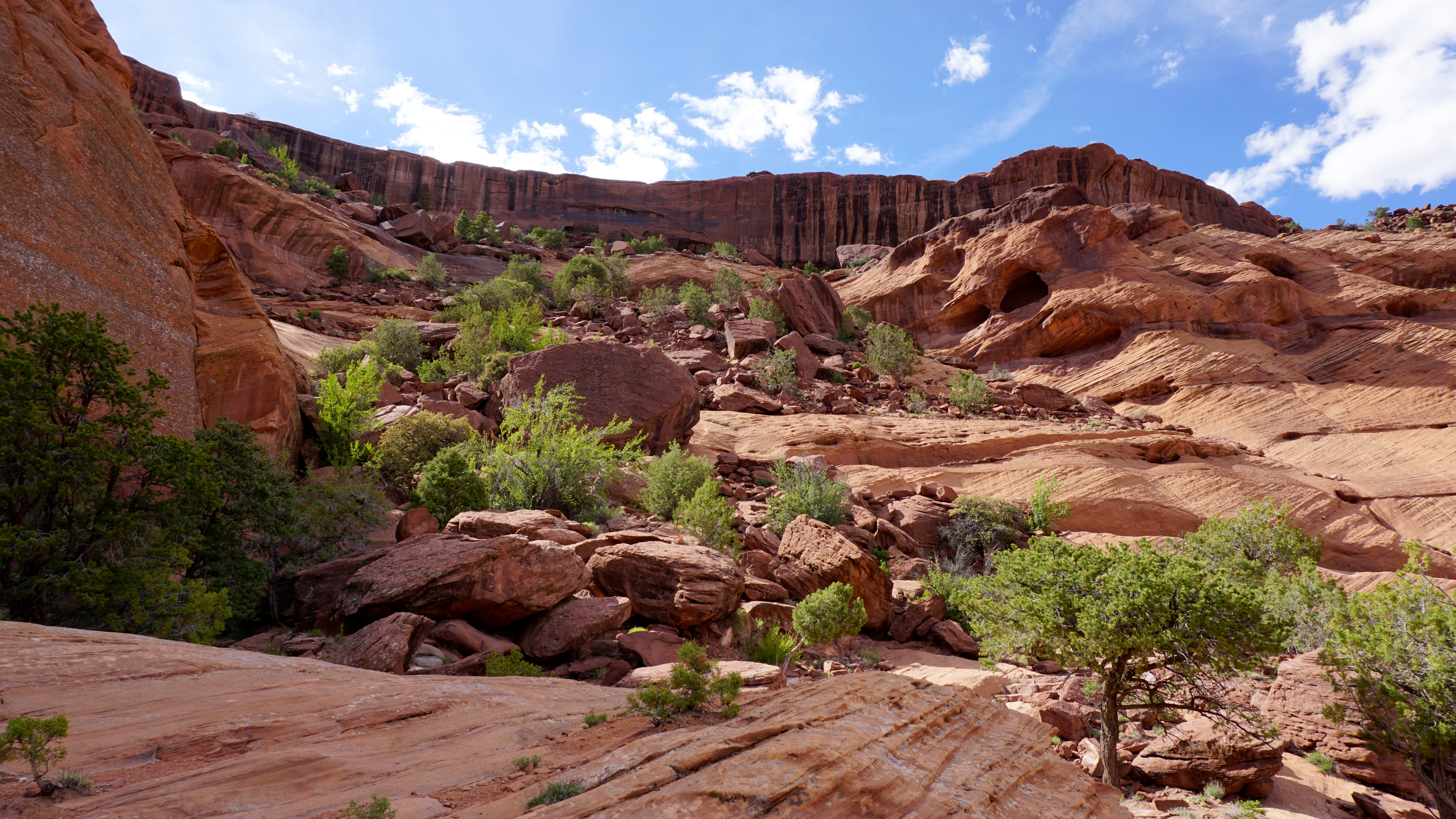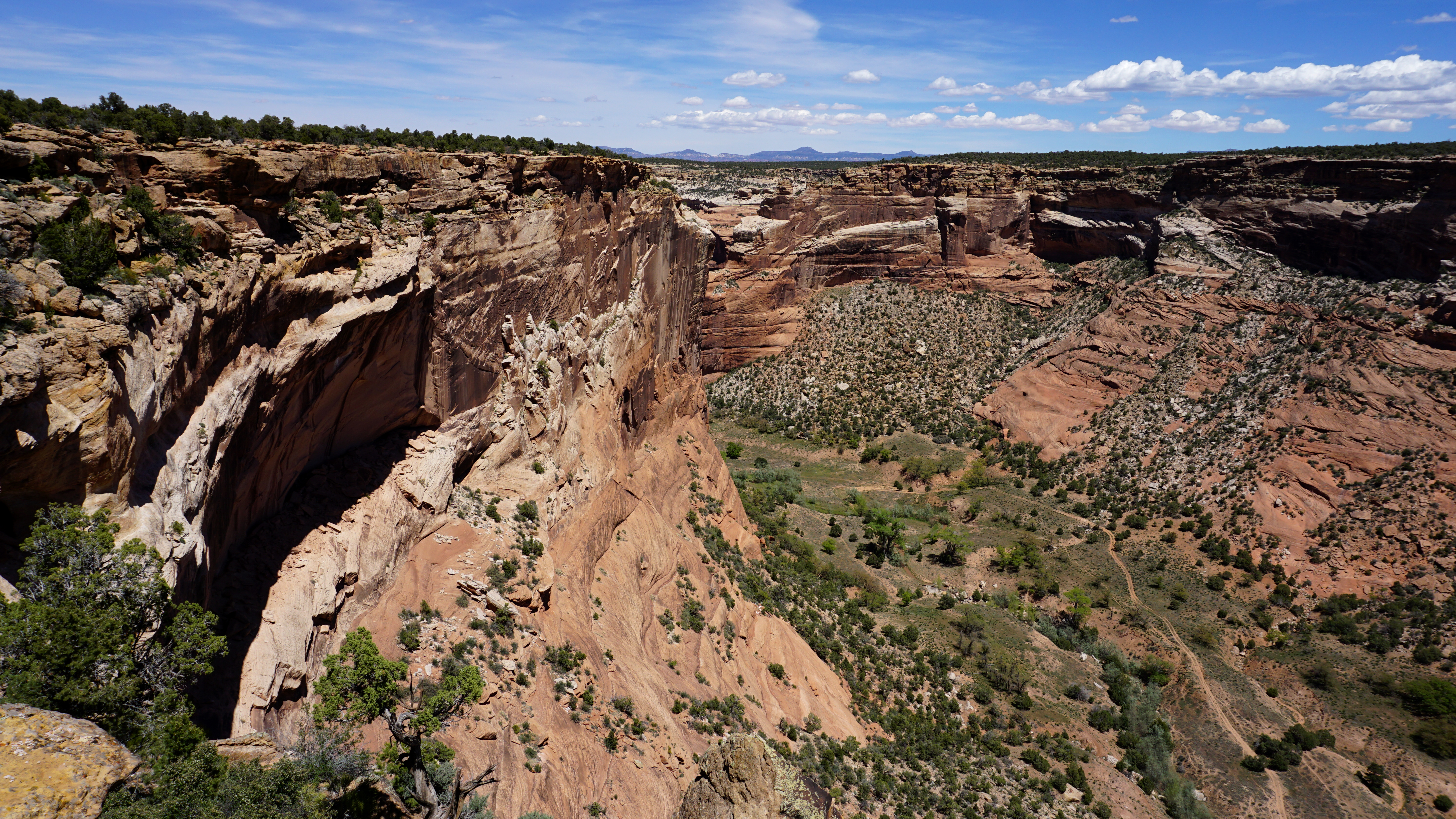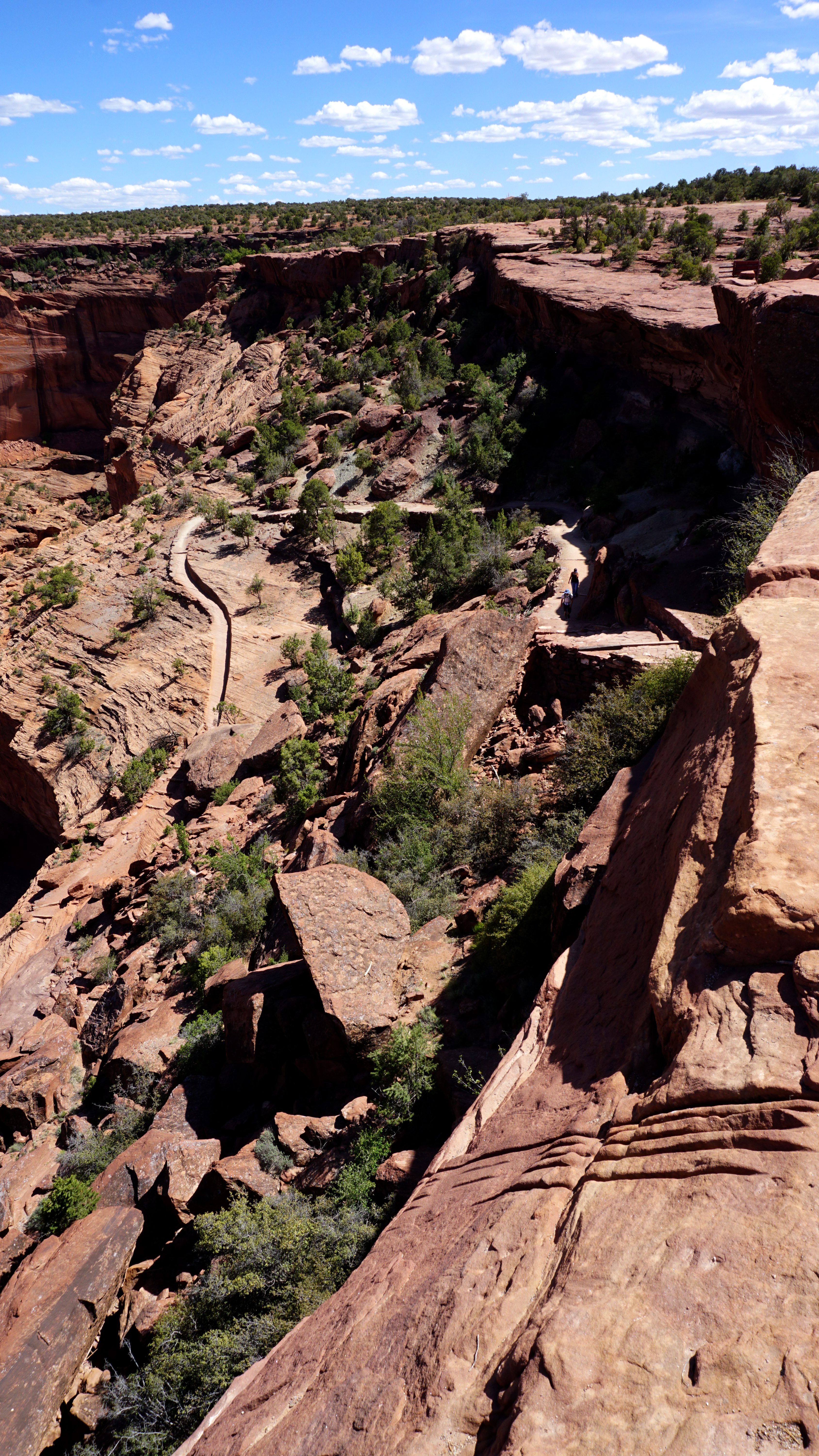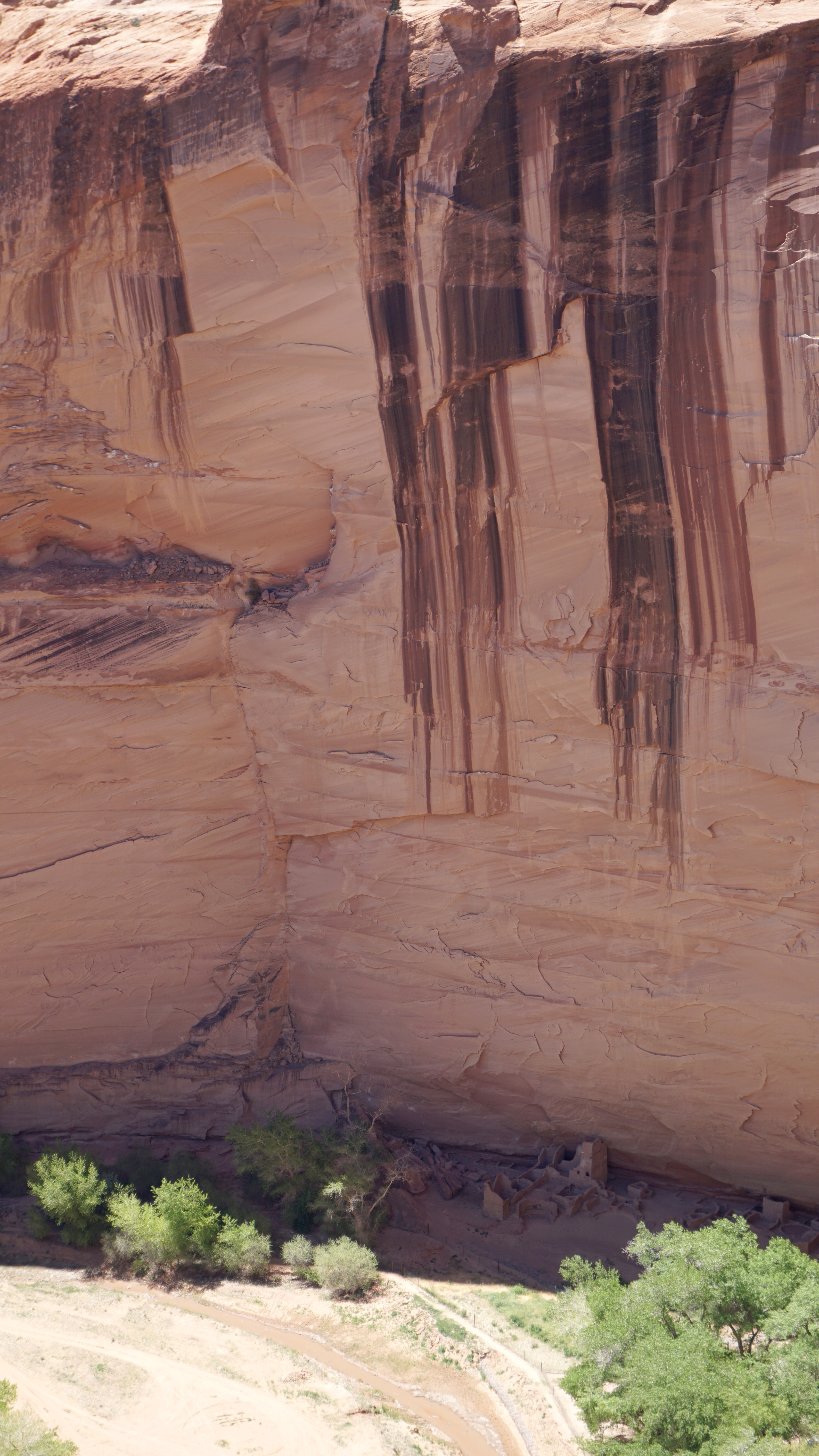Seven overlooks line this rim drive. I started at the White House Overlook so I could take the one public trail down to the ruin before it got too late. The trail takes you down a nearly 1,000 foot cliff with the trail carved right into the rock at times. It leads down to the canyon floor and across the creek to the ruins at the base of the far wall.