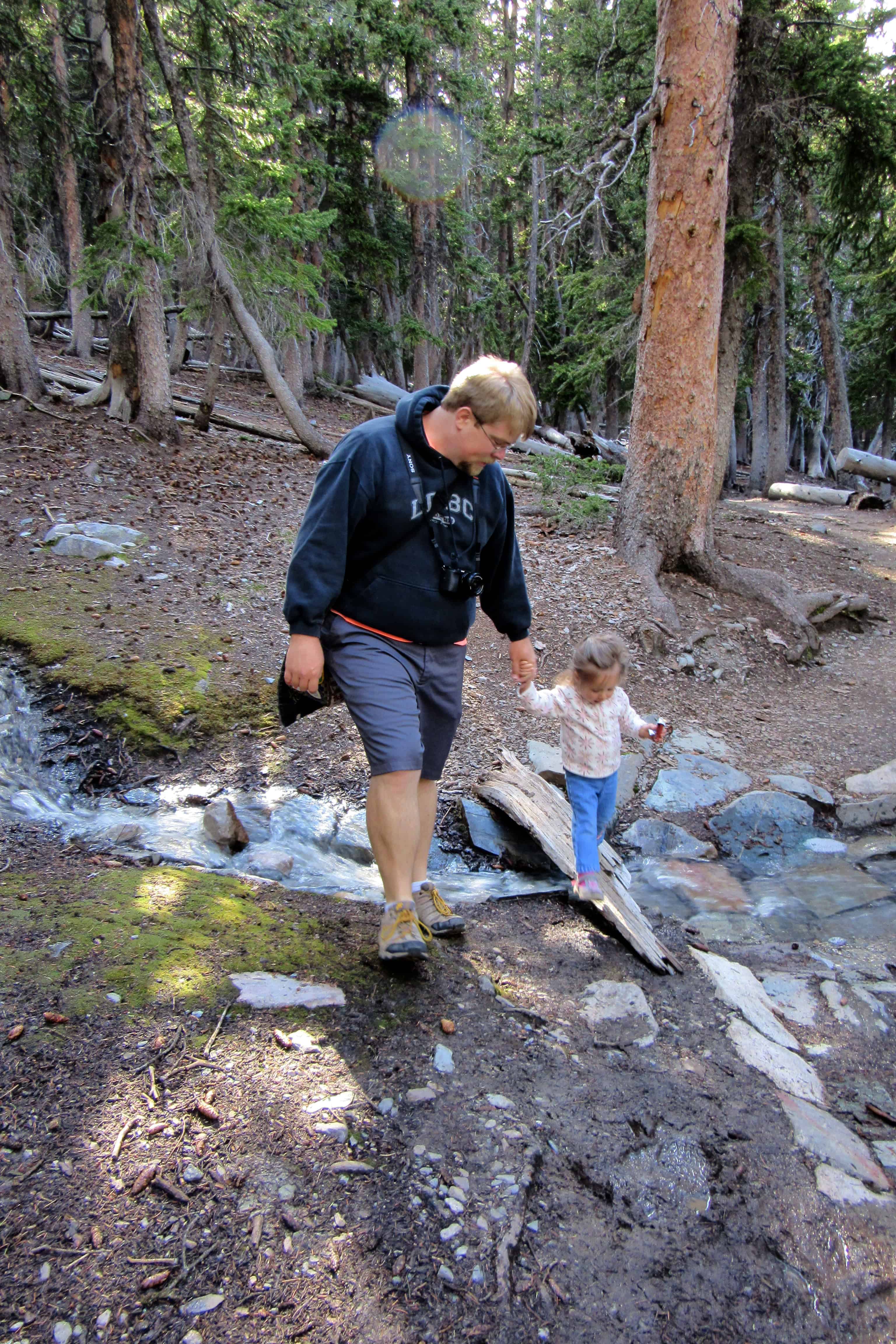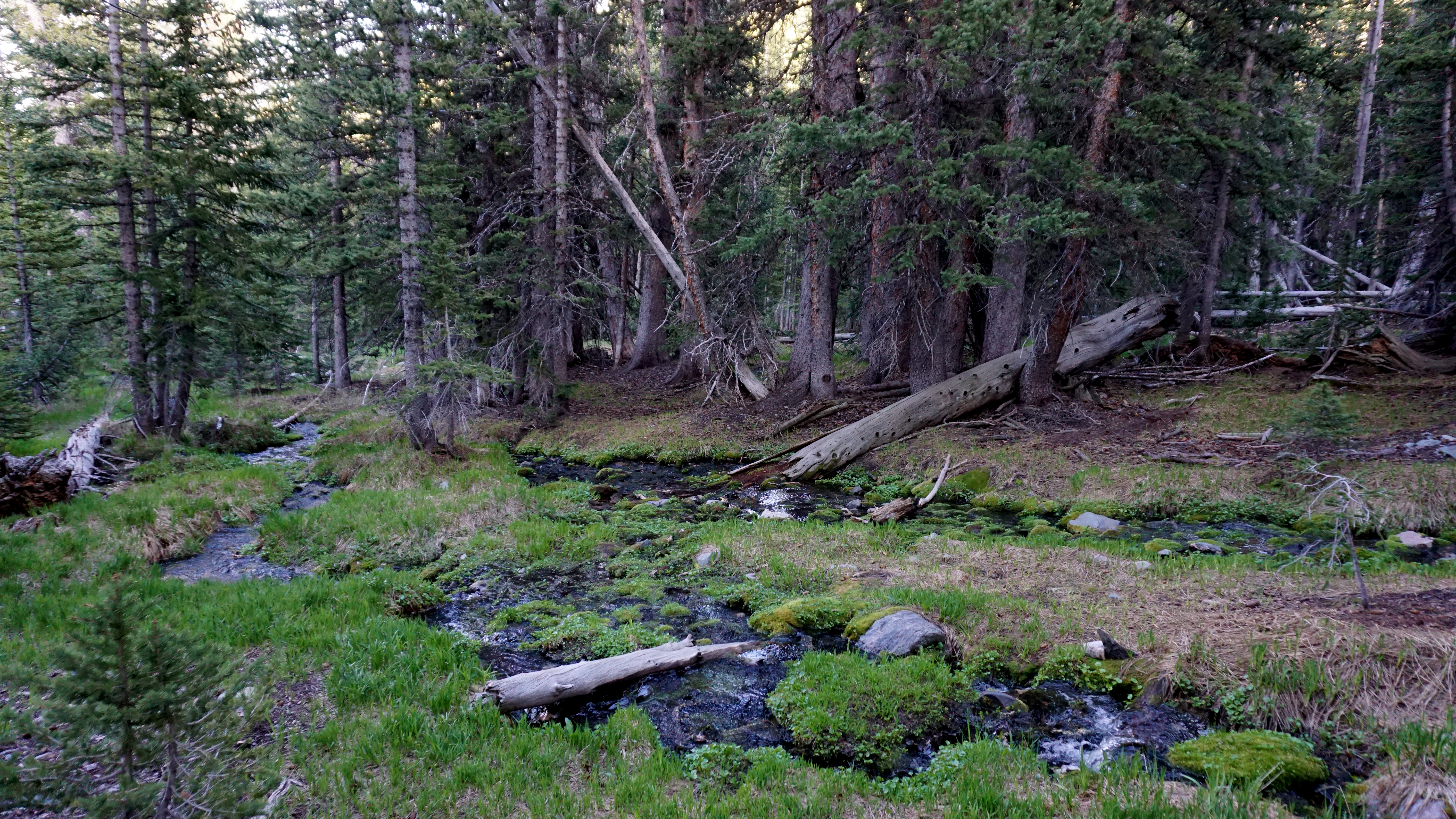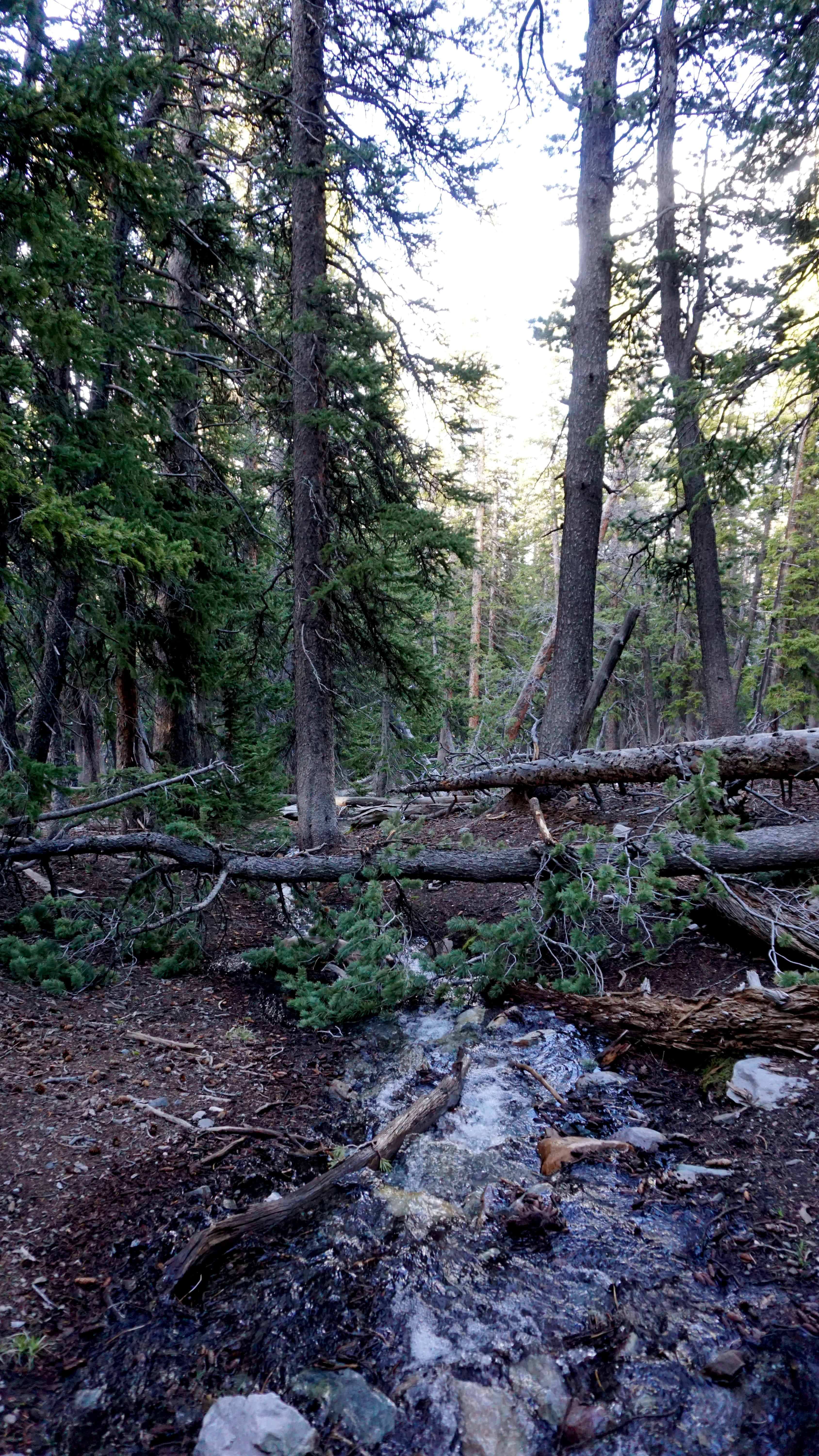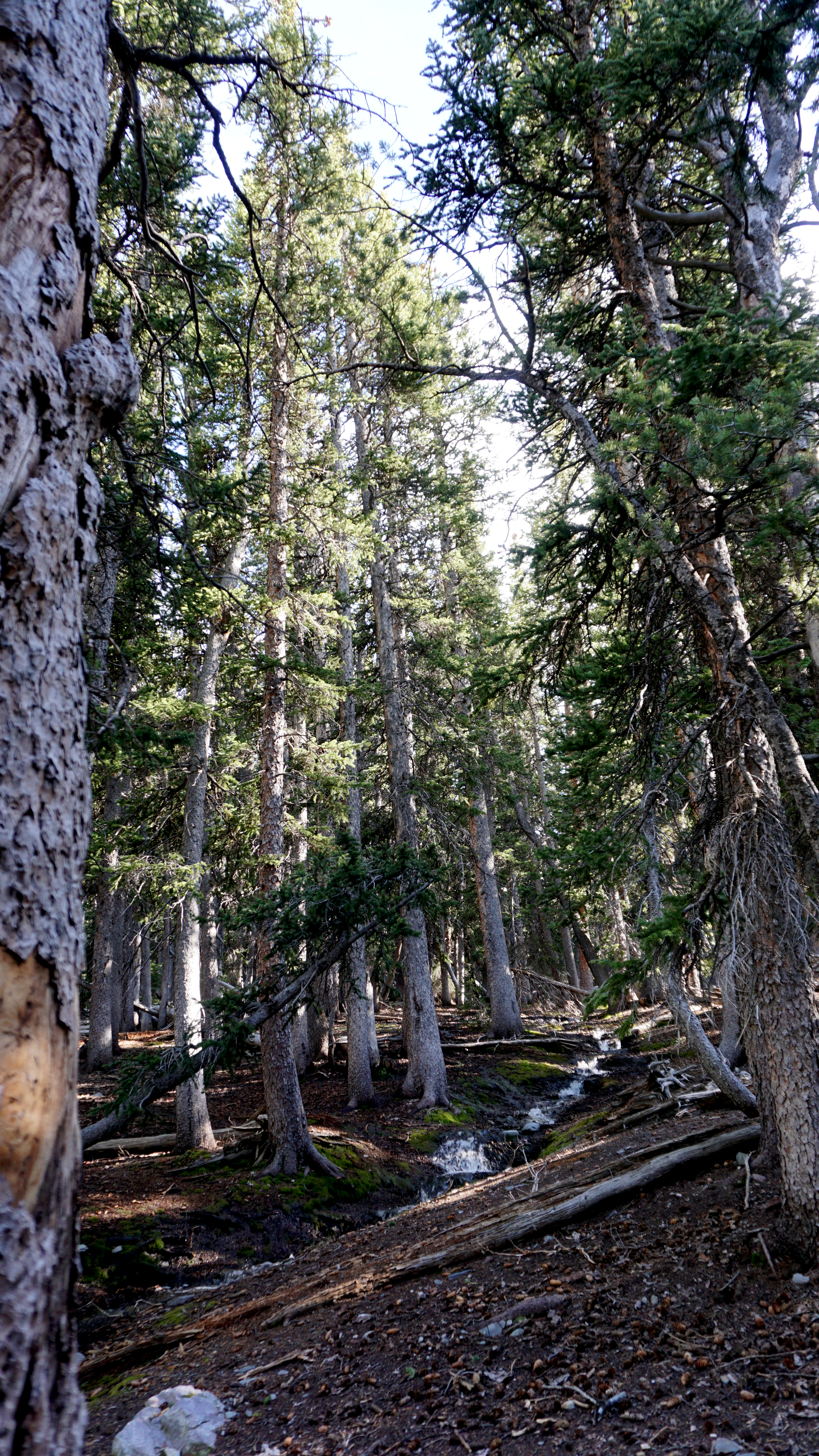The trail leads through a beautiful forest of pines, spruces and aspens with streams crisscrossing every direction down from the alpine lakes fed by glacier runoff. These streams cross the trail at several points, trickle through tree trunks and splash over rocks. There is music to their dance down the hill where they eventually meet up with larger creeks heading into the valley below.