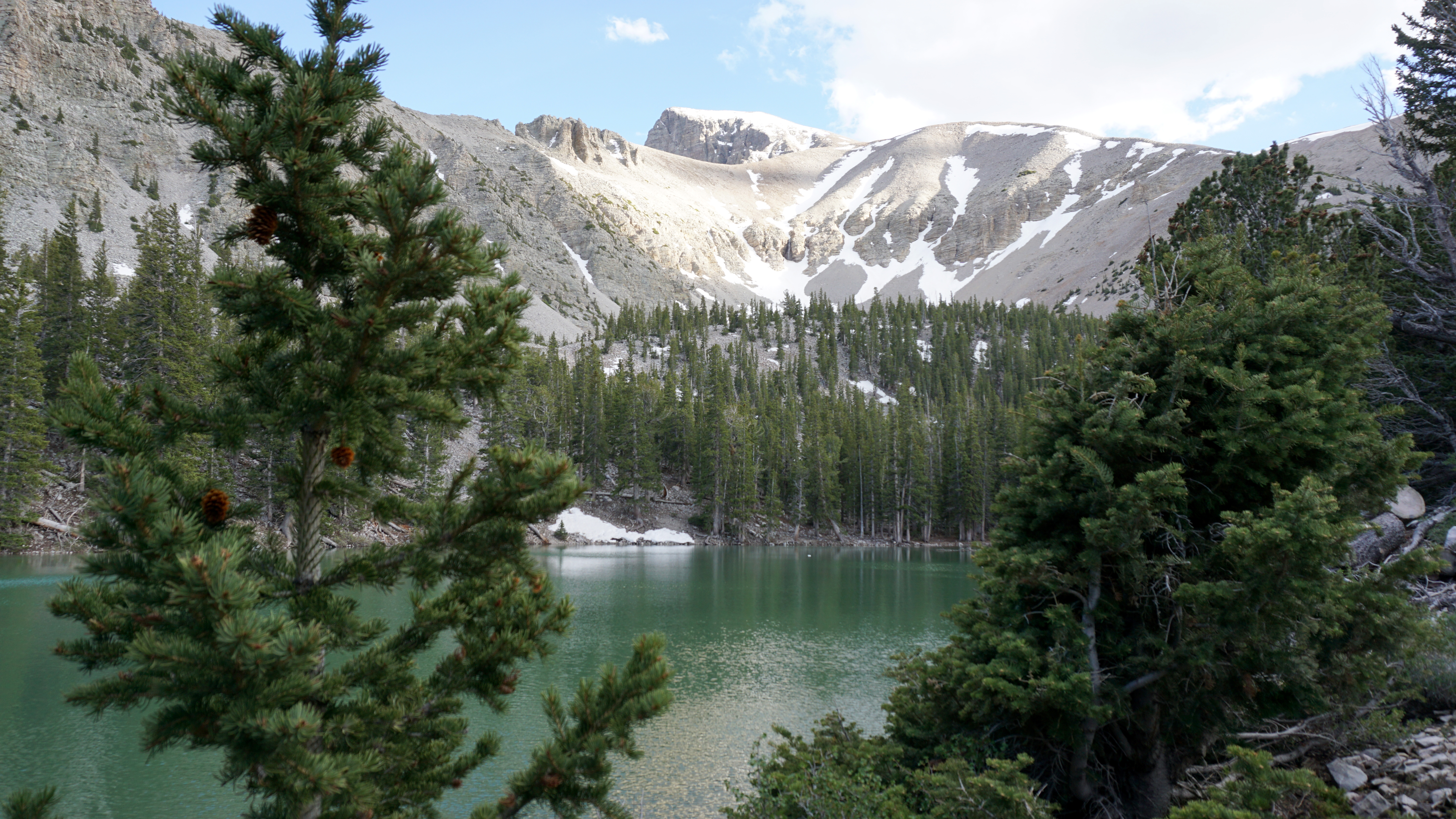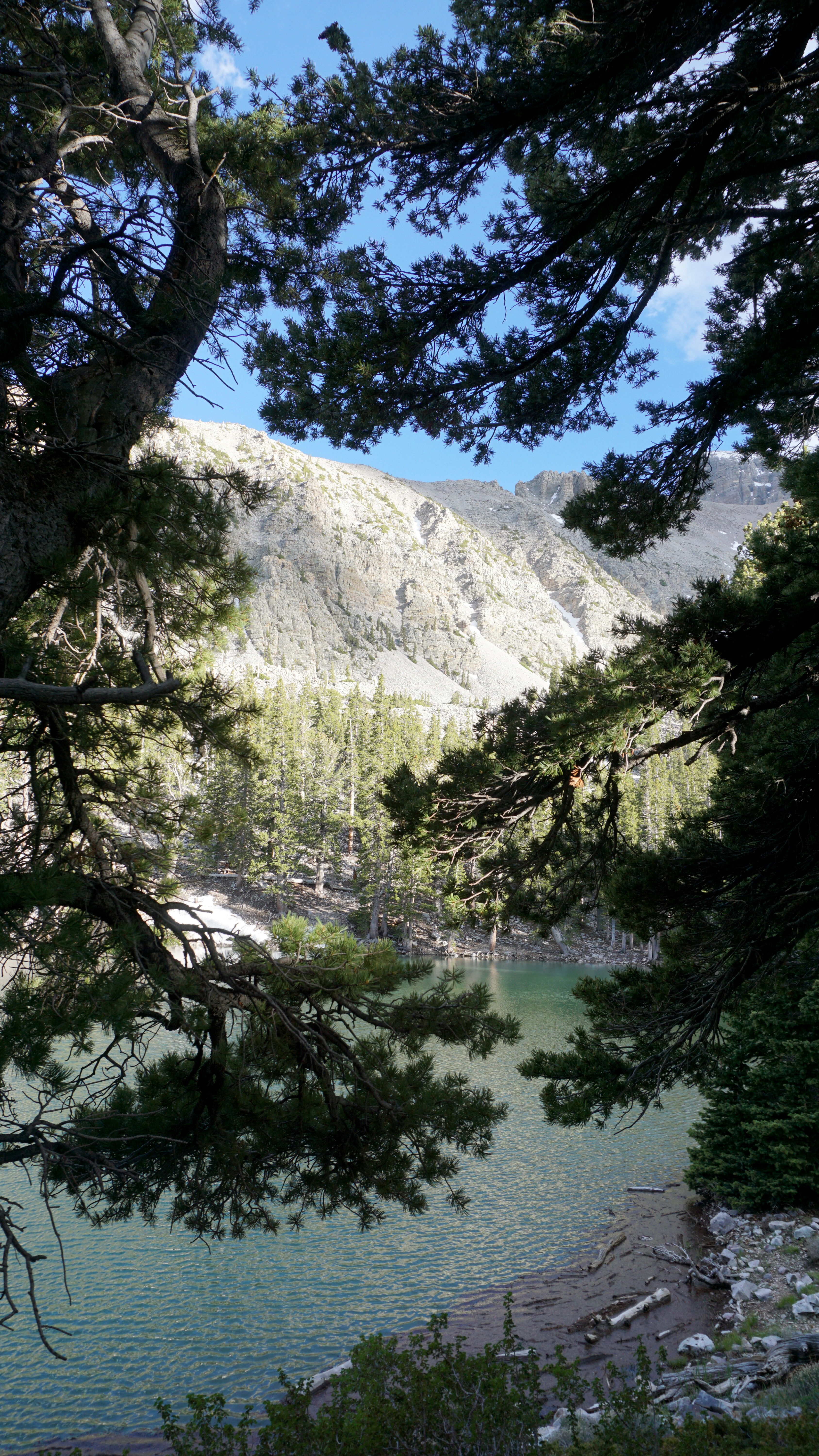 Had I been alone or with someone able to keep going (not two years old), I would have continued up the trail after the grove to Nevada’s only glacier, but that adventure will have to wait for now. On the way down, I did take a jaunt down a side trail to Teresa Lake, one of the glacier-fed alpine lakes off this trail. This lake is the source of many of the runoff streams racing down the mountain over the trail.