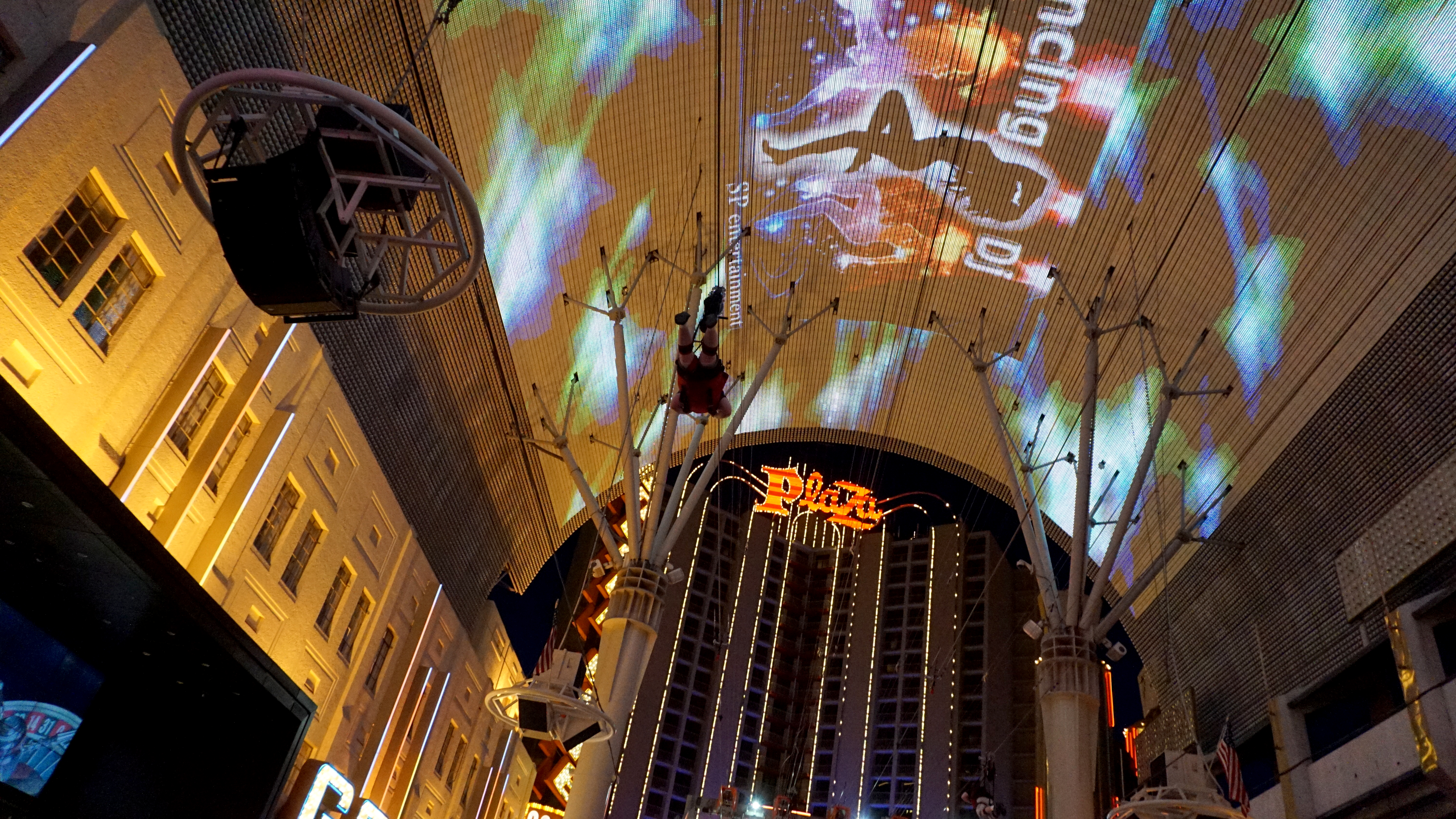Slotzilla’s Zoomline starts at ten stories over the street just under the LED roof and goes four blocks, the full length of the Fremont Street Experience. Because of the distance riders can go up to 35 mph. The Zoomline also sends riders on their bellies, whereas, the normal zip line that only goes a third of the distance is a standard sitting position.