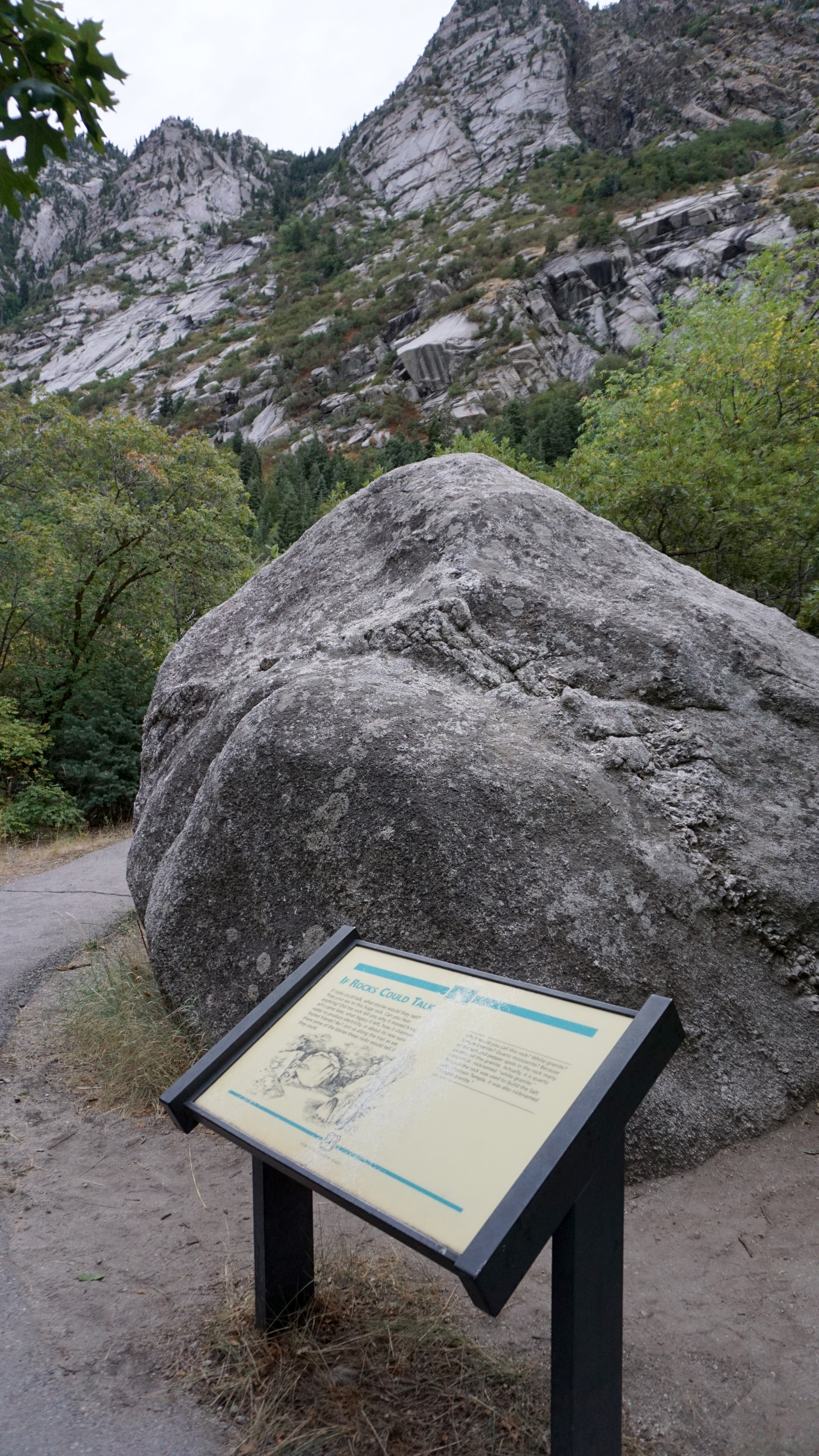 Building a building to last the ages, they turned to the surrounding mountains for stone. They began quarrying stone from giant boulders at the mouth of Little Cottonwood Canyon. Although it looks like granite the stone is actually quartz monzonite. Lateer, stone from this site was used for the Utah State Capitol Building, This is the Place Monument, and the LDS Conference Center.
