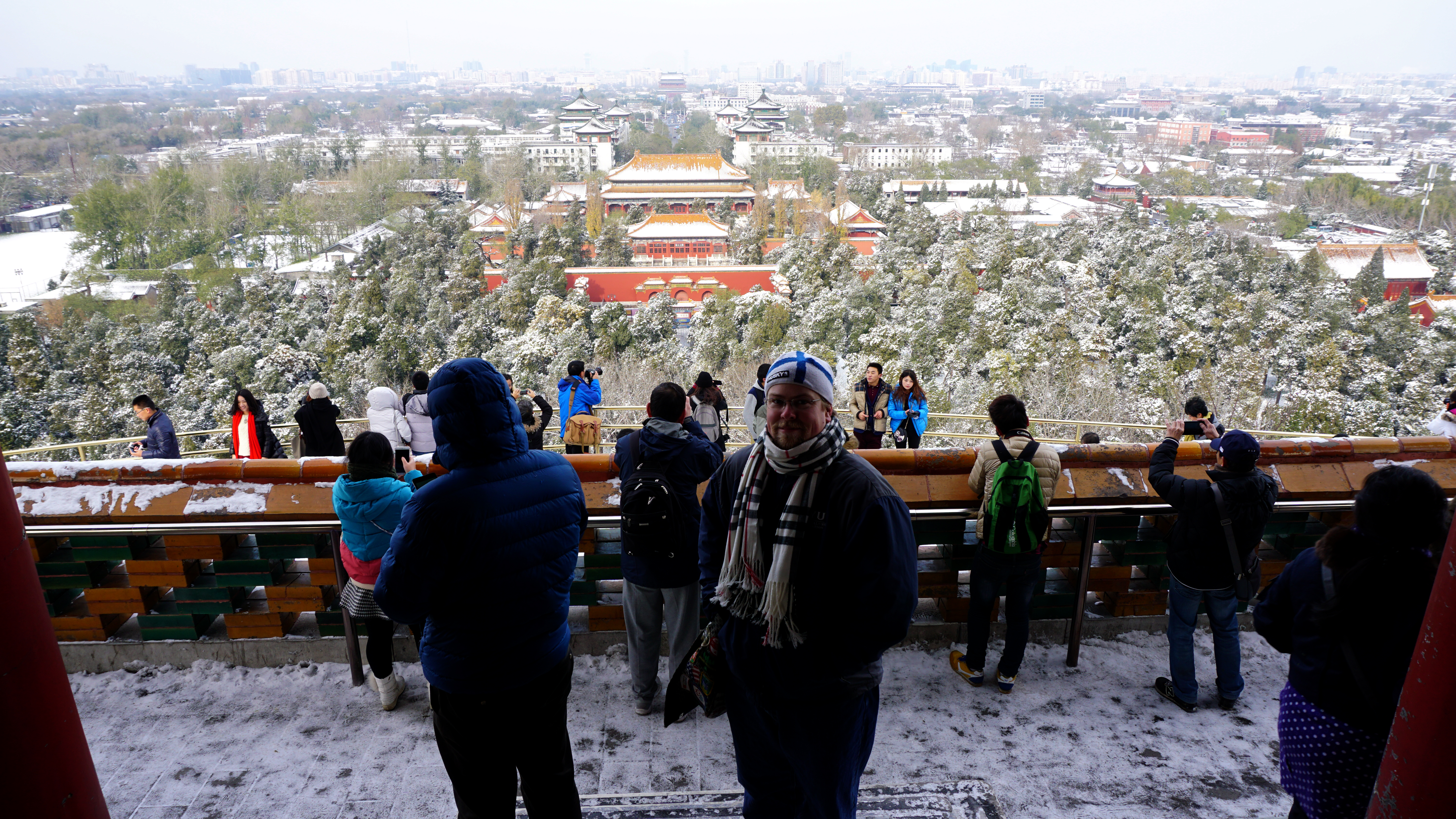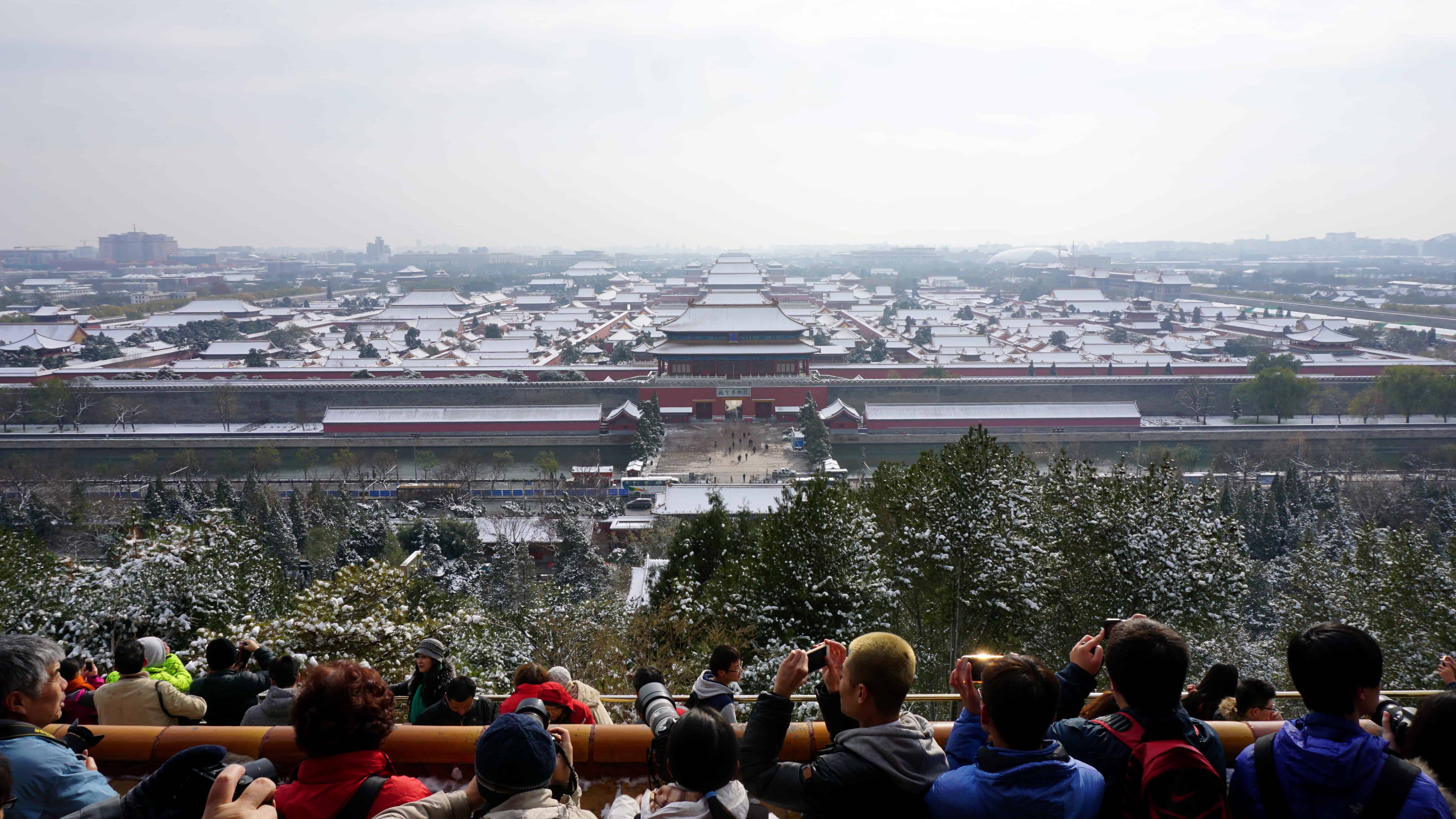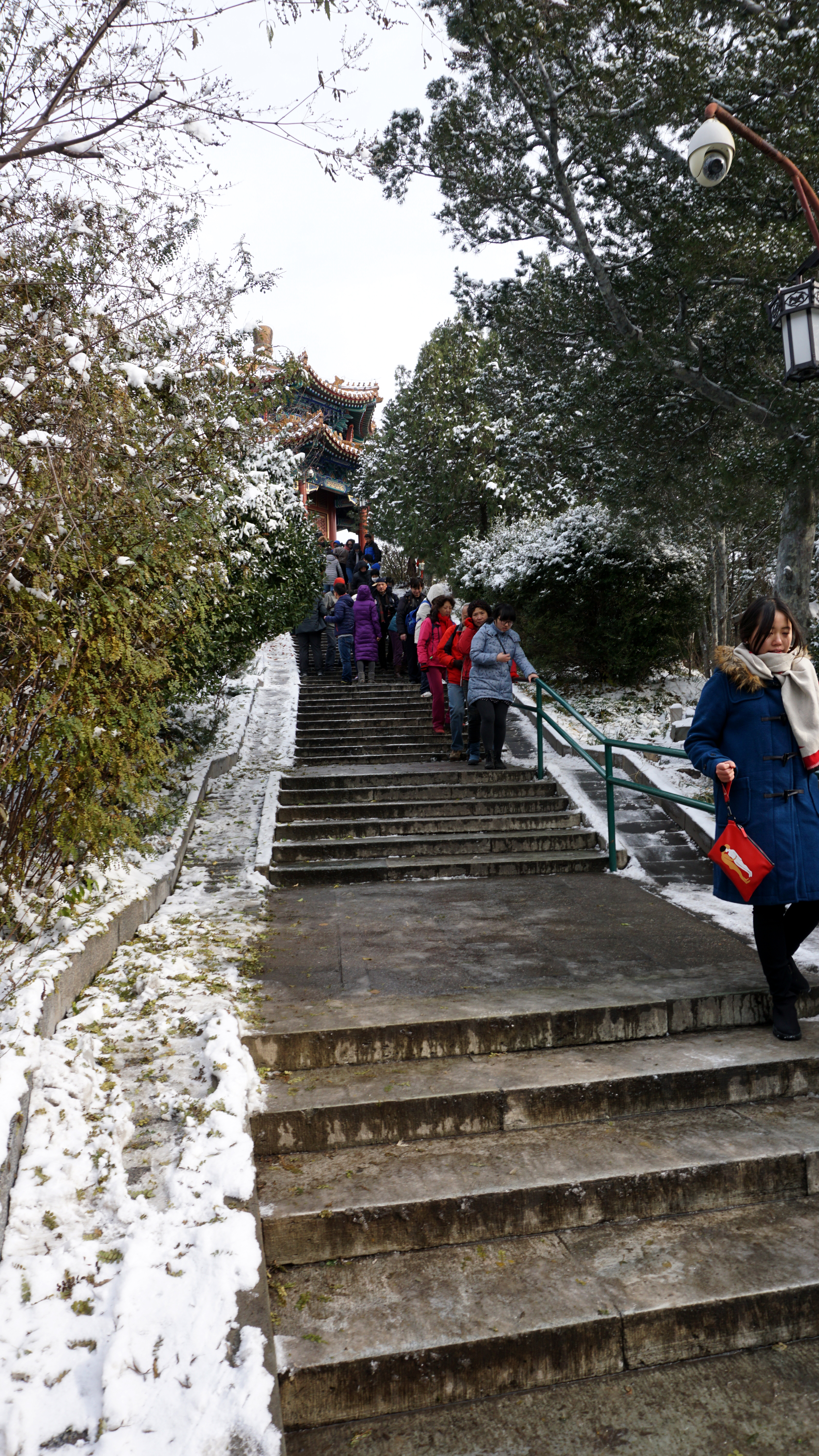 It may have been cold, but it was clear and the fresh snow blanketed everything. Trees lost leaves by the hundreds all at once and other trees retained their green with the beautiful cover of snow. Before it warmed up again, I took the opportunity to go get some pictures, as did countless others, of Beijing in white, which is a rare sight. My friend and I went to Jingshan Park just behind the Forbidden City. We had 360-degree views of winter wonderland. We braved the freezing wind and icy steps leading up where slow queues of people grasped the handrail as they went up and down. Here are a few pictures from that outing.