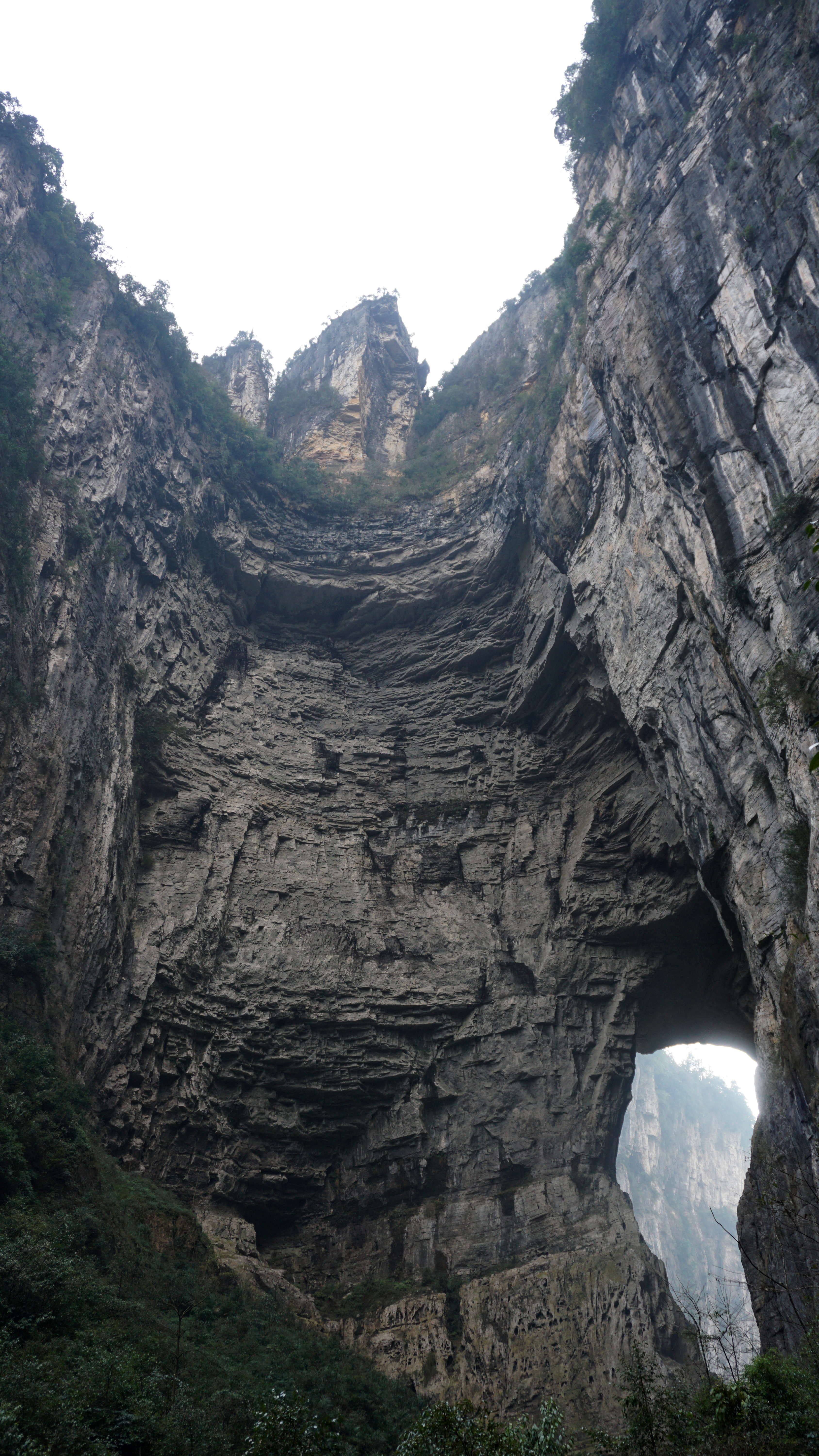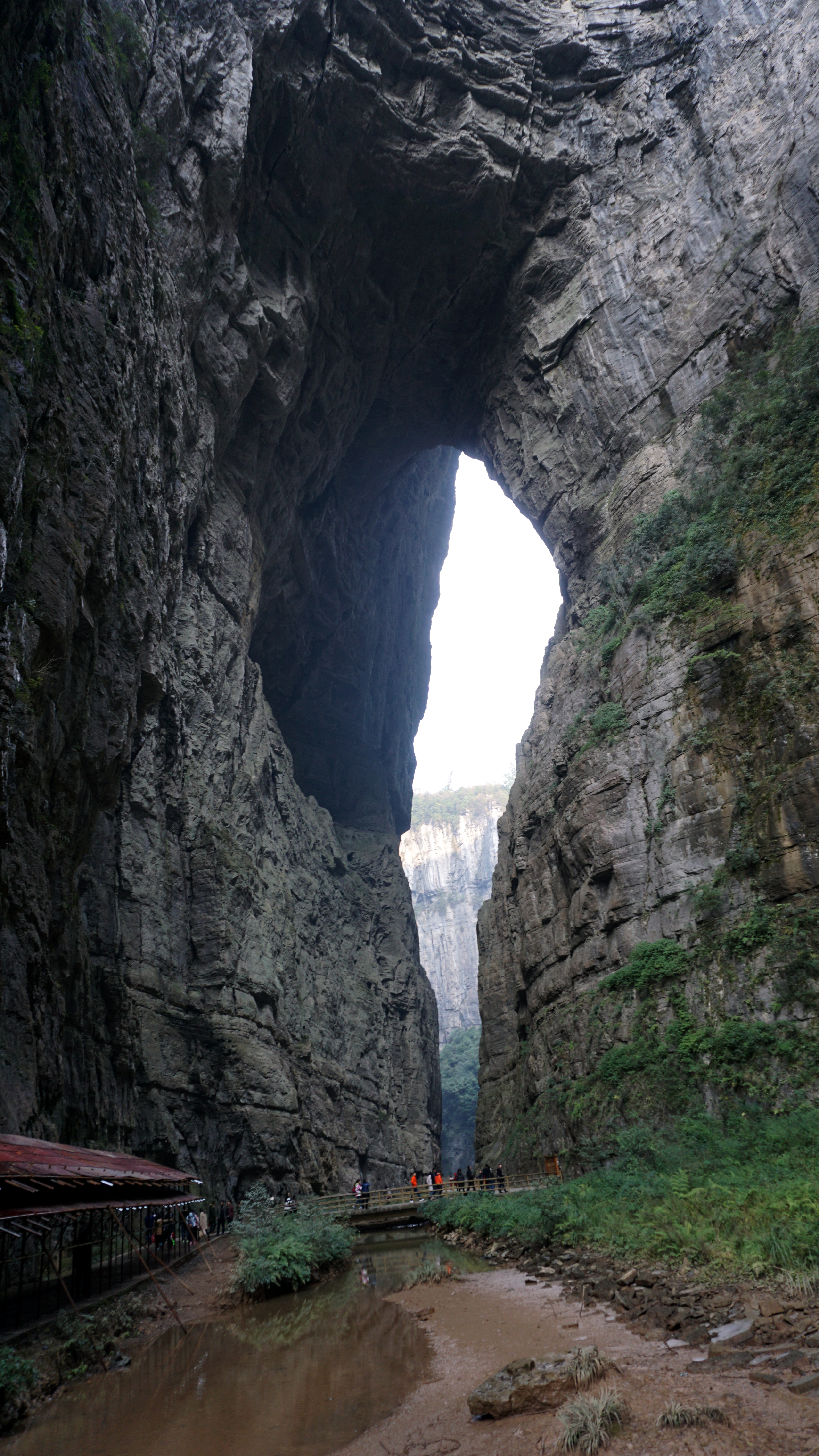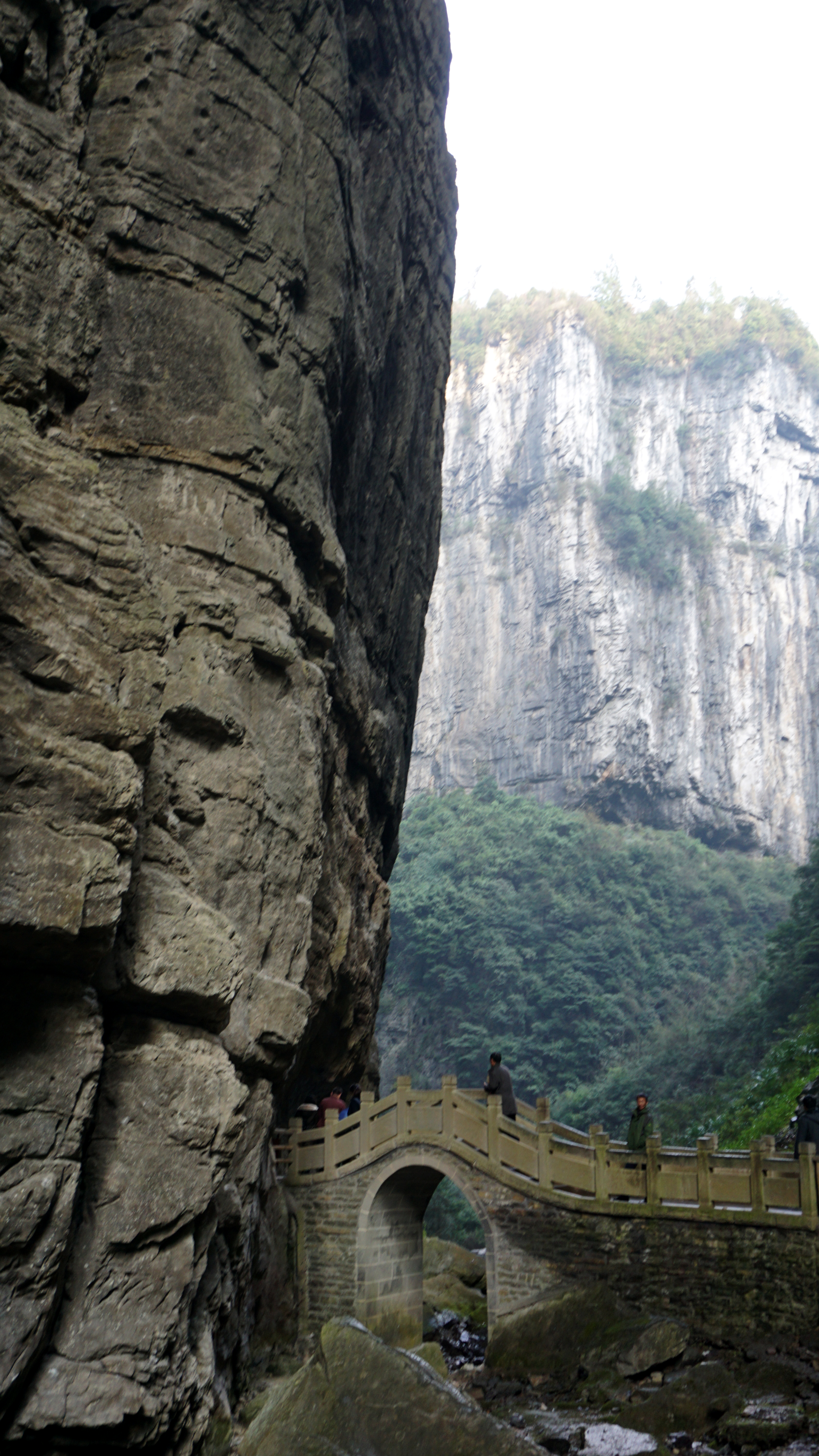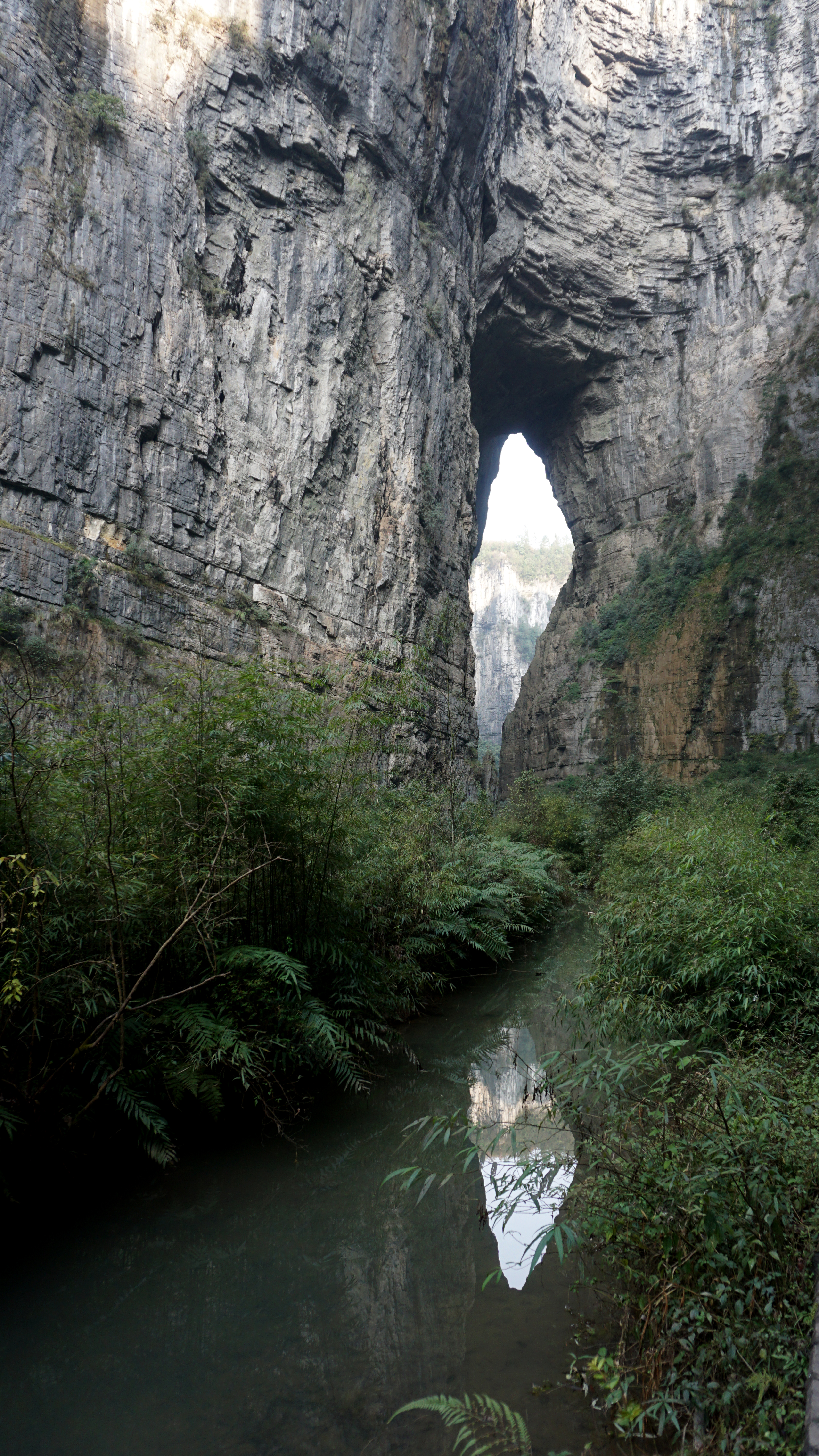 A little stream led us to the next two bridges. We saw Qinglong in the distance from Tianlong, but didn’t get a real sense of grandeur until we got closer. It reflects in the stream and perfectly frames the scenery behind it. A sign under the bridge states that it is the tallest and thickest natural bridge in the world. I’m not sure if that’s true, but it is the biggest I’ve ever seen. Water droplets and mist trail down from this giant’s doorway creating an almost mystical experience.