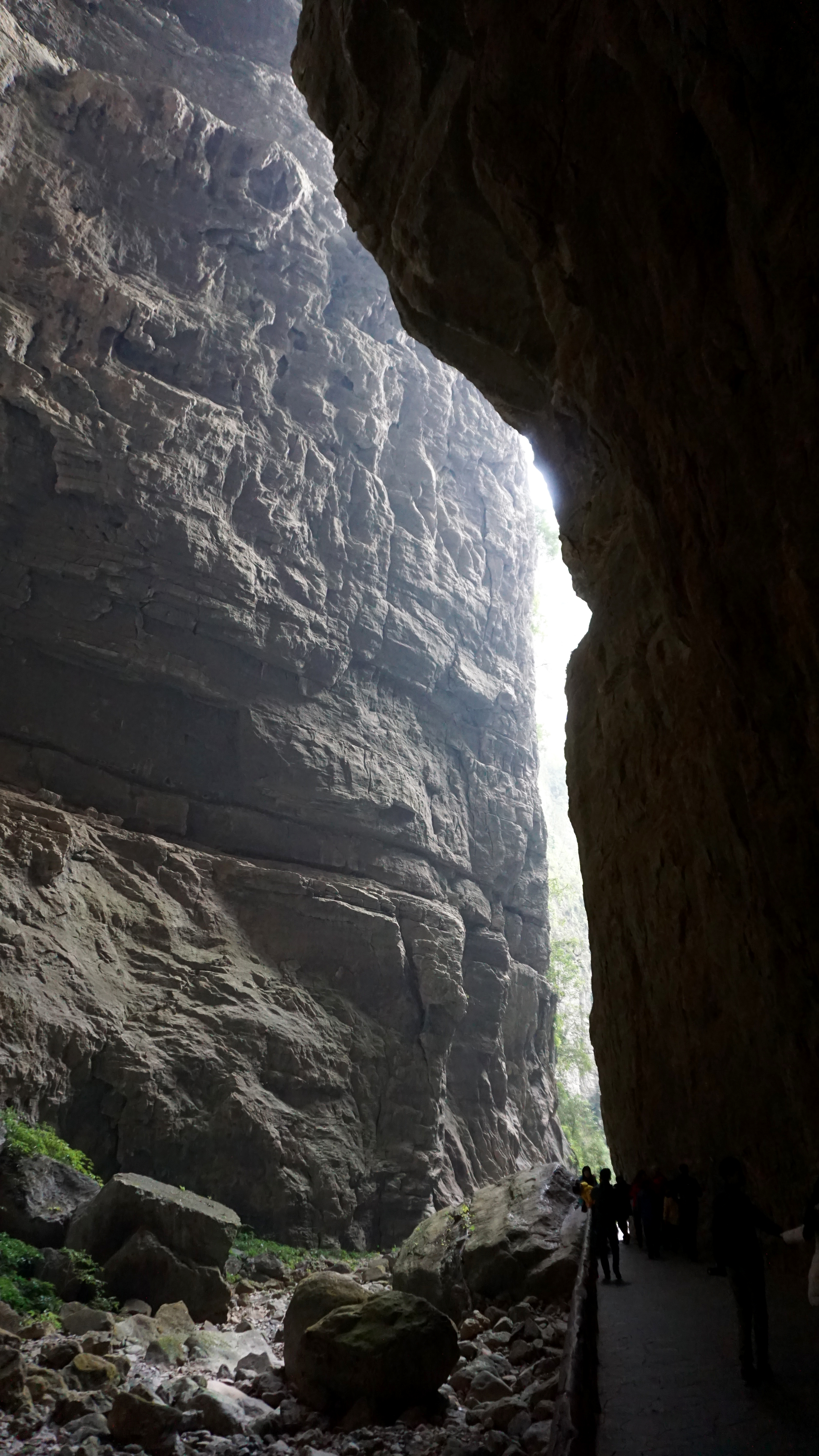 The stream runs under the bridge and leads to a view of the next one, Heilong. It is the most ominous of the three as it is tall, narrow, and jagged. The walls are covered with black residue from water, and springs of water shoot out in several places with thick green plants trailing below them. We couldn’t see the sky or canyon on the other side of this one as with the others because it twists like a tunnel through the rock.