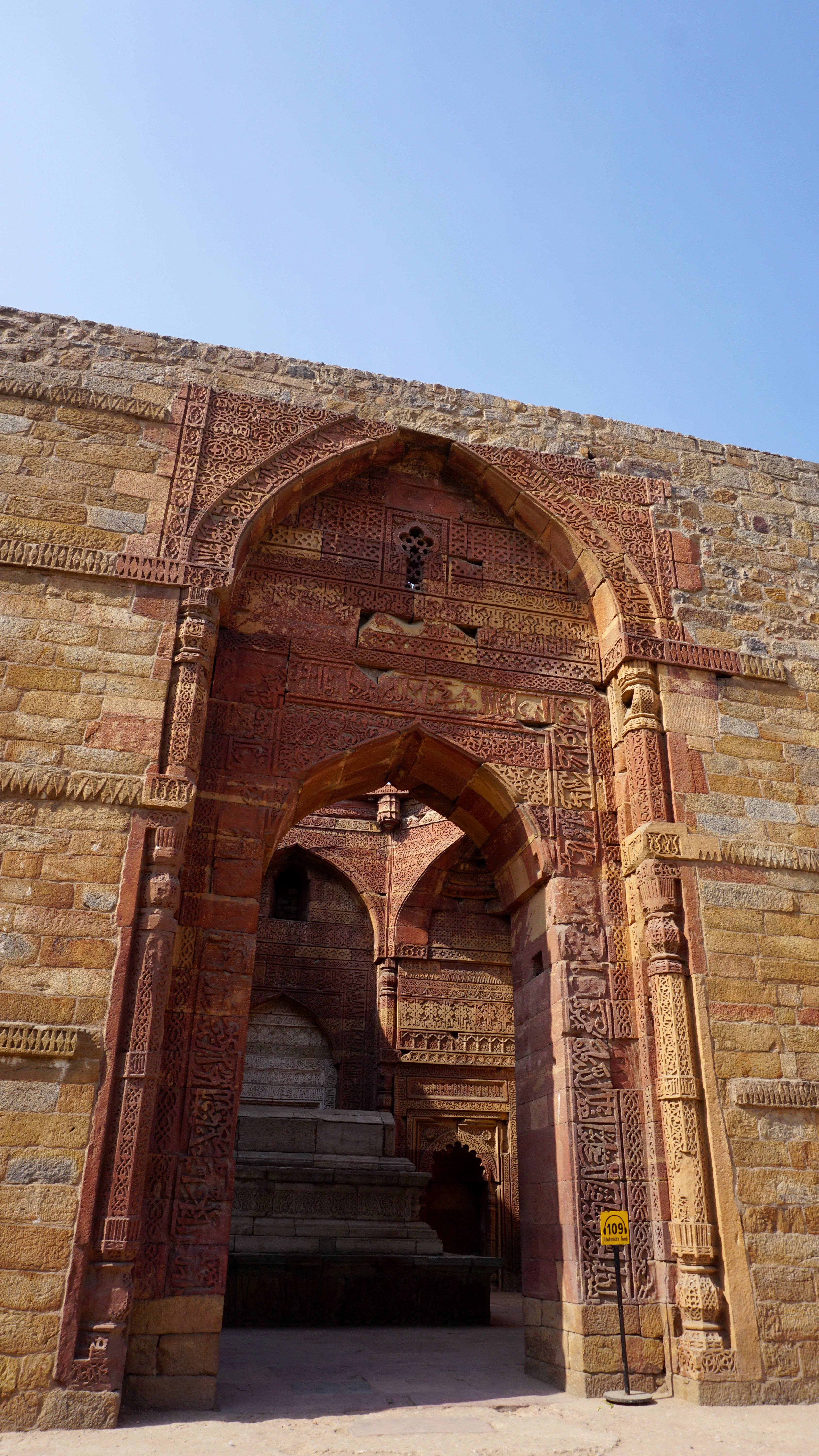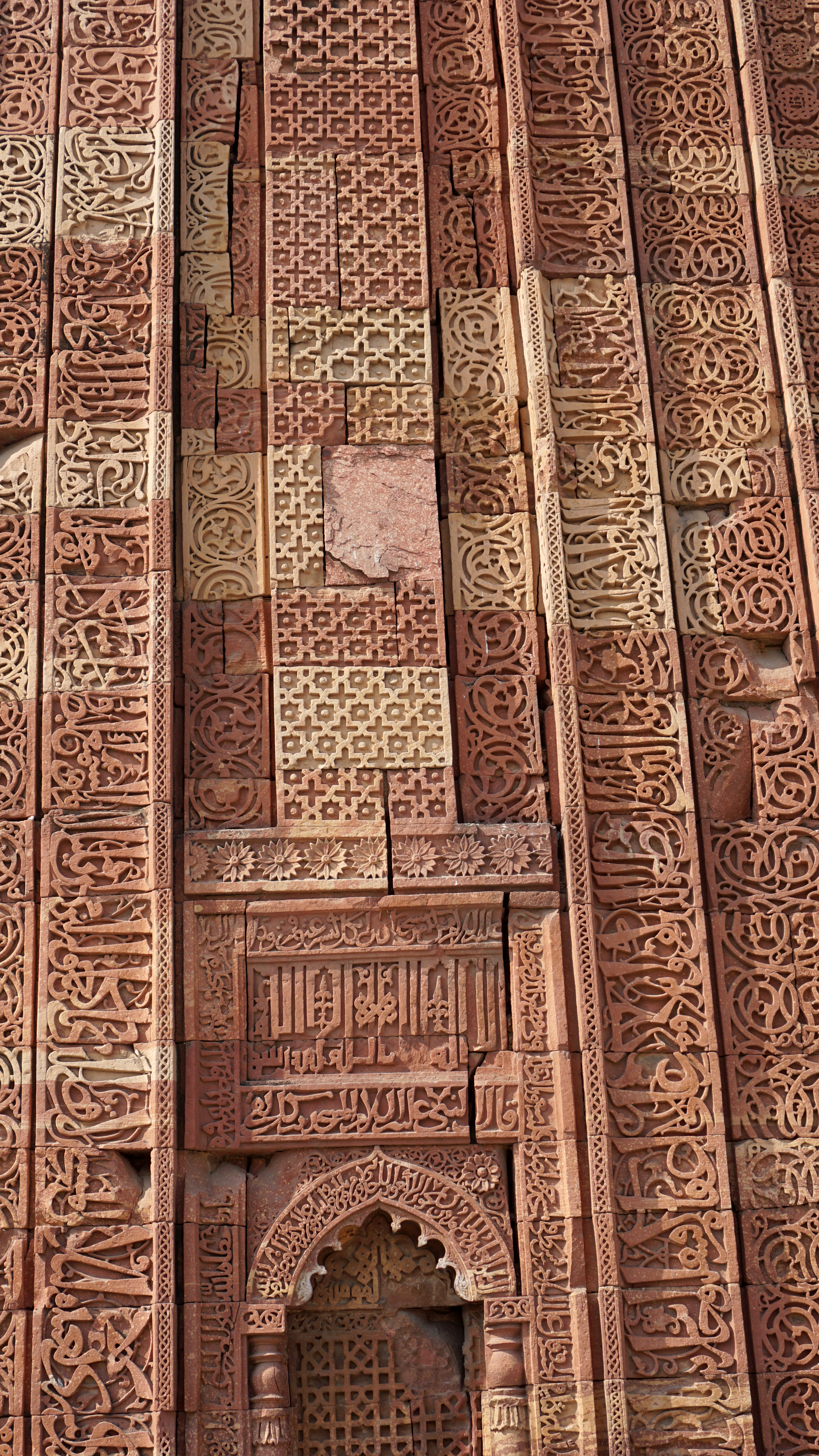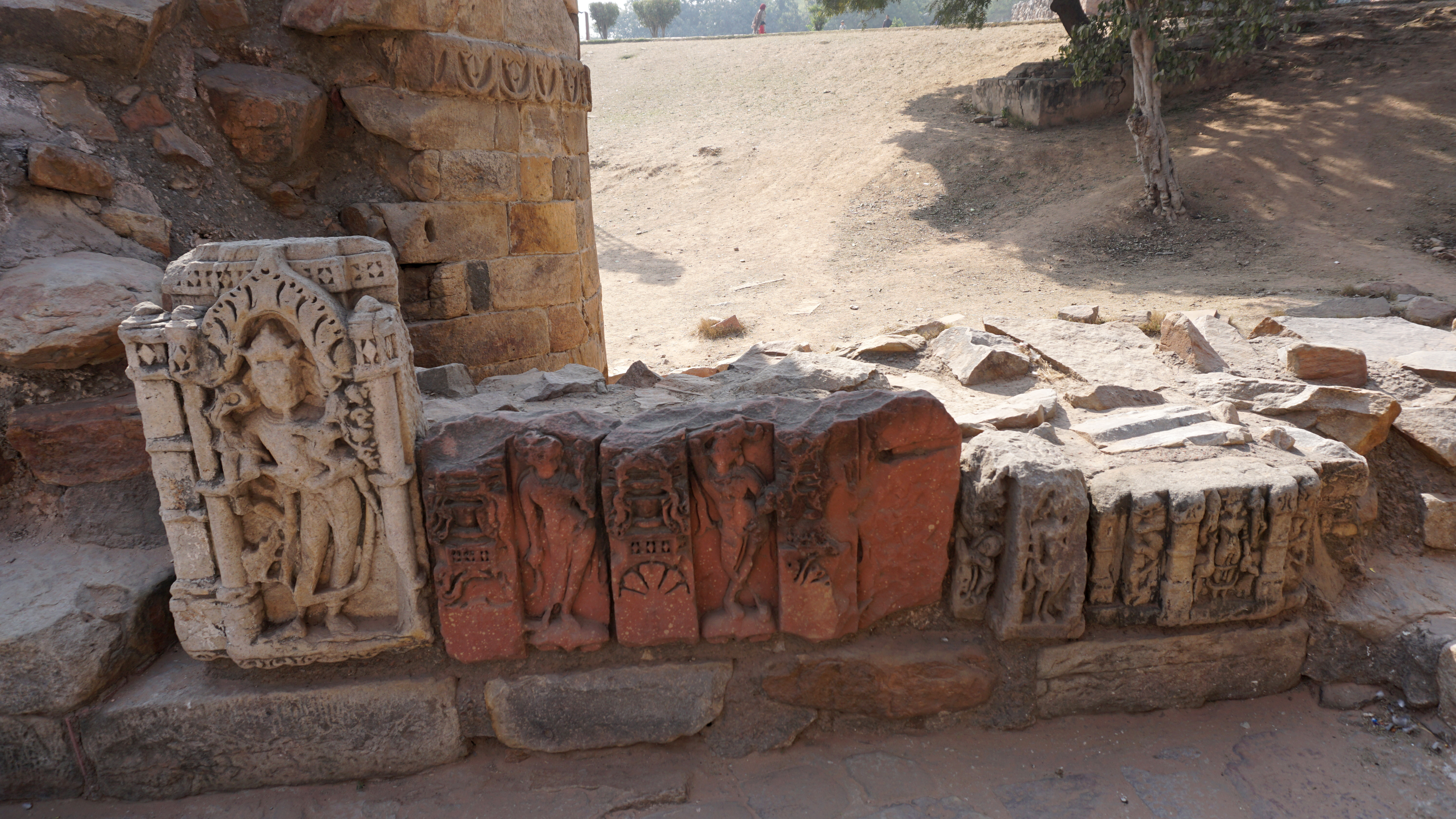 The tower is covered with carvings of scriptures and beautiful designs as are many of the other buildings. However, there are also several old stones from ancient Hindu, Sikh, and Jain temples that were pillaged for the construction of this monument. Most of the figures in those carvings, of course, have their heads chiseled down, but a few remain.