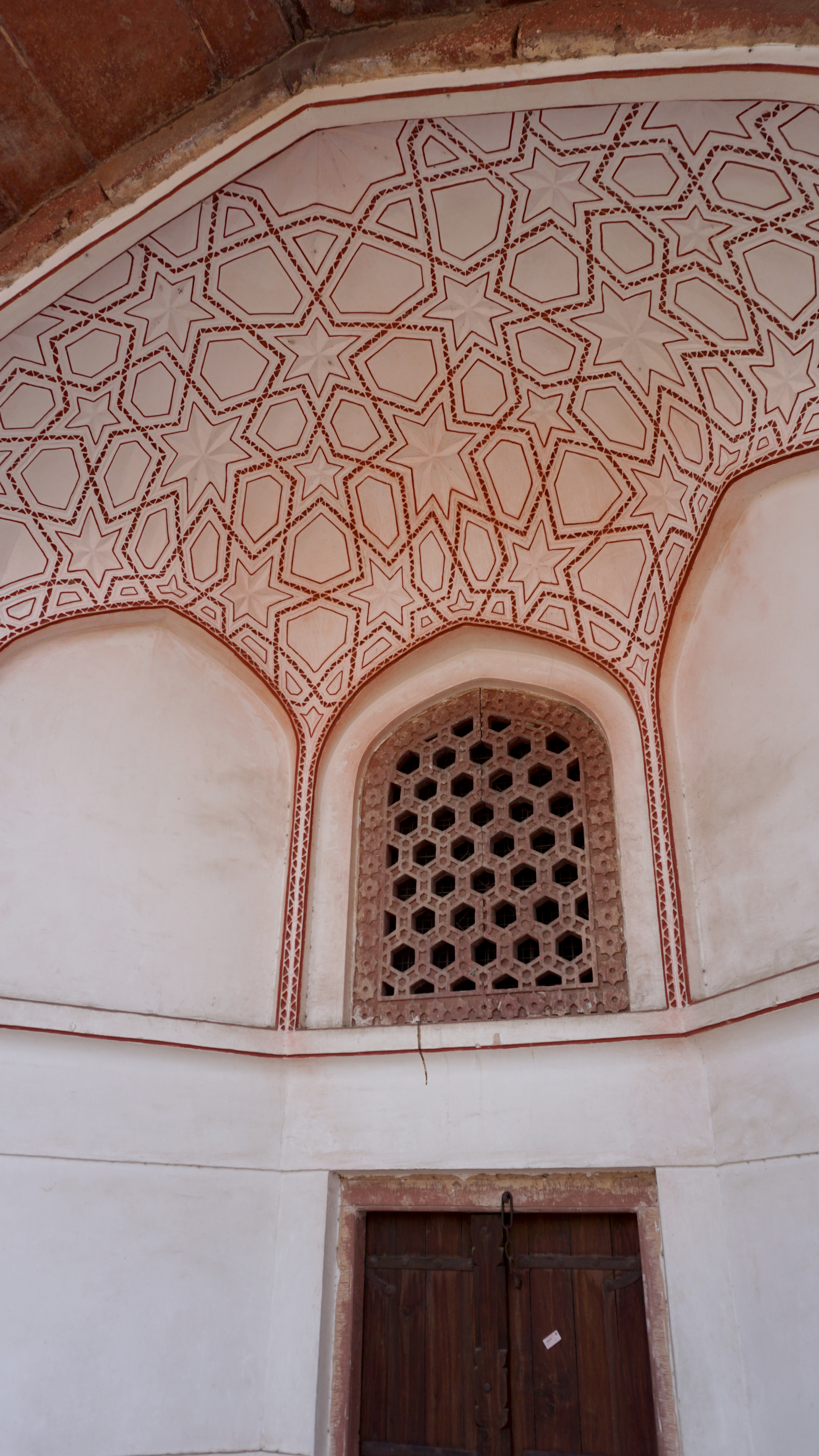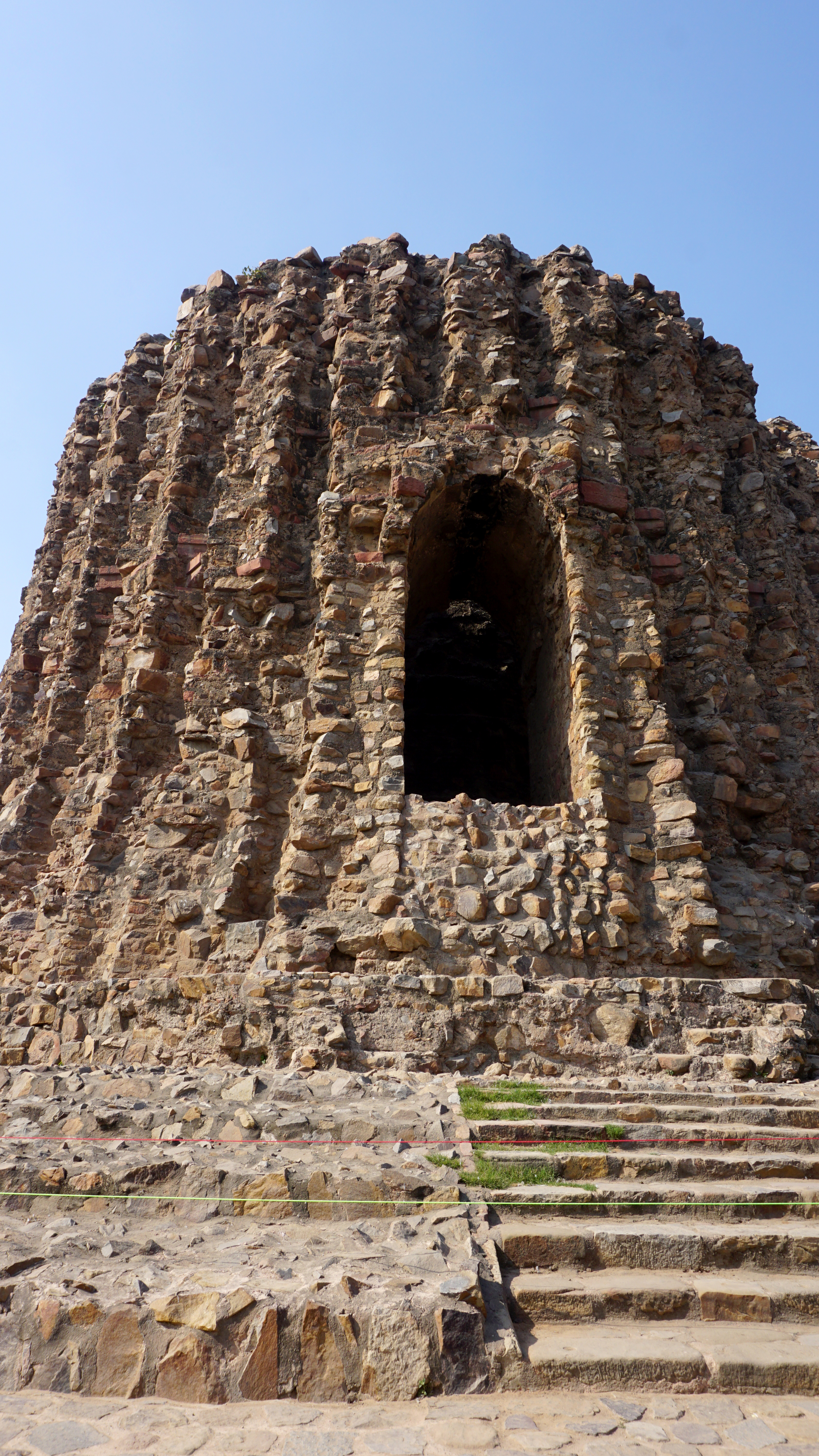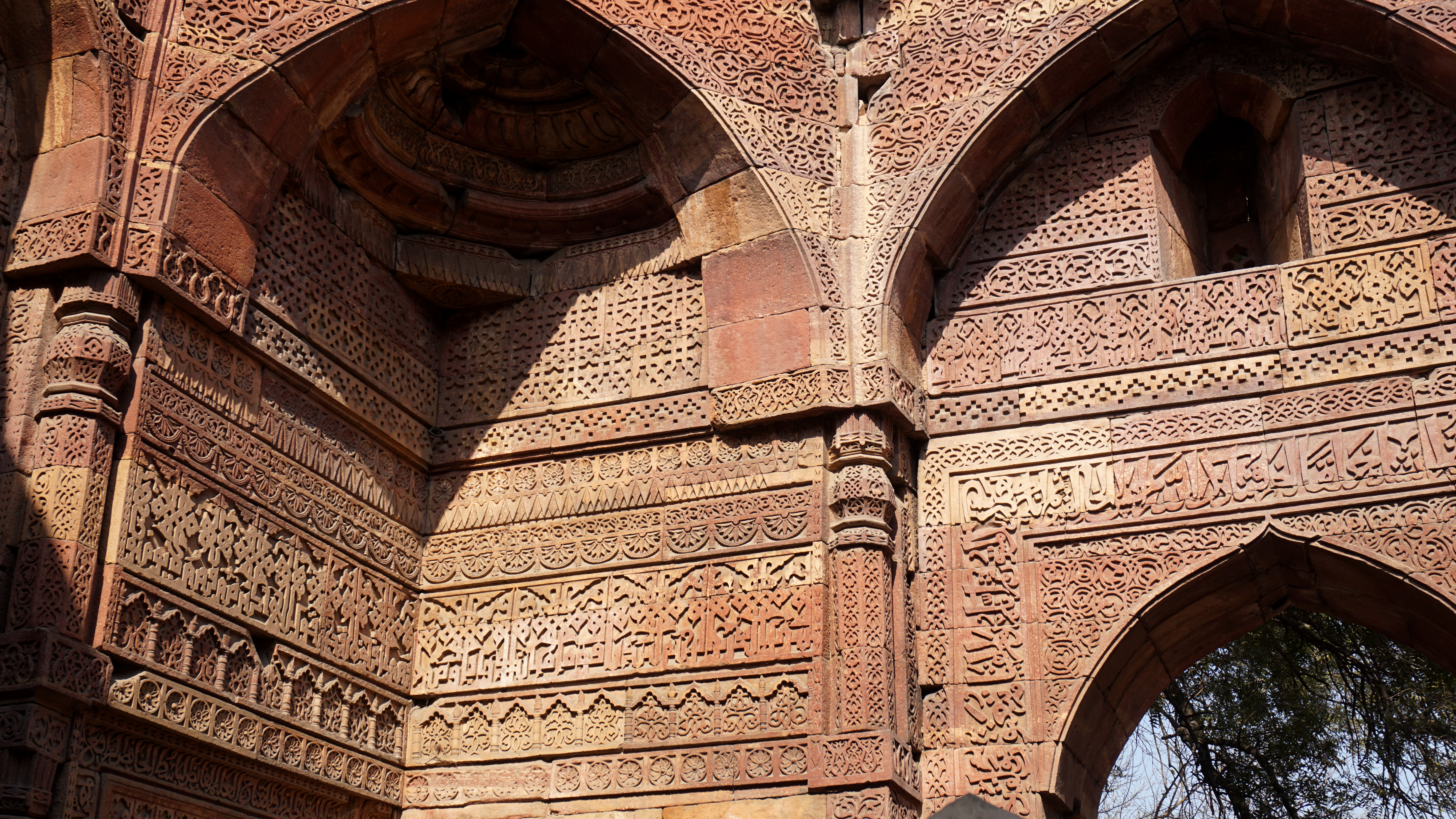 The tower is covered with carvings of scriptures and beautiful designs as are many of the other buildings. However, there are also several old stones from ancient Hindu, Sikh, and Jain temples that were pillaged for the construction of this monument. Most of the figures in those carvings, of course, have their heads chiseled down, but a few remain.