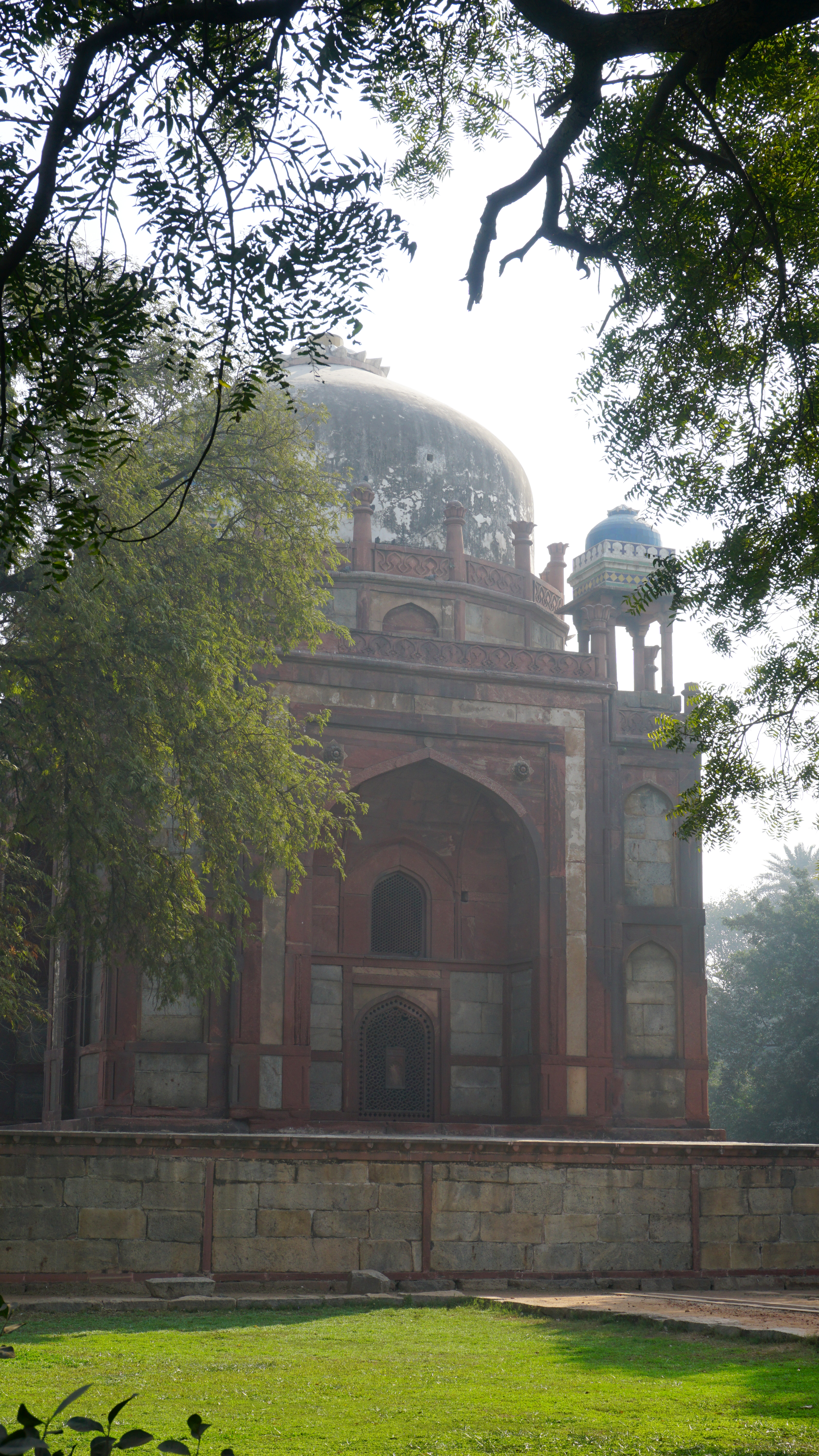 After a delicious Indian breakfast, we headed out with our driver and guide to a piece of architectural inspiration for the Taj Mahal, Humayun’s Tomb. It has a large central dome, but it is not as grand and is red in color. I was still mesmerized by my first experience with the intricately carved stone lattice work and details of construction. On a hazy Delhi day it seemed a bit dream-like.
