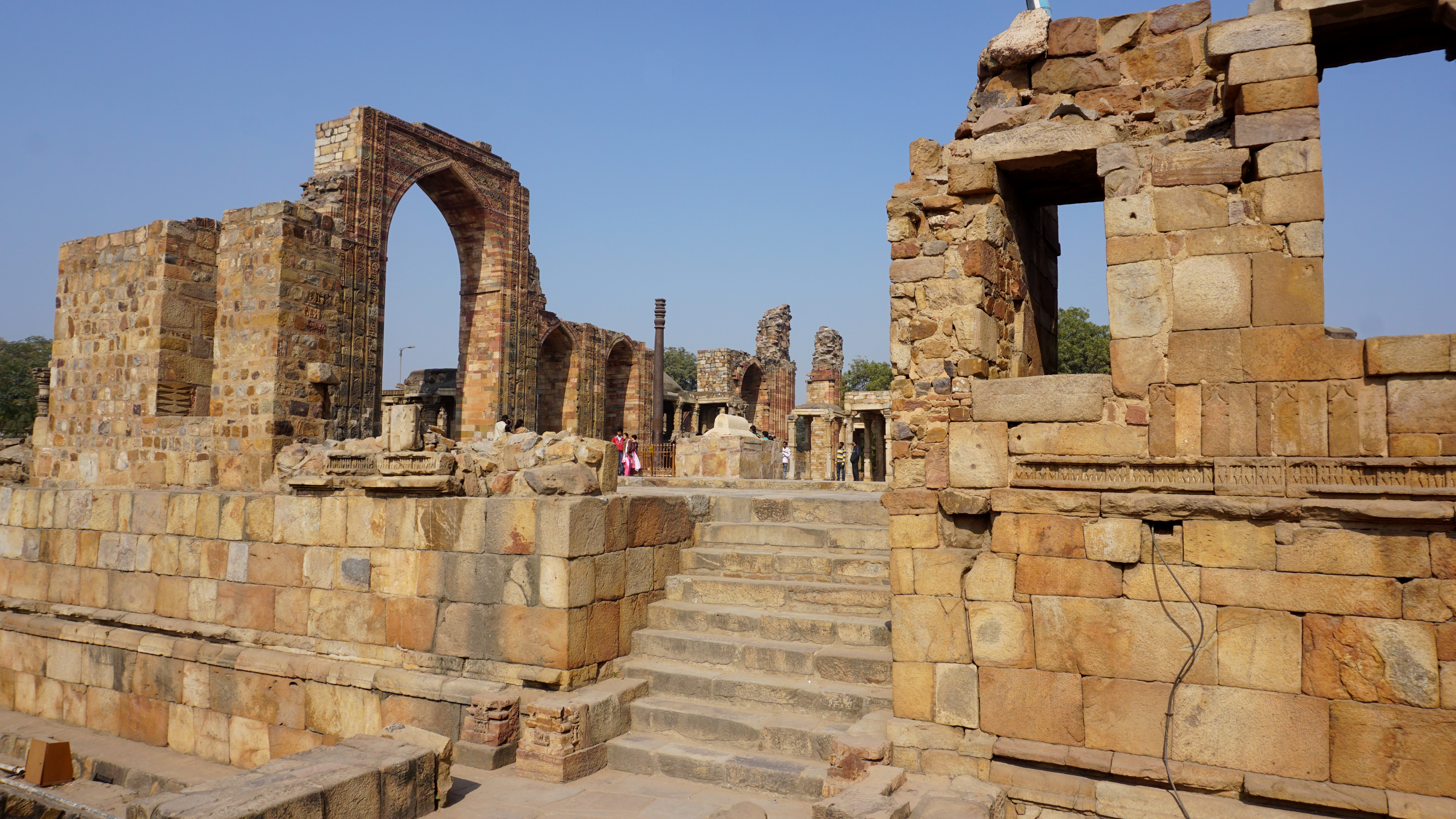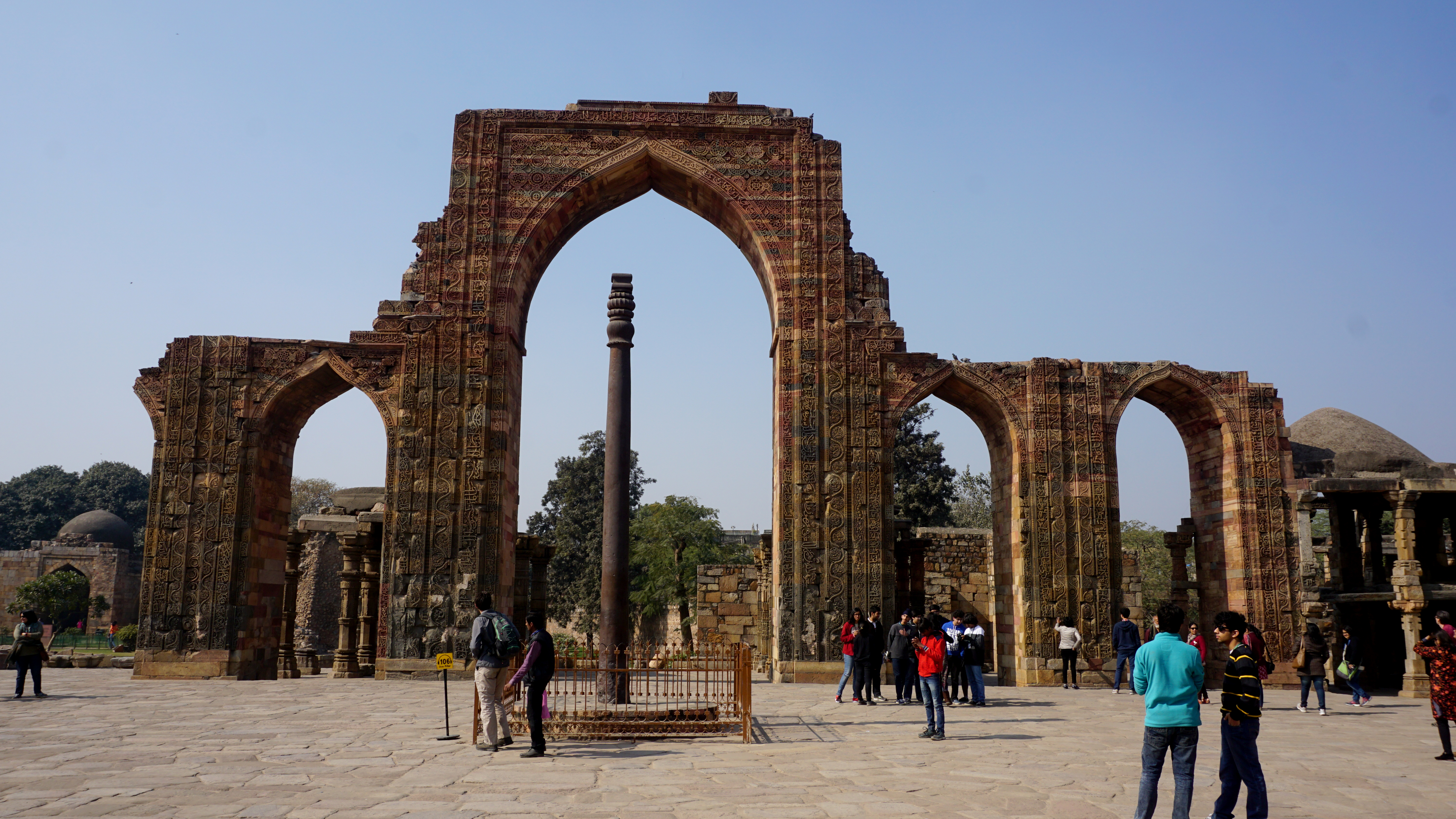 There are magnificent archways and an iron pillar, an archeological wonder from the 4th century A.D. Beautiful green ring-necked parakeets contrast perfectly with the red sandstone buildings and lush trees set the architecture off perfectly.