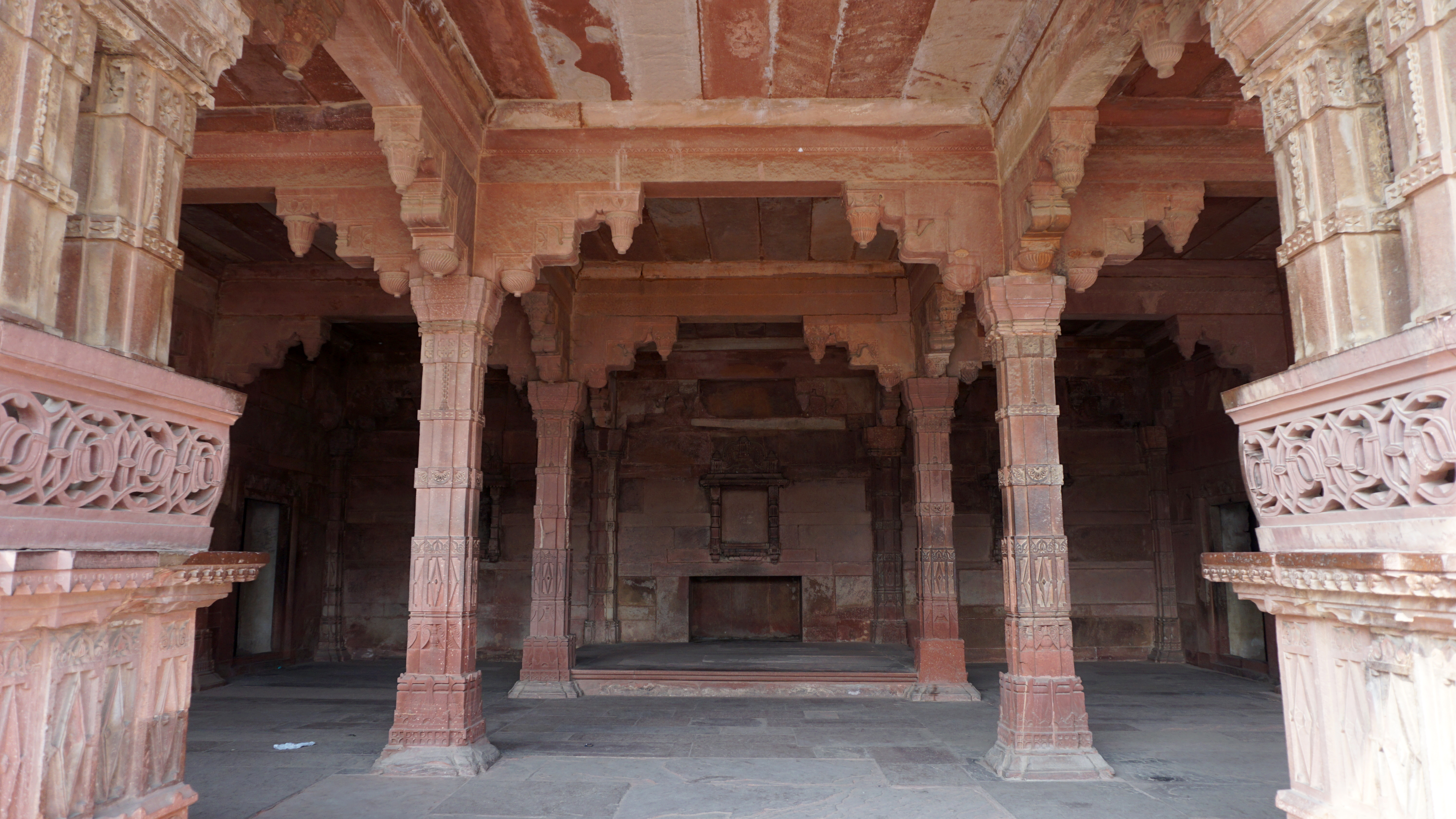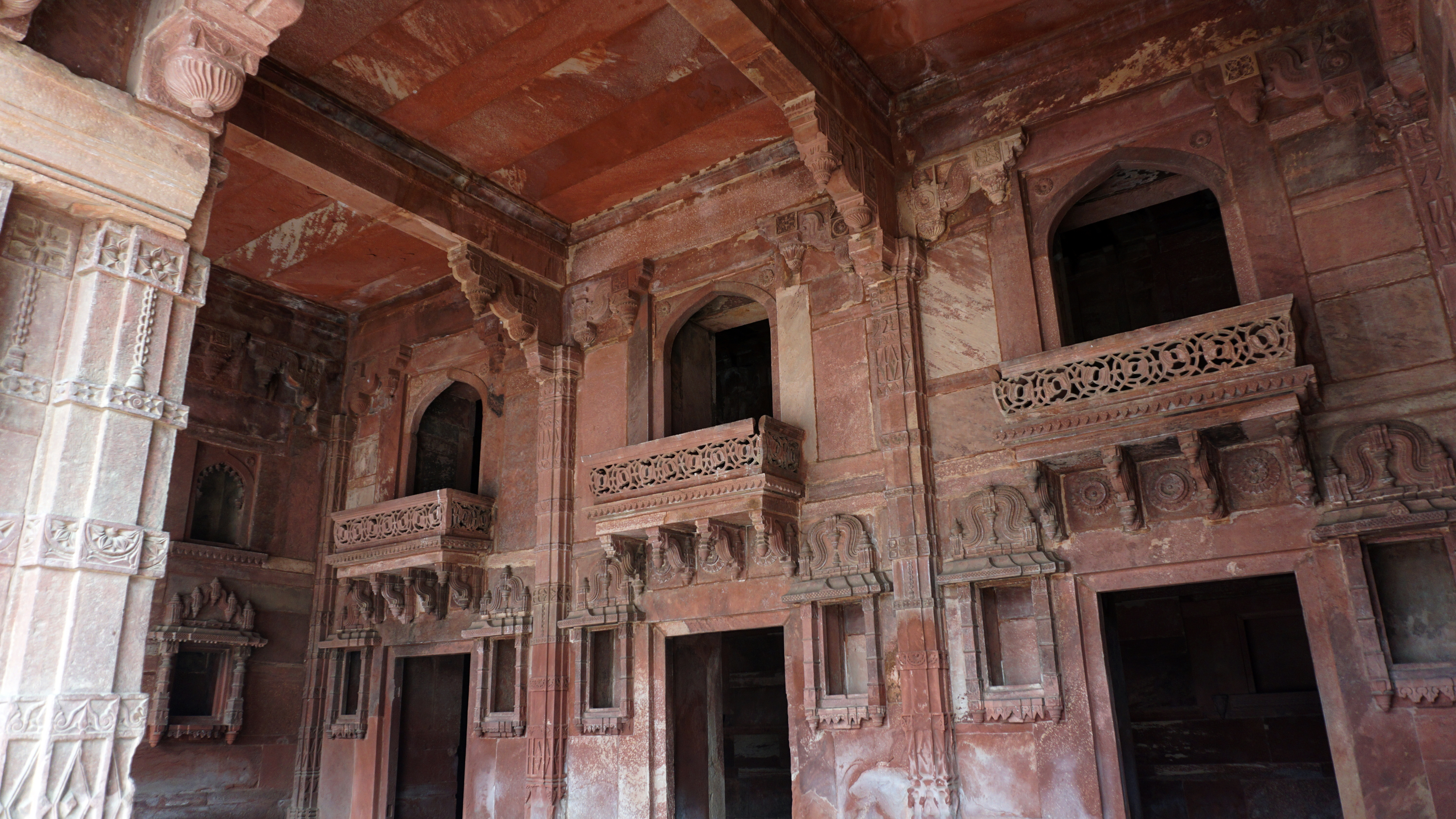 Other impressive structures of the palace include the multi-story, stepped pavilion for his wives, the special, small pavilion for his Muslim wife with exquisite floral carvings in the sandstone walls, and the larger court palace for his Hindu wife.