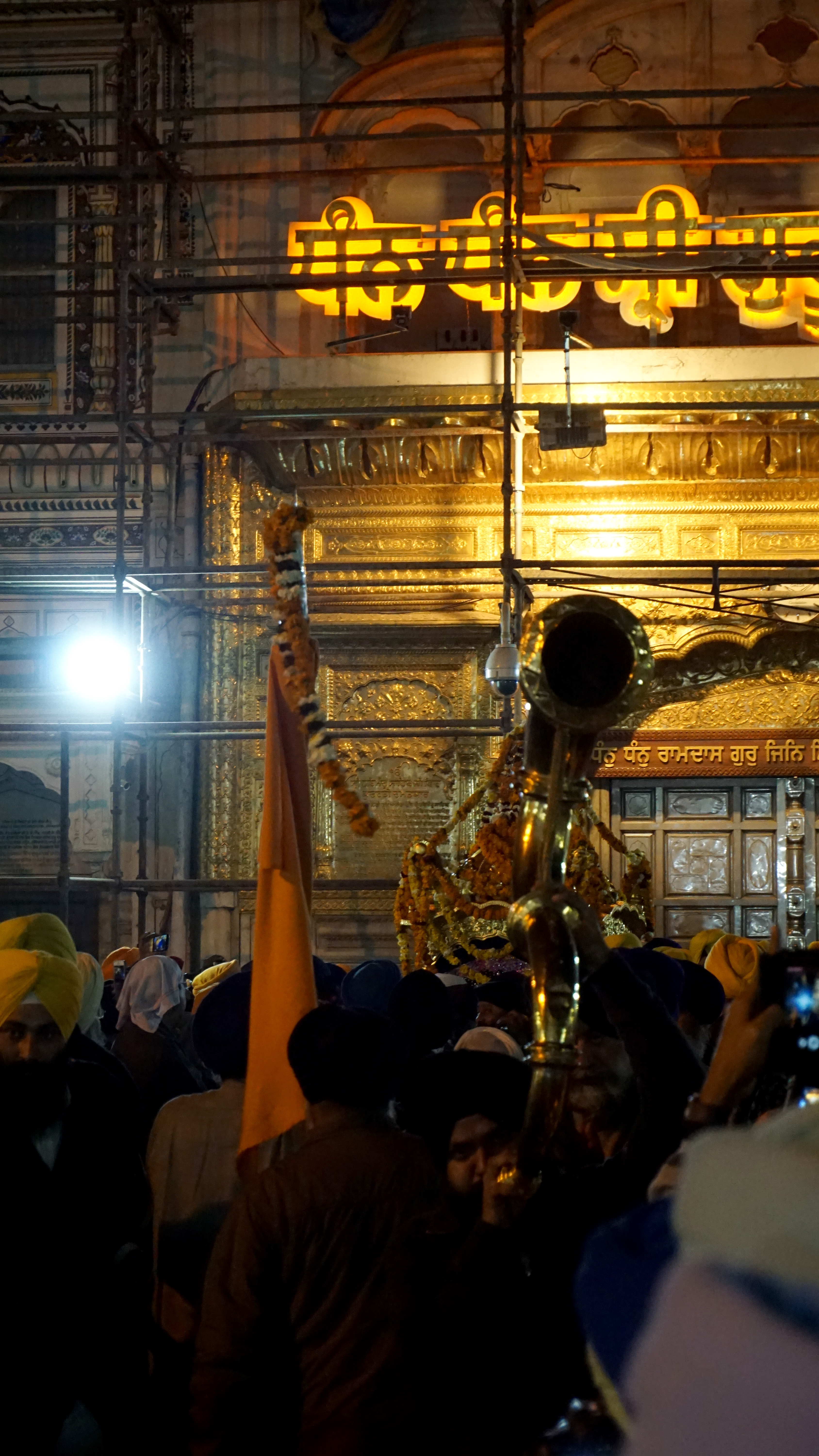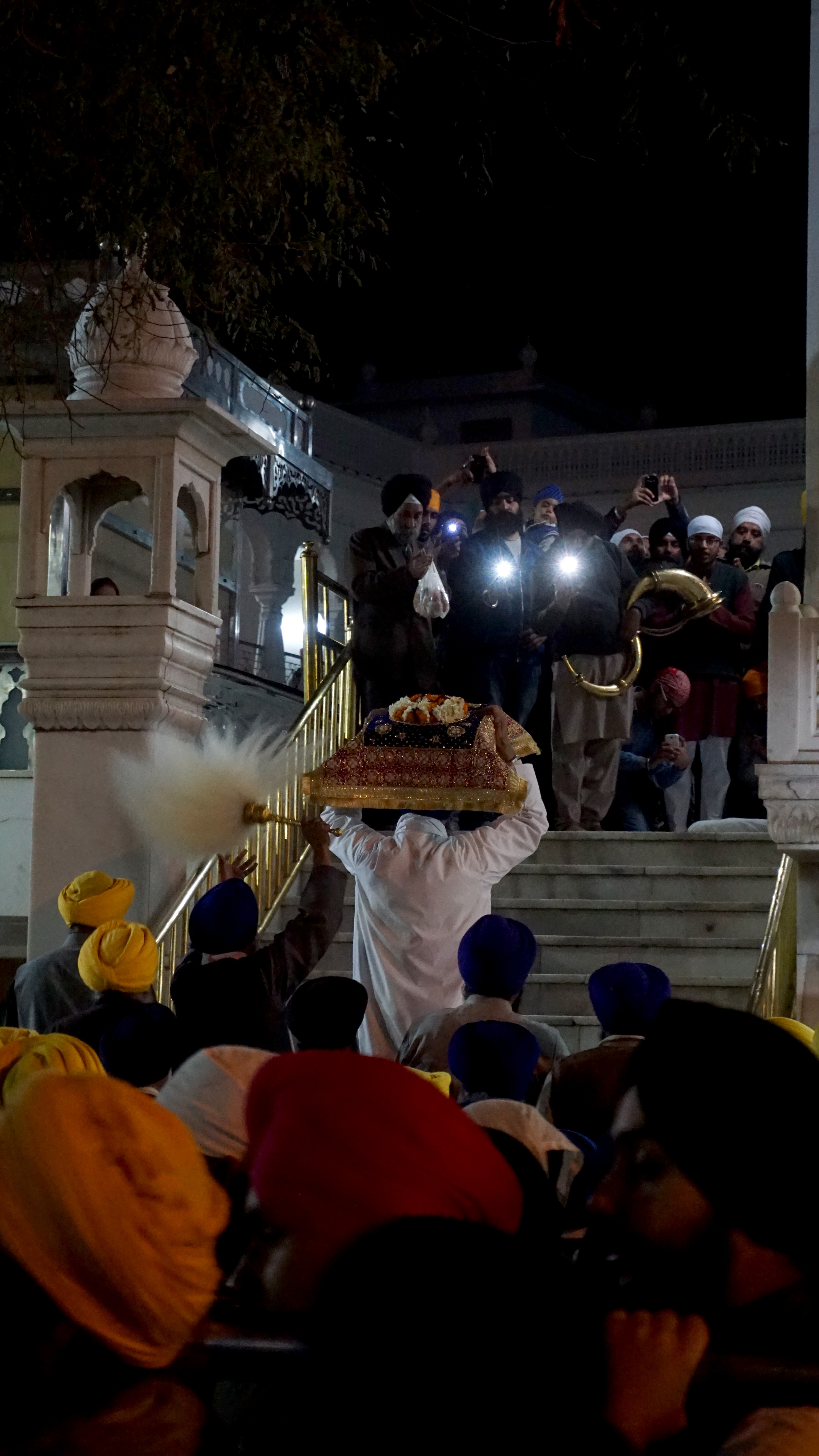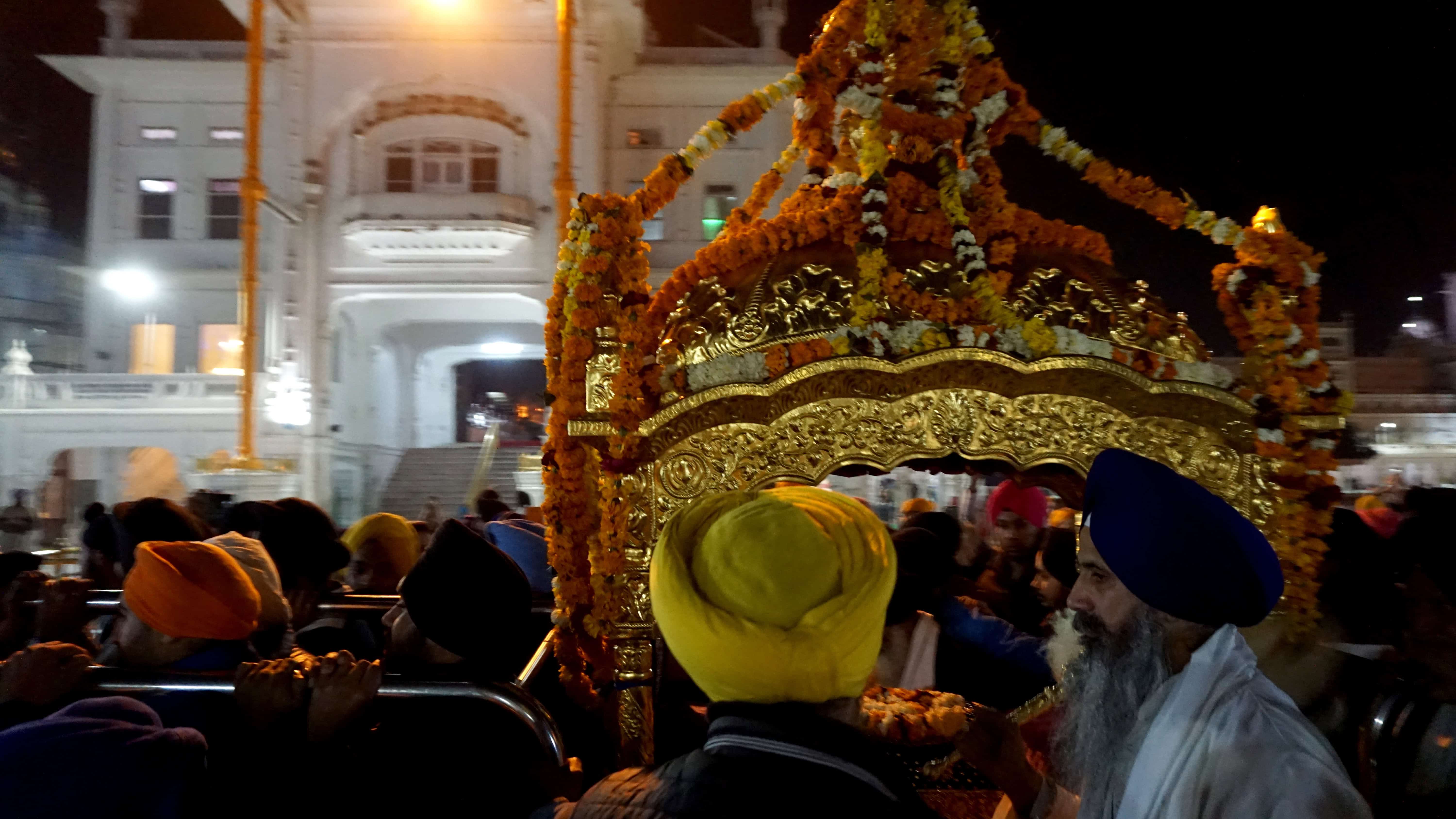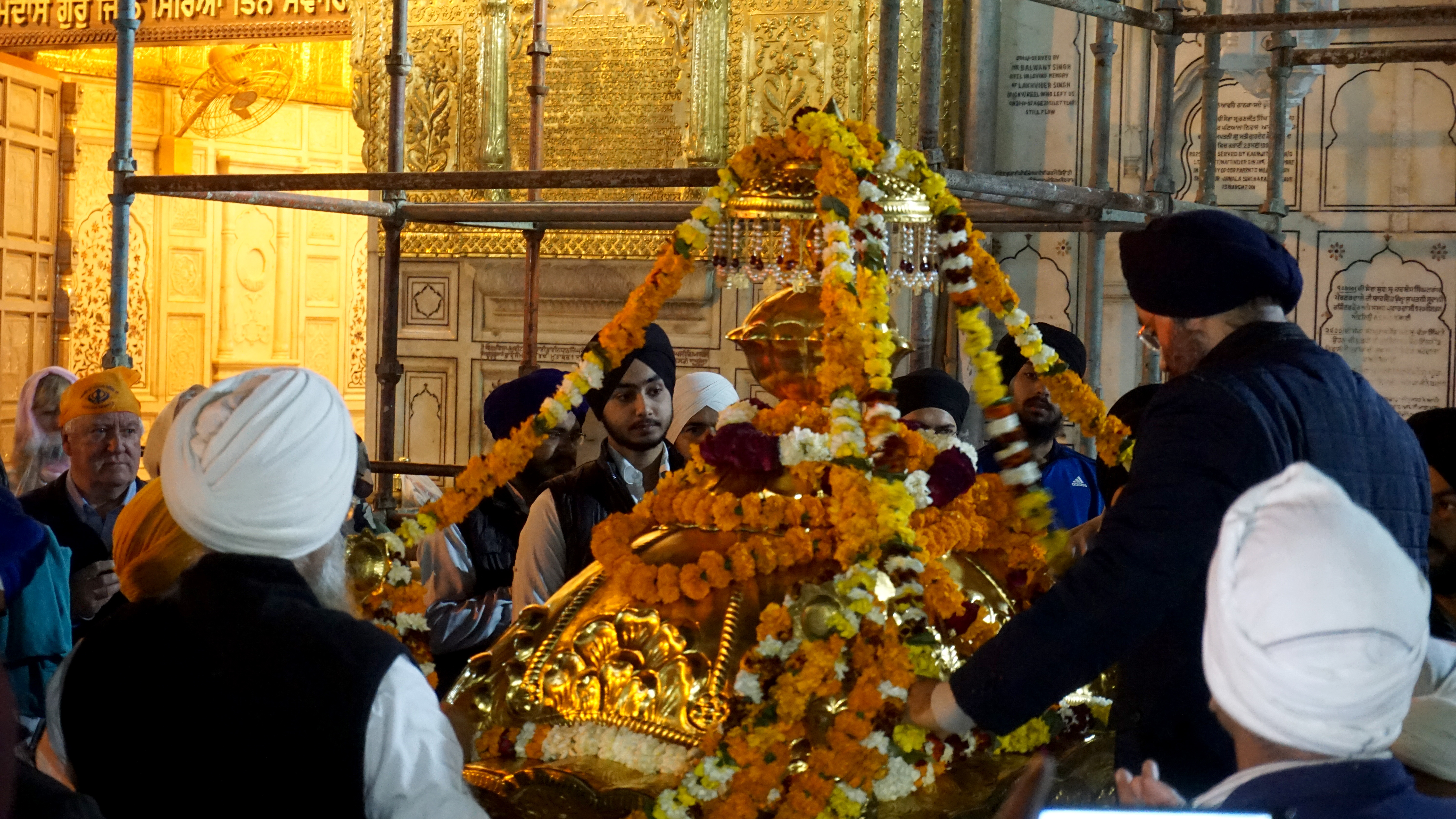 The ceremony begins with the decoration of a palanquin for the book with lush leis of beautiful saffron and yellow and red and white carnations. There is chanting and praying as this goes on. Then the platform is carried to the heart of the Golden Temple where the book is read from all day. A procession with ram’s horn and more then takes the book to a lovely building where it is carried on the high priest’s head into its resting chamber.