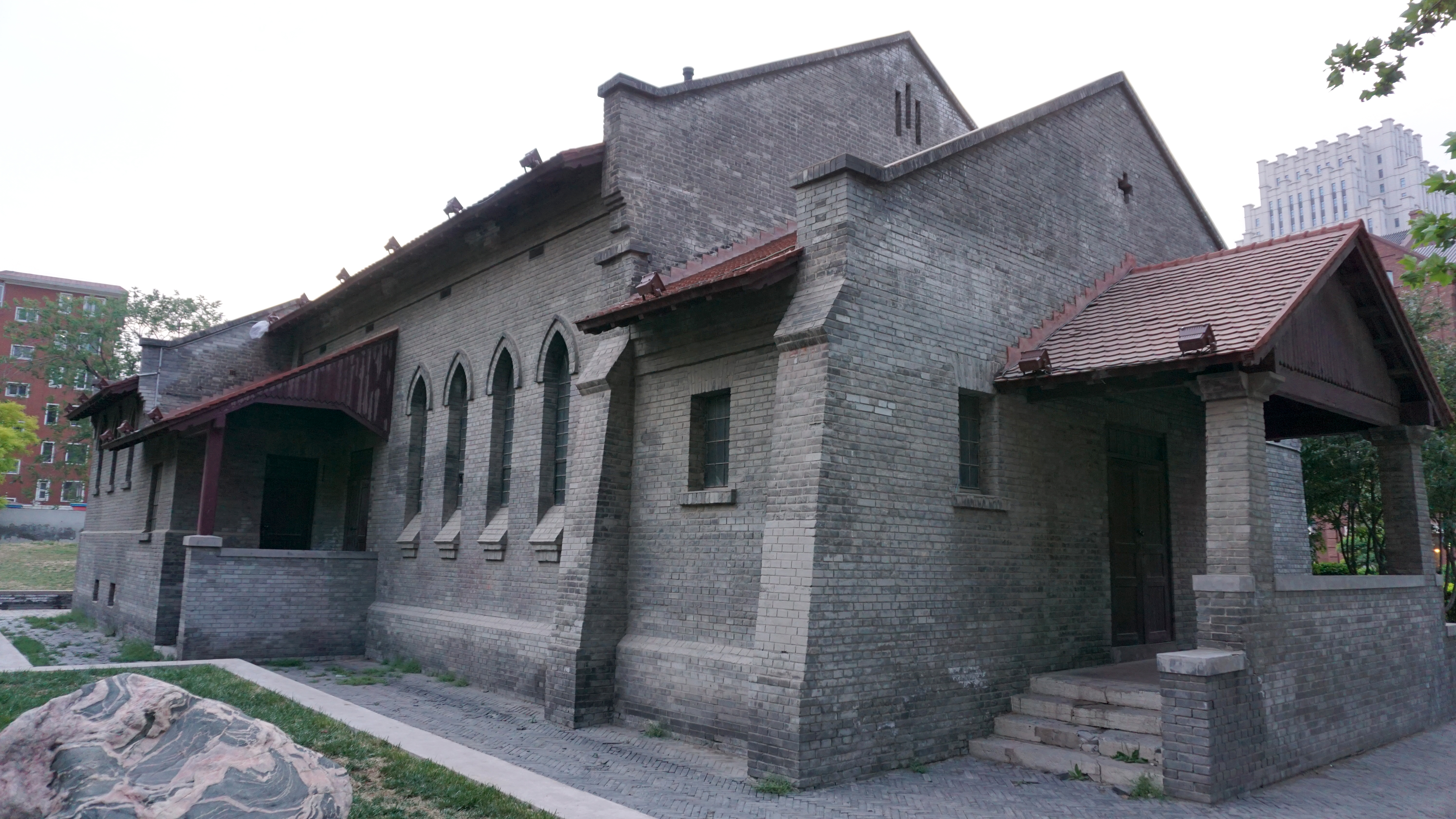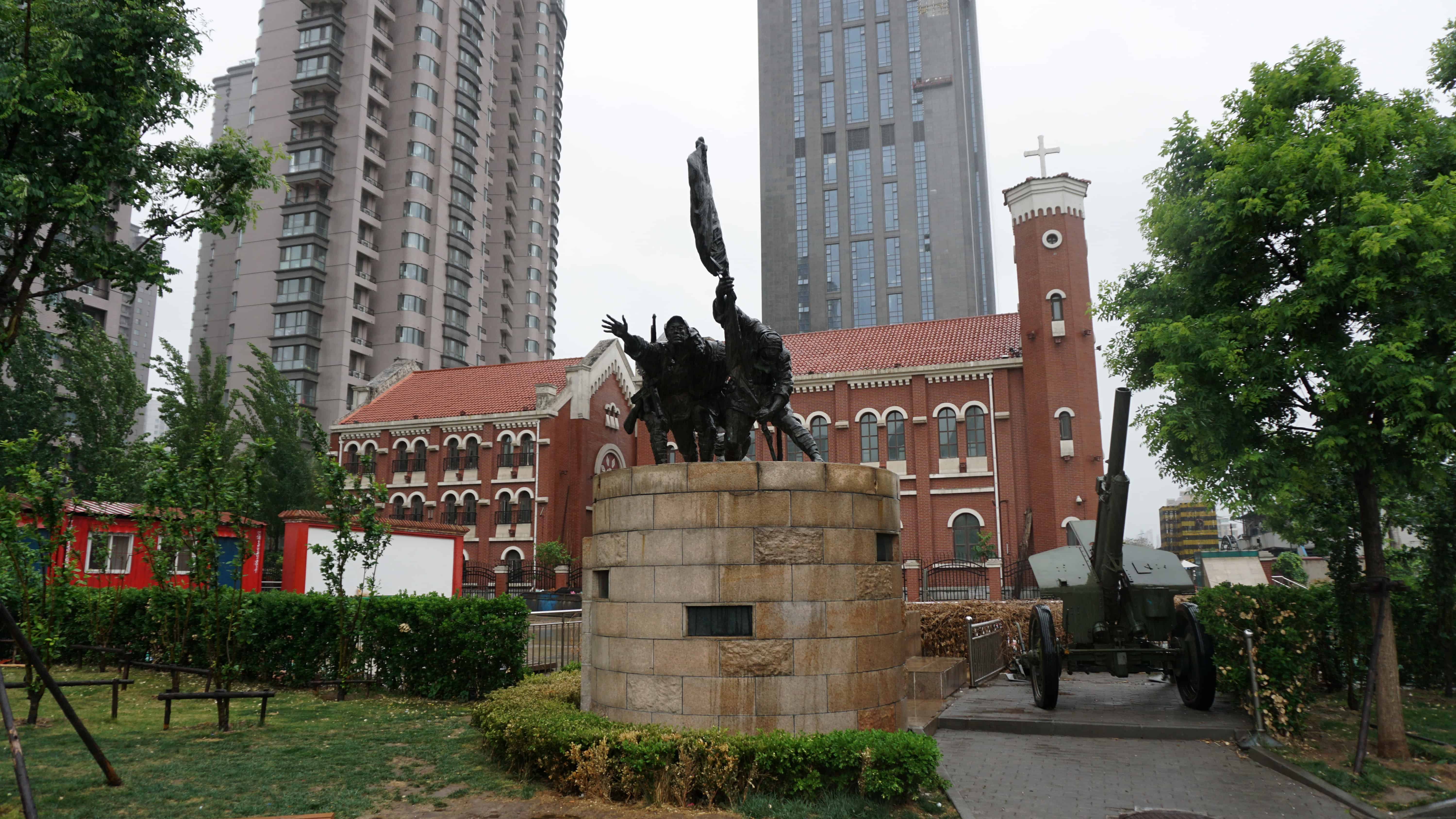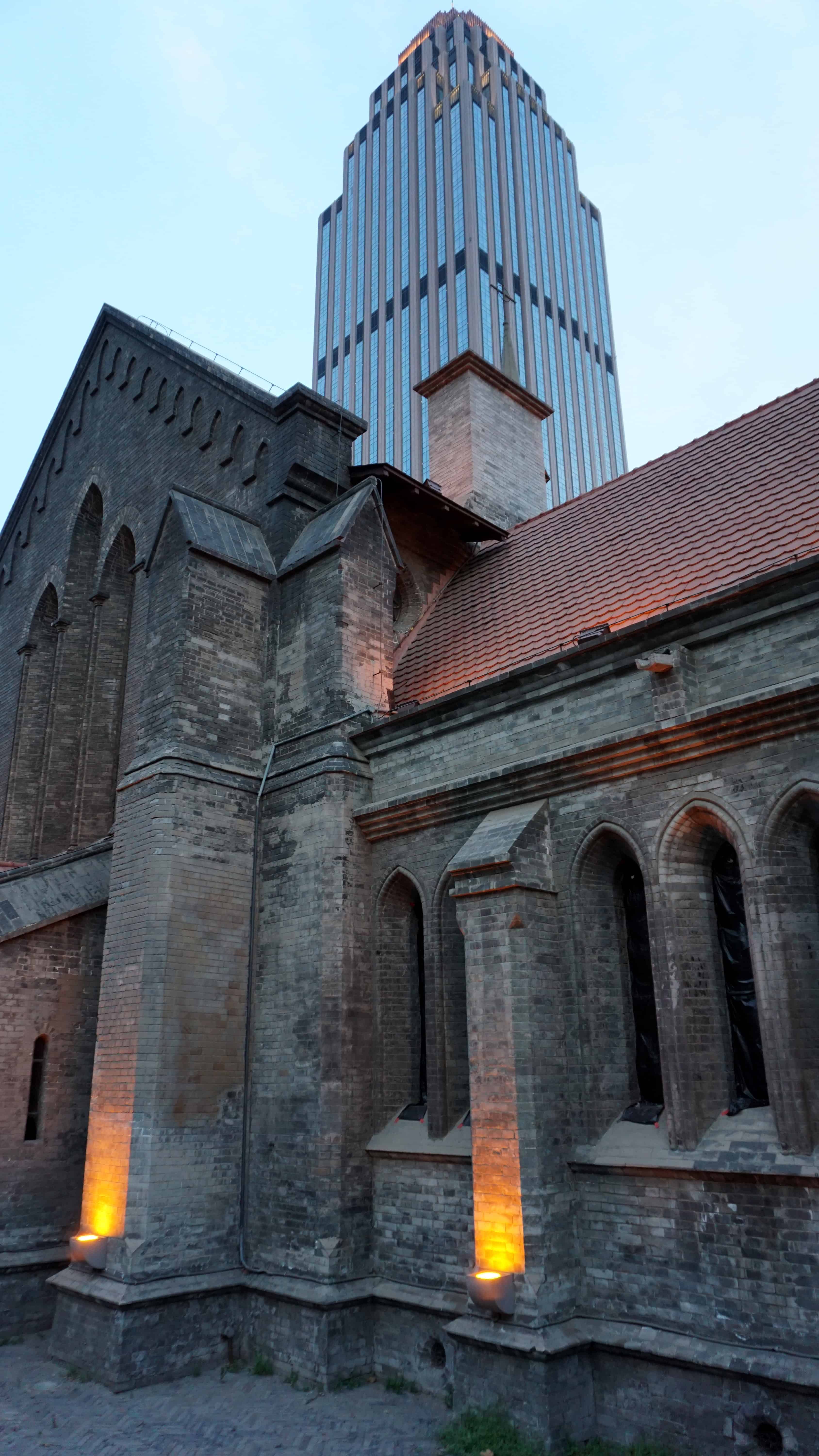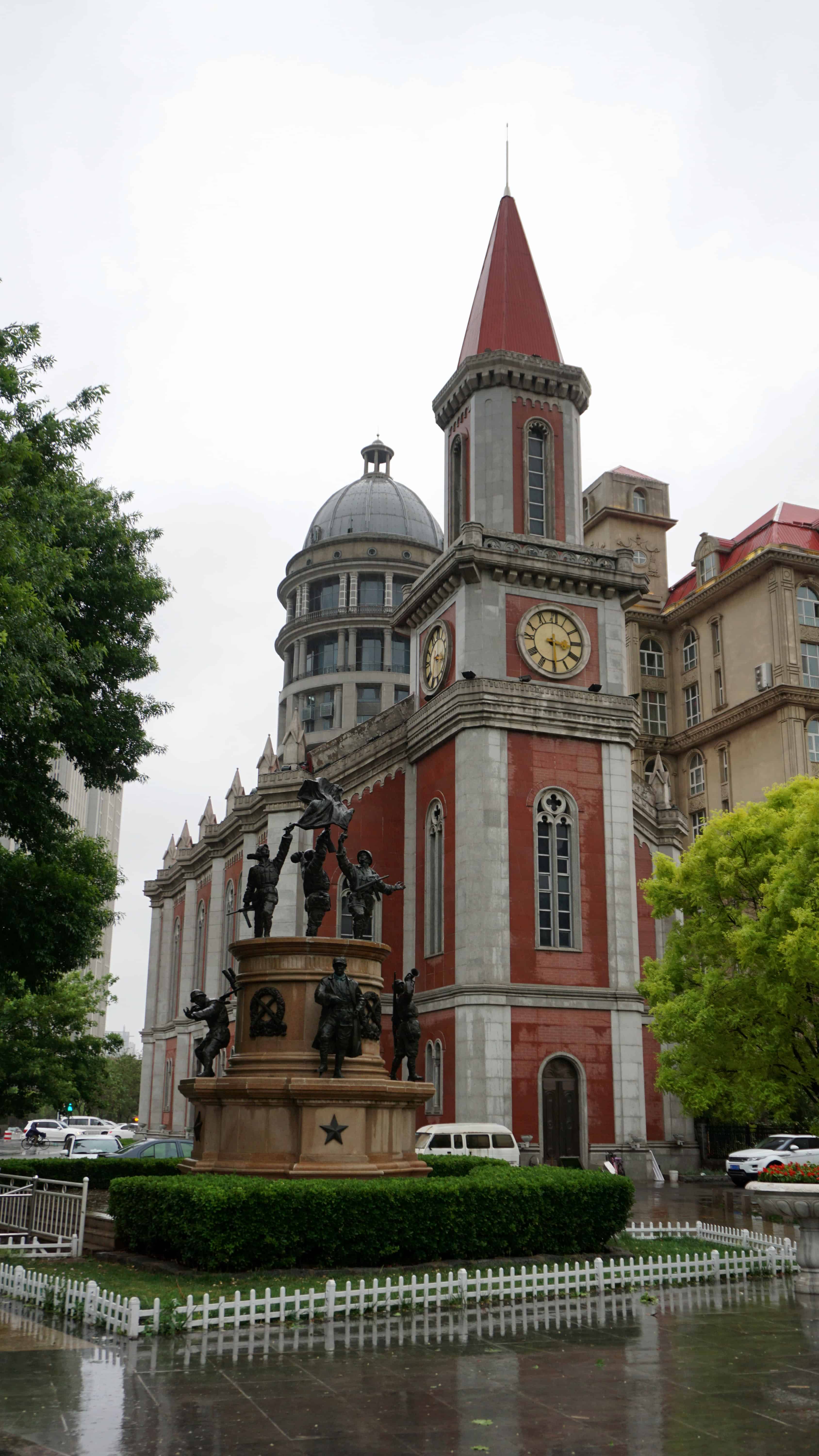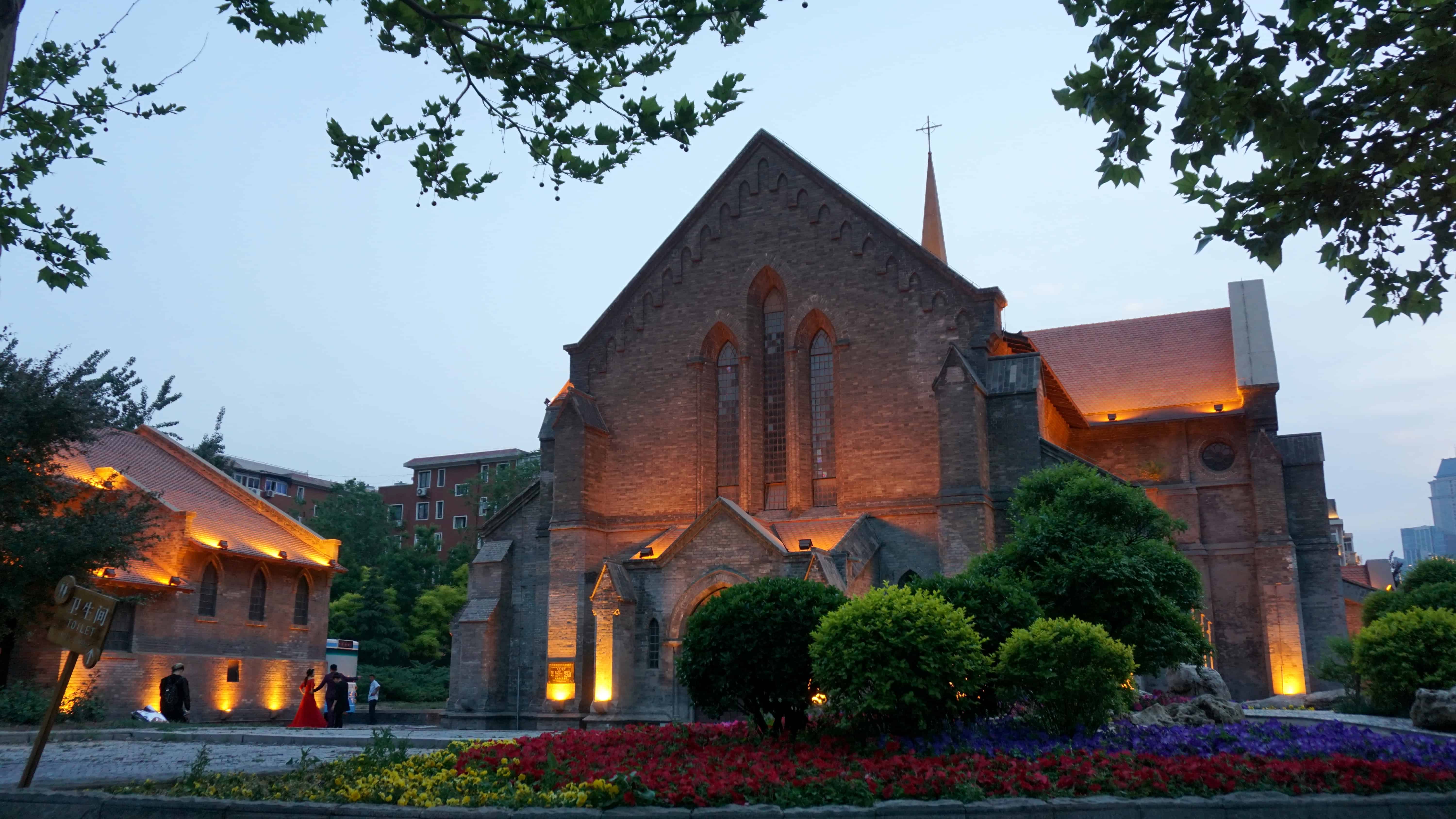 As I meandered the rainy streets of Tianjin, I came across a few other churches including my favorite, a small medieval-style building with accompanying parish building. They are not in current use but are beautiful. I reached them at dusk as I started my wanderings soon after I arrived in Tianjin, just as they were about to turn on the lights. With the flowerbeds in front, it was idyllic and a great first impression of the architecture I’d experience in Tianjin.