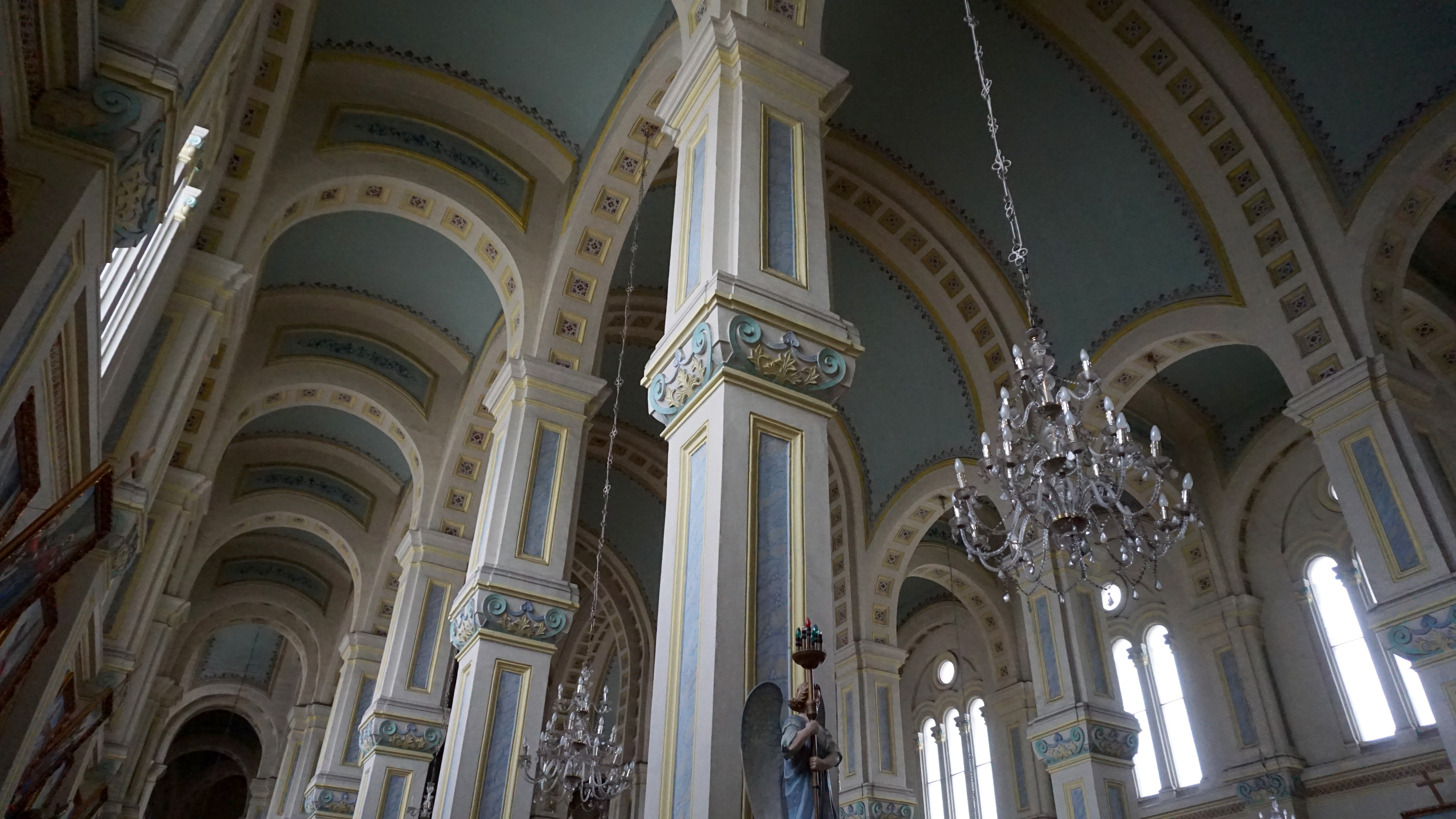 This Romanesque building is lovely. Its imposing façade with red and white striped brick stands at the end of a pedestrian plaza between two malls. The inside is very simply decorated with white walls and columns and pale blue vaulted ceilings. Simple decorative details accentuate the architecture and colorful stained glass filters light into the nave.