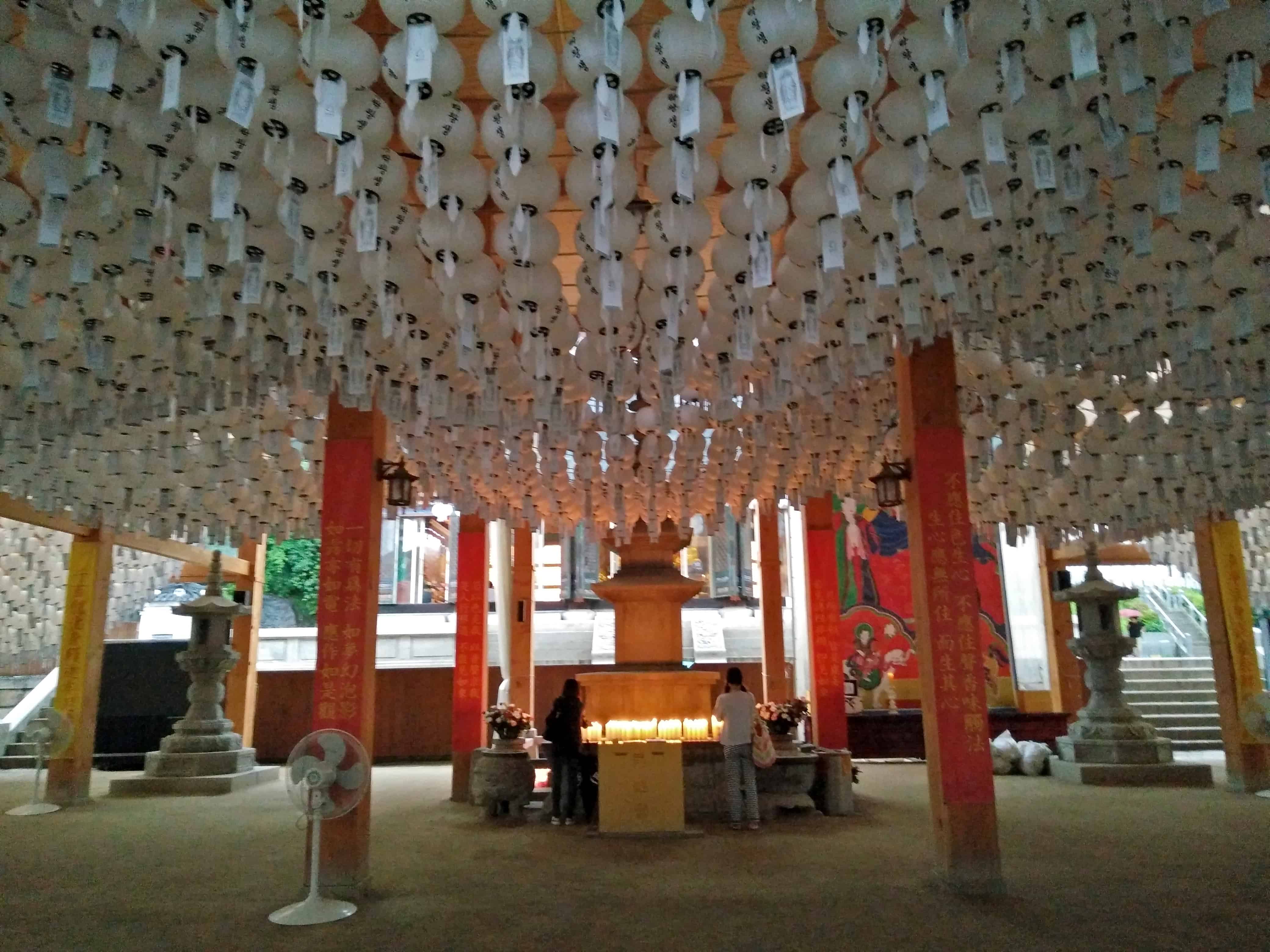 We entered through the main gate and snaked our way up the path between lush lotus plants and draped with hundreds of white paper lanterns. At the top we found prayer halls in use with stands of candles burning. At a neighboring building monks were beating drums.