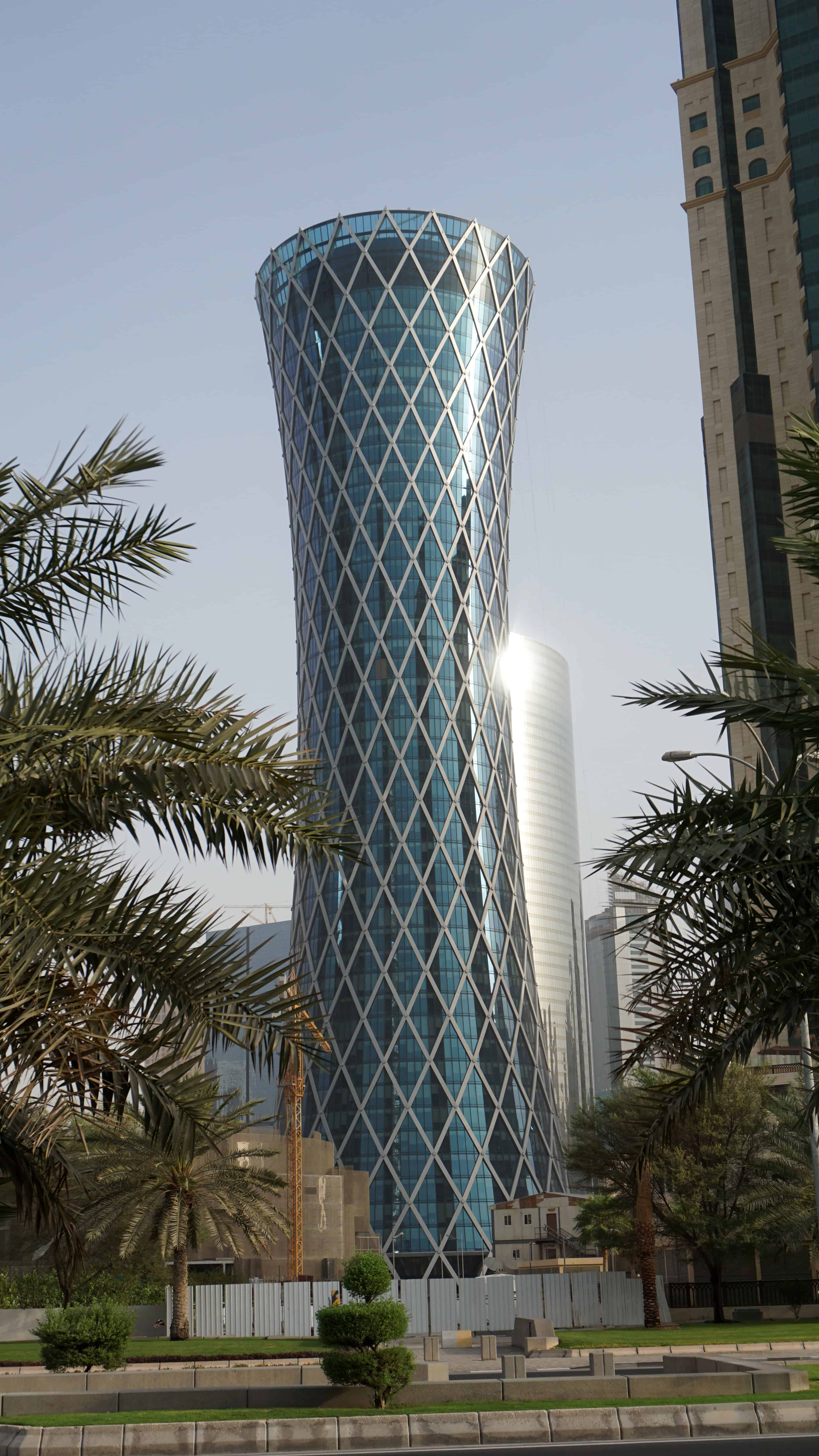 Qatar lies on the edge of the Persian Gulf and the desert. Doha is right where the both meet wrapping a crystal blue bay with skyscrapers and government buildings. A walking path skirts the water. I arrived around 7 a.m., hopped in a cab, and was dropped off at the far end of the bay on that path. This side is where skyscrapers of unique design clump together giving Doha a special and iconic skyline.