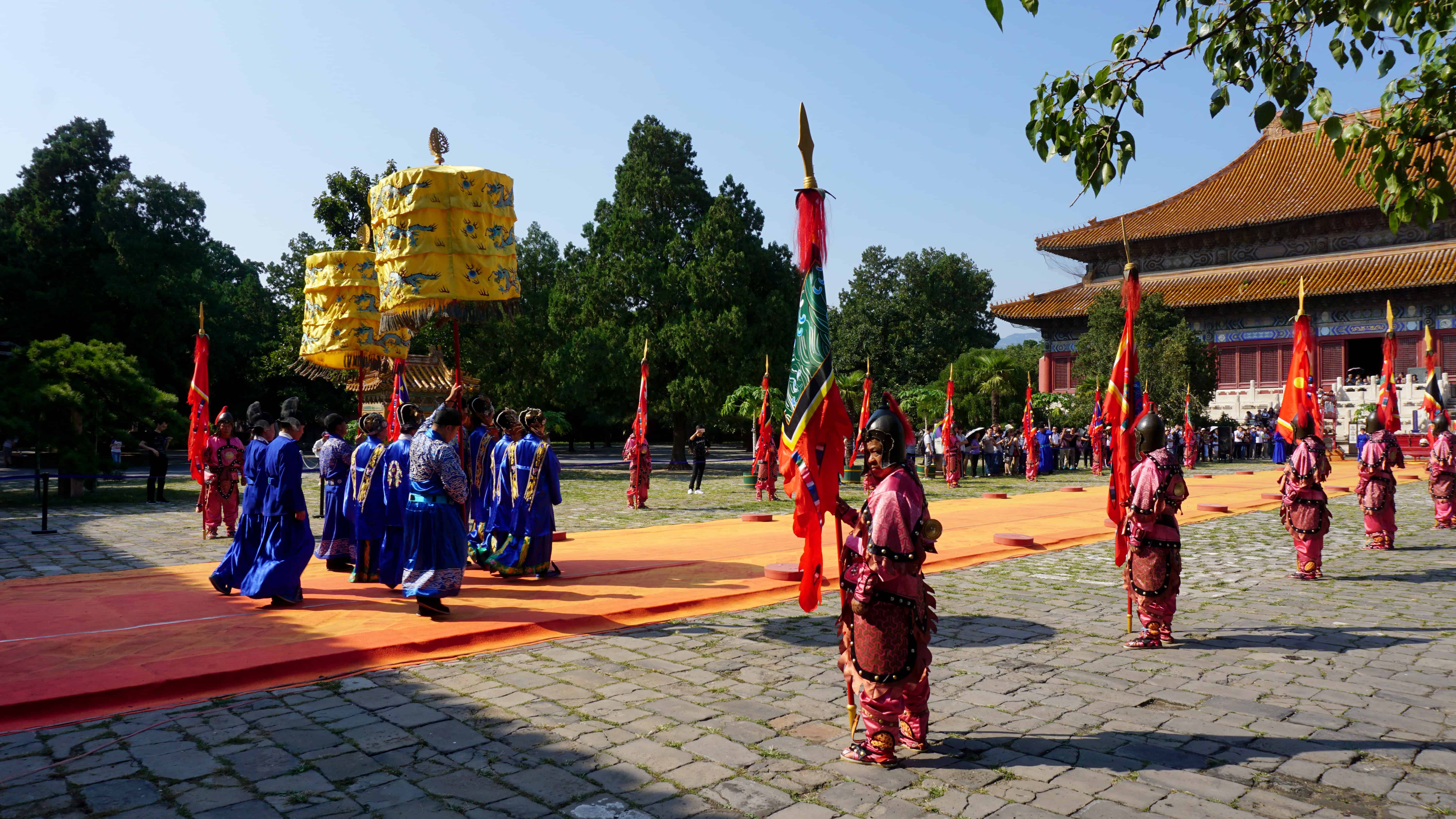 When we arrived, music came from behind the first building. Looking through the open doors I could see flags and banners. We hurried around and found a ceremony reenactment occurring. People in costume were demonstrating the process with a processional, music, kowtowing, offerings, and more. This made it an even better experience.