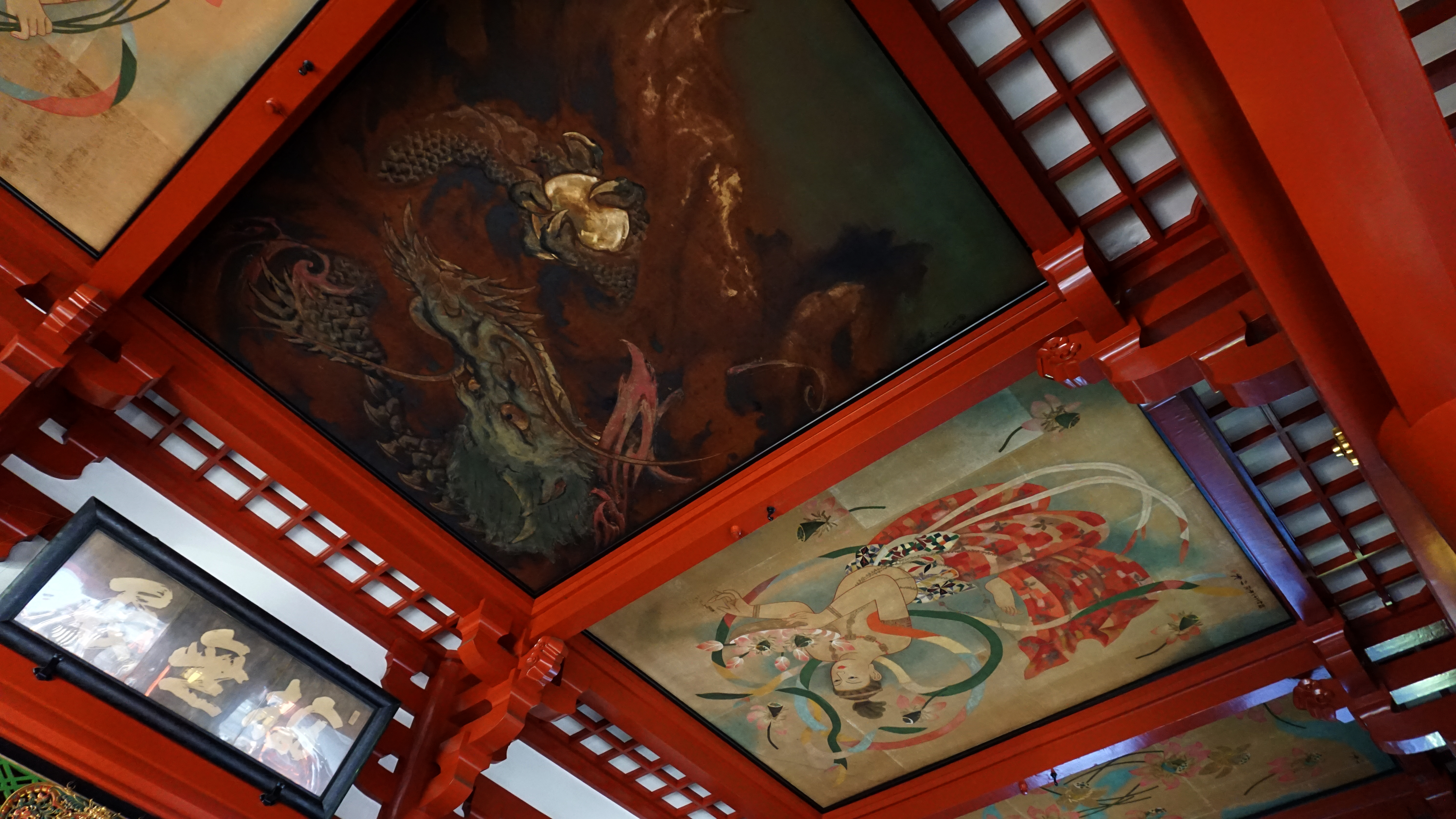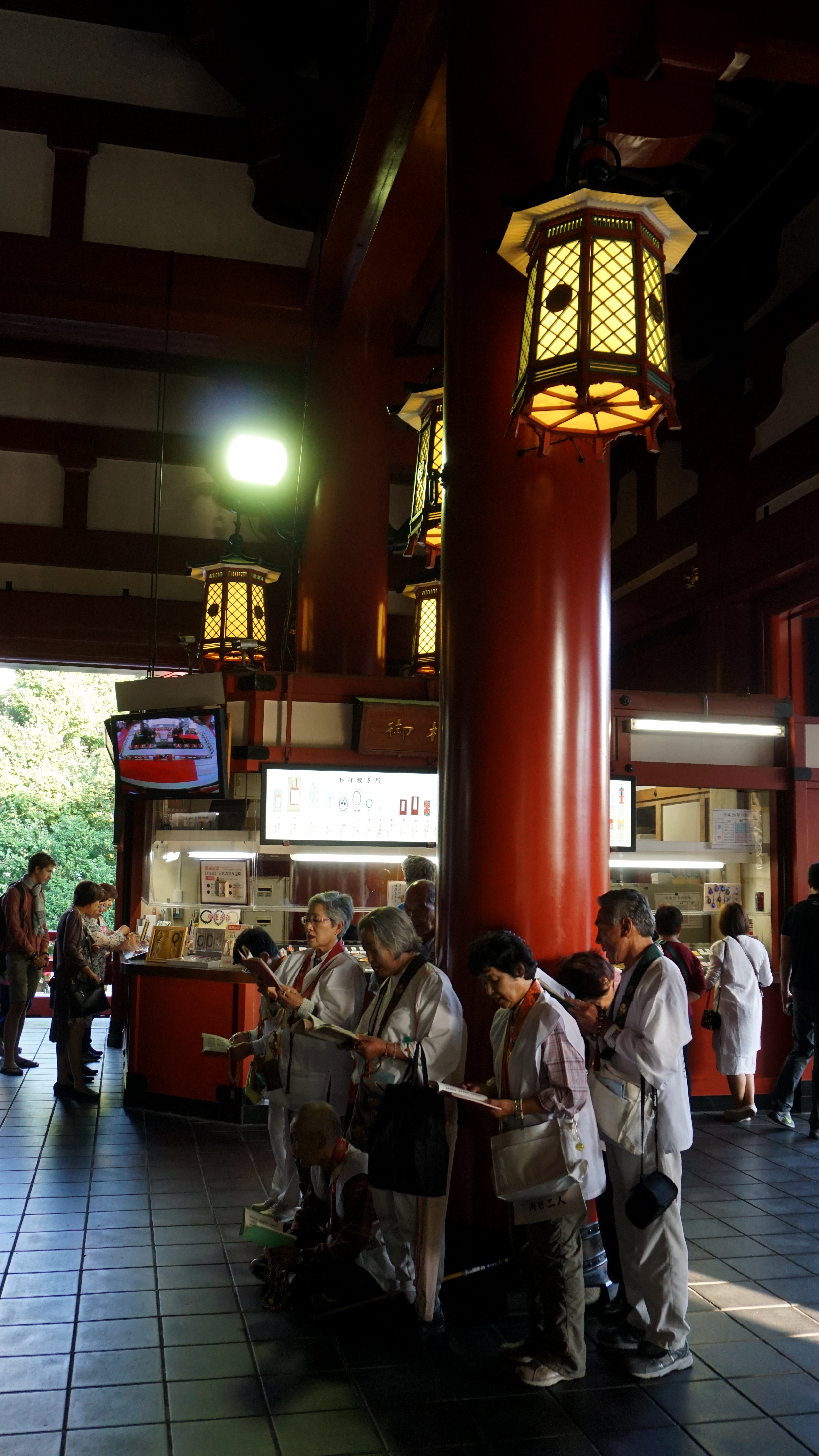 Unlike Chinese Buddhist temples, Senso-ji has one main hall and is not surrounded as a courtyard building. The large hall separates the space where worshippers are and where the statuary is. Instead of coffered ceilings as is common in China and Korea, this temple’s ceiling consisted of five large murals. As is customary for a Buddhist temple, there were candles in front of the altars. However, unlike most Chinese temples I’ve visited, Senso-ji has booths and tables in the corners to buy fortunes and prayers. Usually, in the China prayers would be sold in one of the side rooms of the courtyard space where incense is also sold.