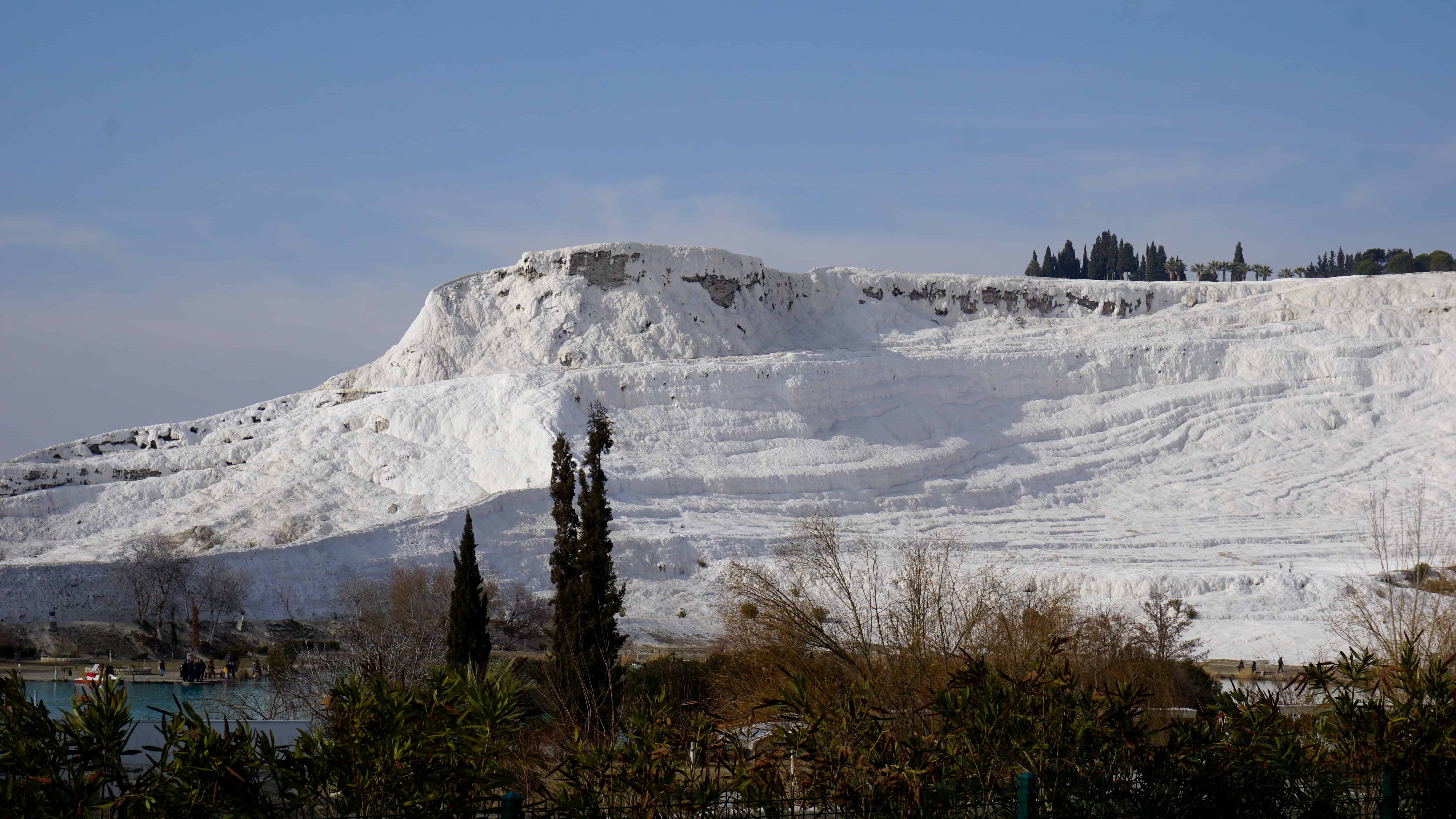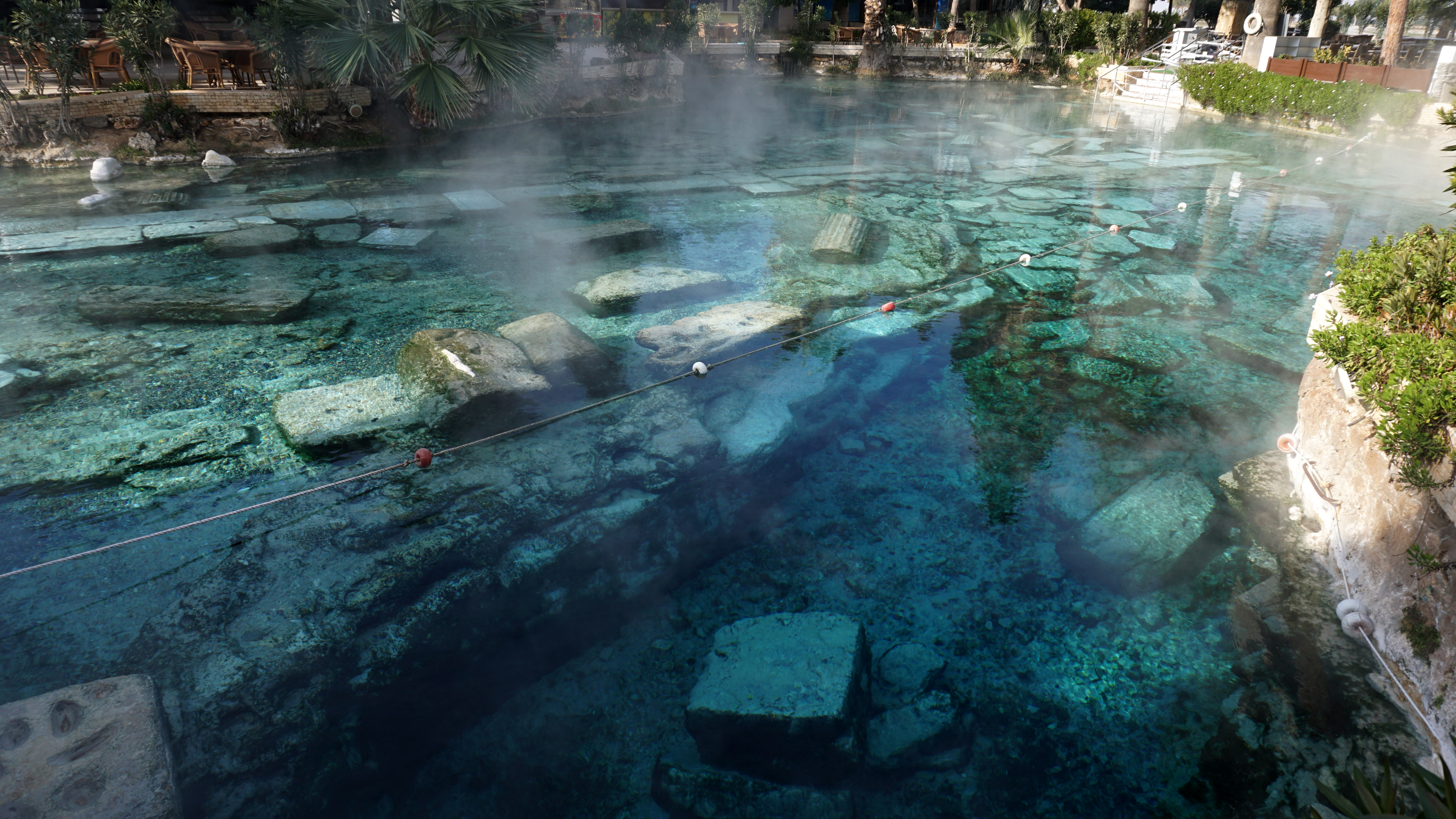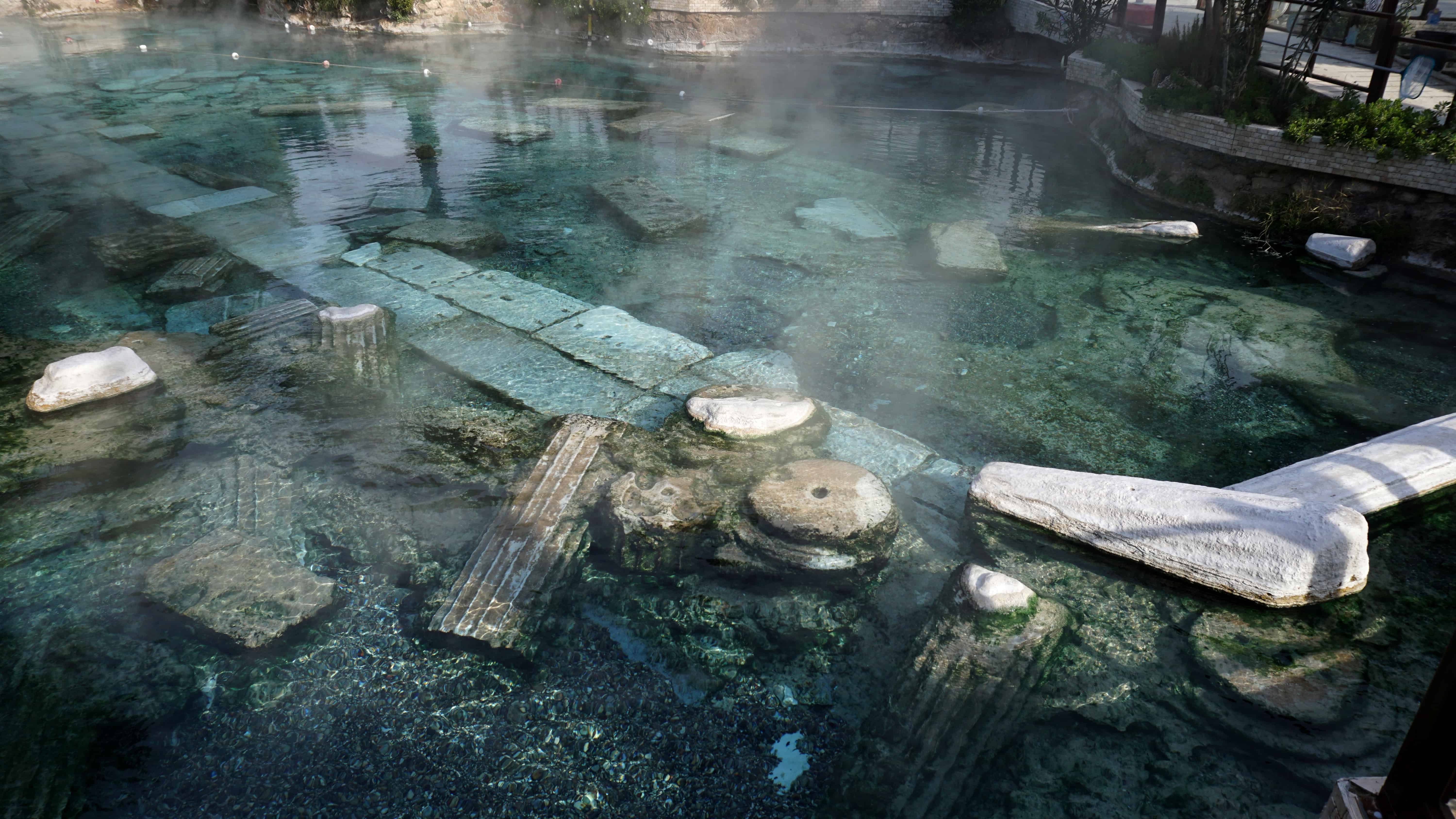 The Pool of Cleopatra is open for the public to take a dip in for an extra fee. It is not the original location. The crystalline water clearly shows the main marble road. This means that back a couple hundred years ago, the hot springs were flowing somewhere else in the city. This is easy to imagine since there are calcium deposits all over the place with channels of flowing water. Over time, the deposits would have built up differently and flooded different places at the site. So, to take a dip in the pool where Cleopatra did is not possible today.