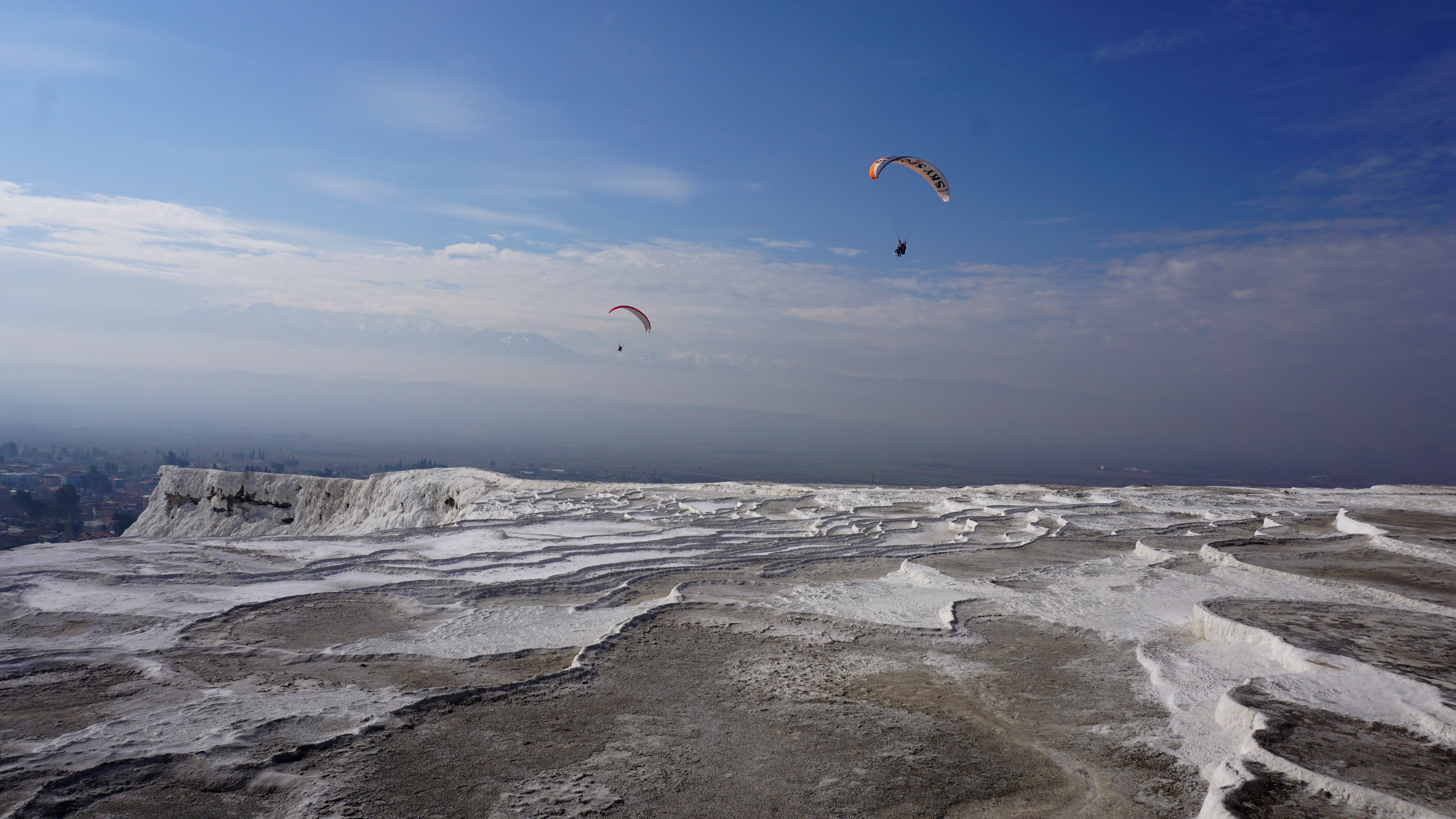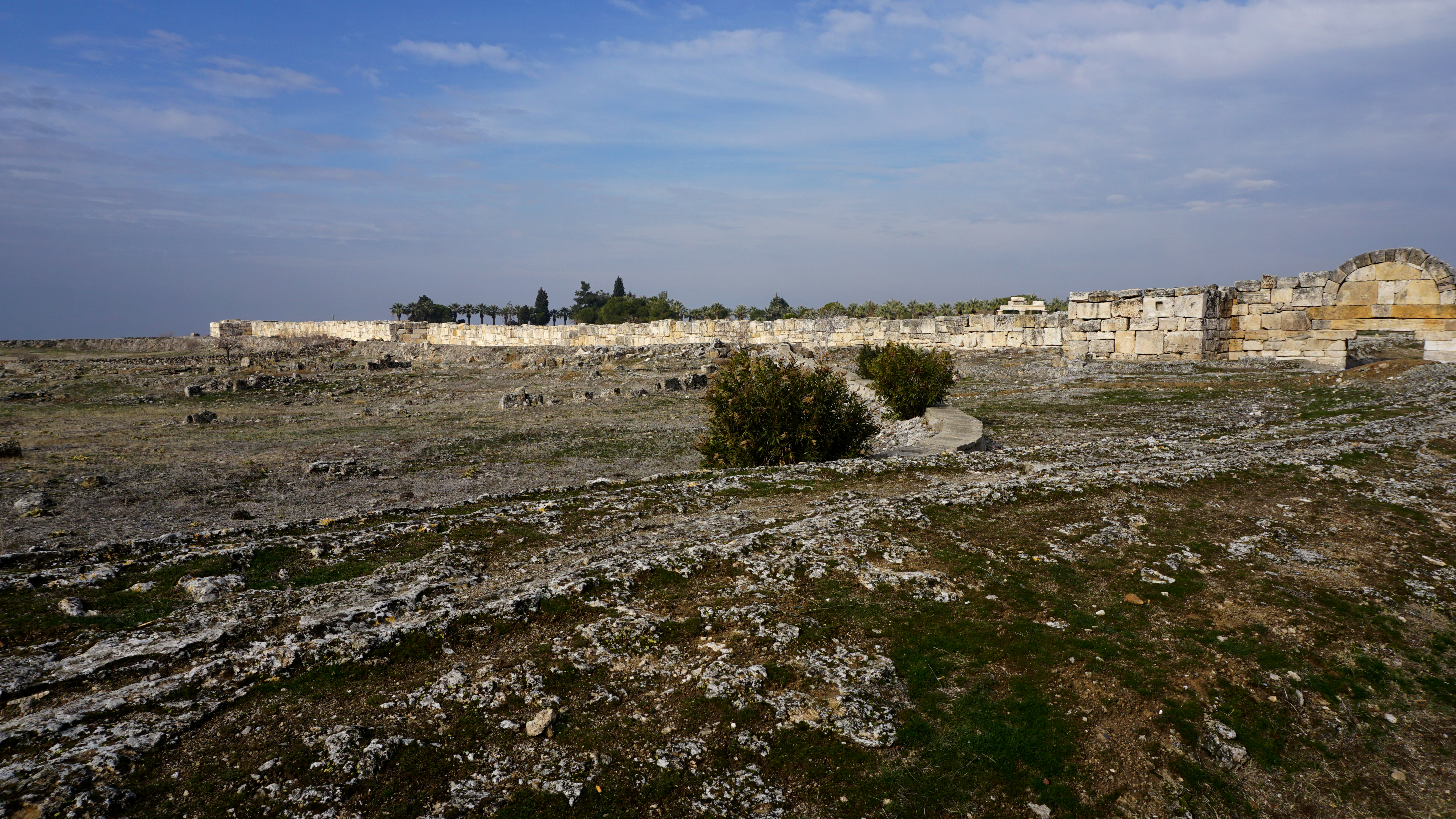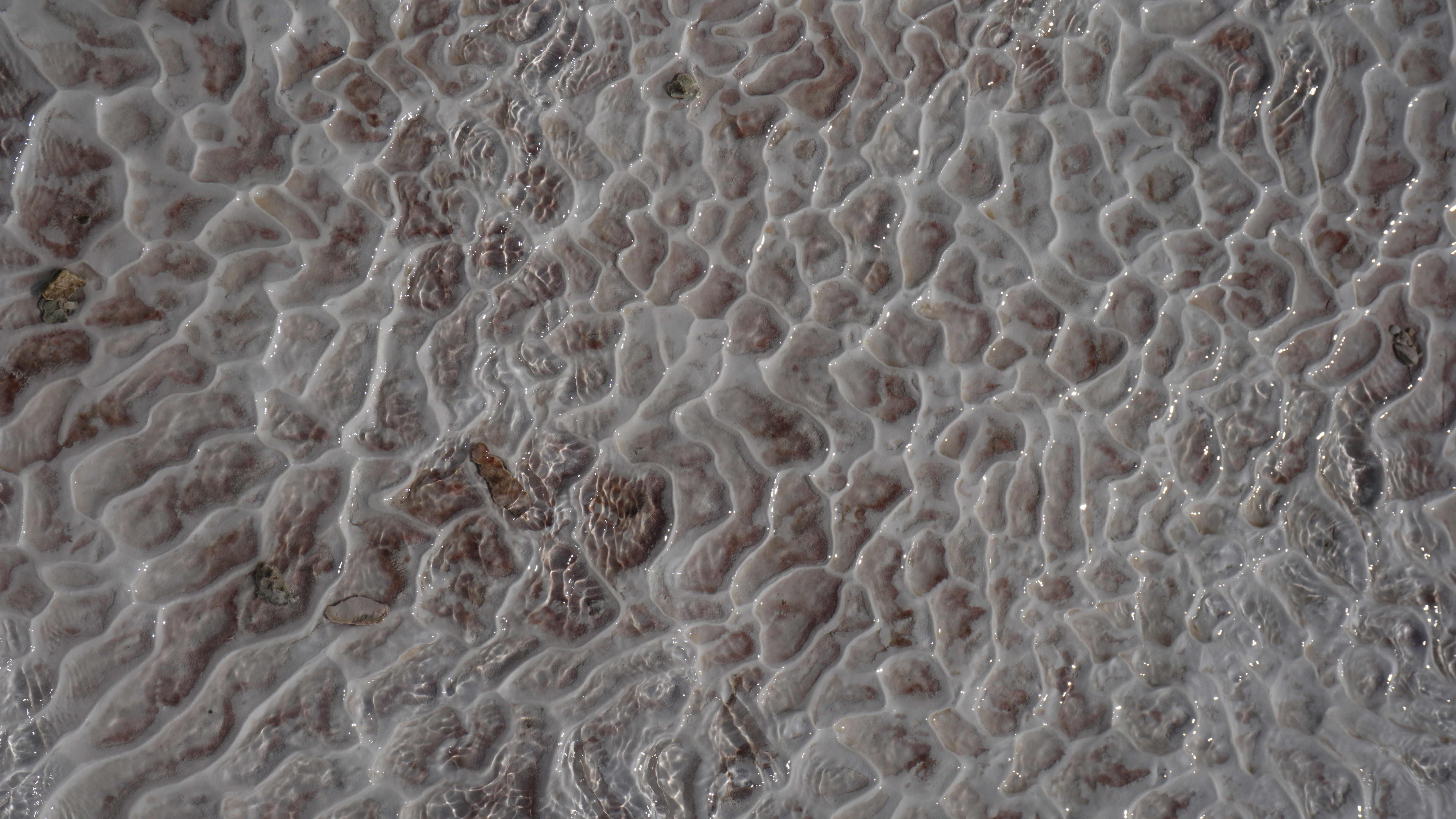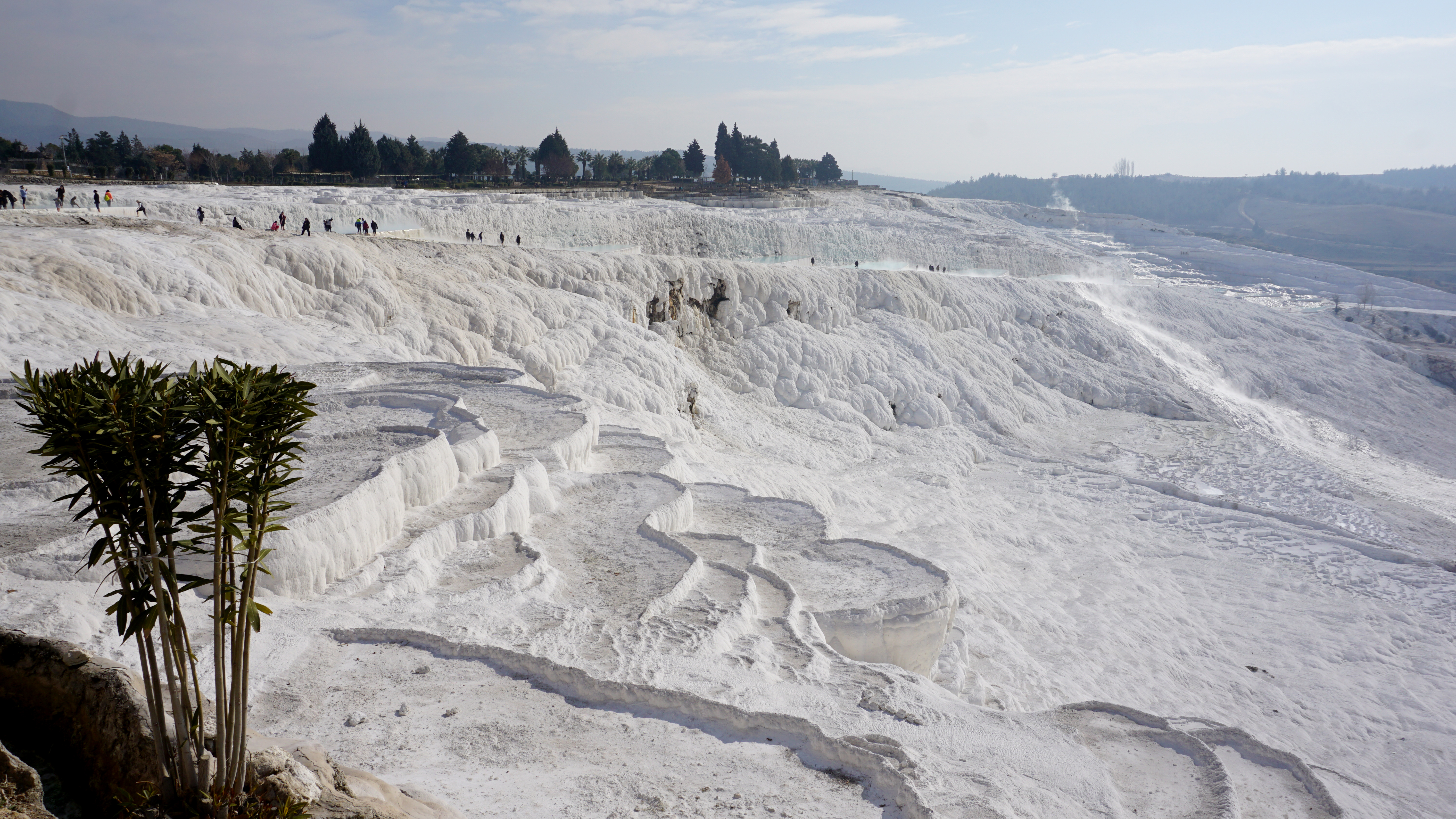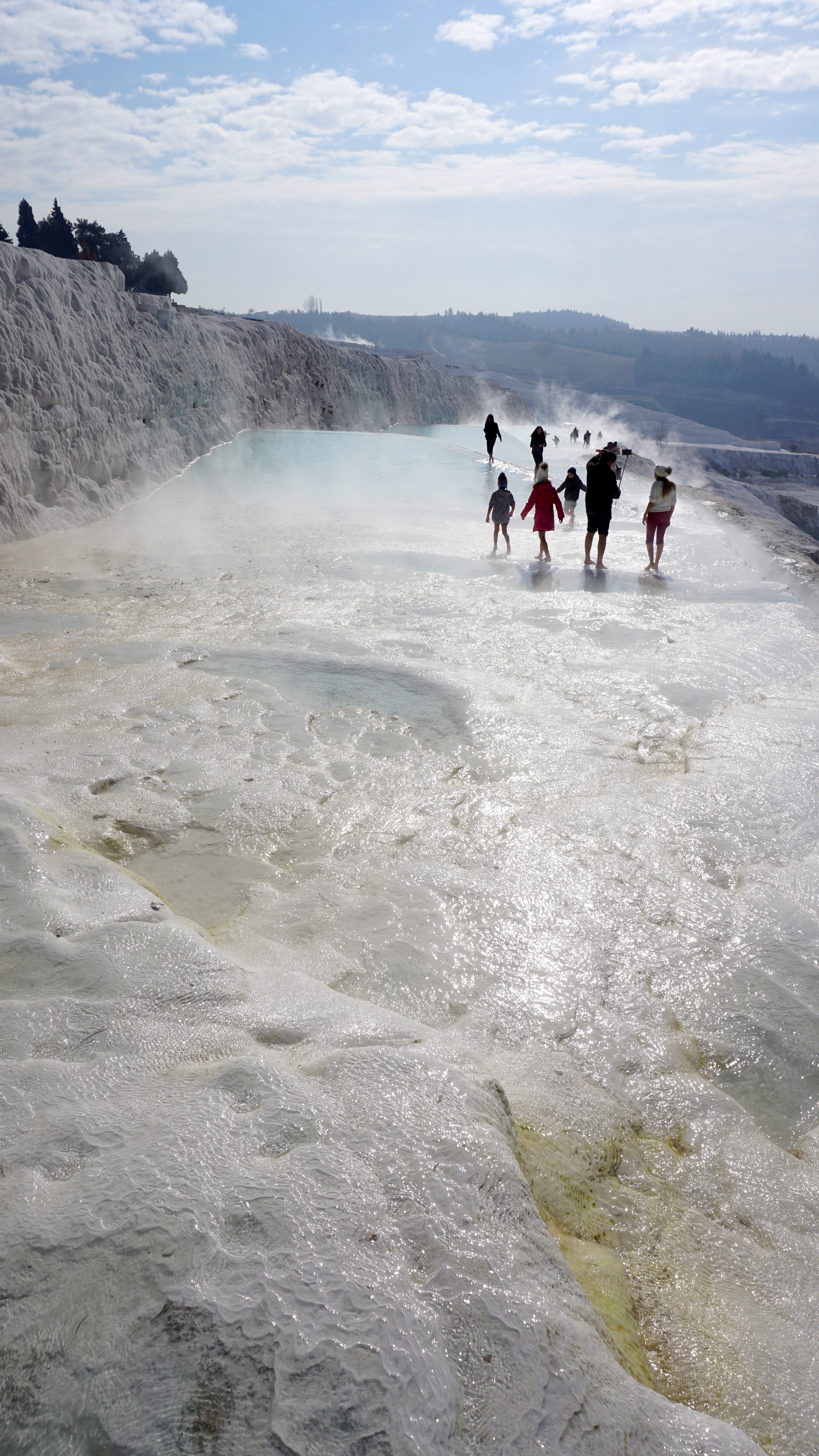 It is lukewarm water. However, some pools were warmer and others downright cold. The stone is smooth in some places and rough and jagged in others. You can even walk down out of the archaeological park through the pools on the hillside. These travertine terraces wrap around the whole front of the pools. However, today they are managed to make the maximum impact for guests. Being there in the off season, only part of the terraces has water flowing. I assume that during the high season the diversion gates are opened allowing water to flow across the whole hillside.
