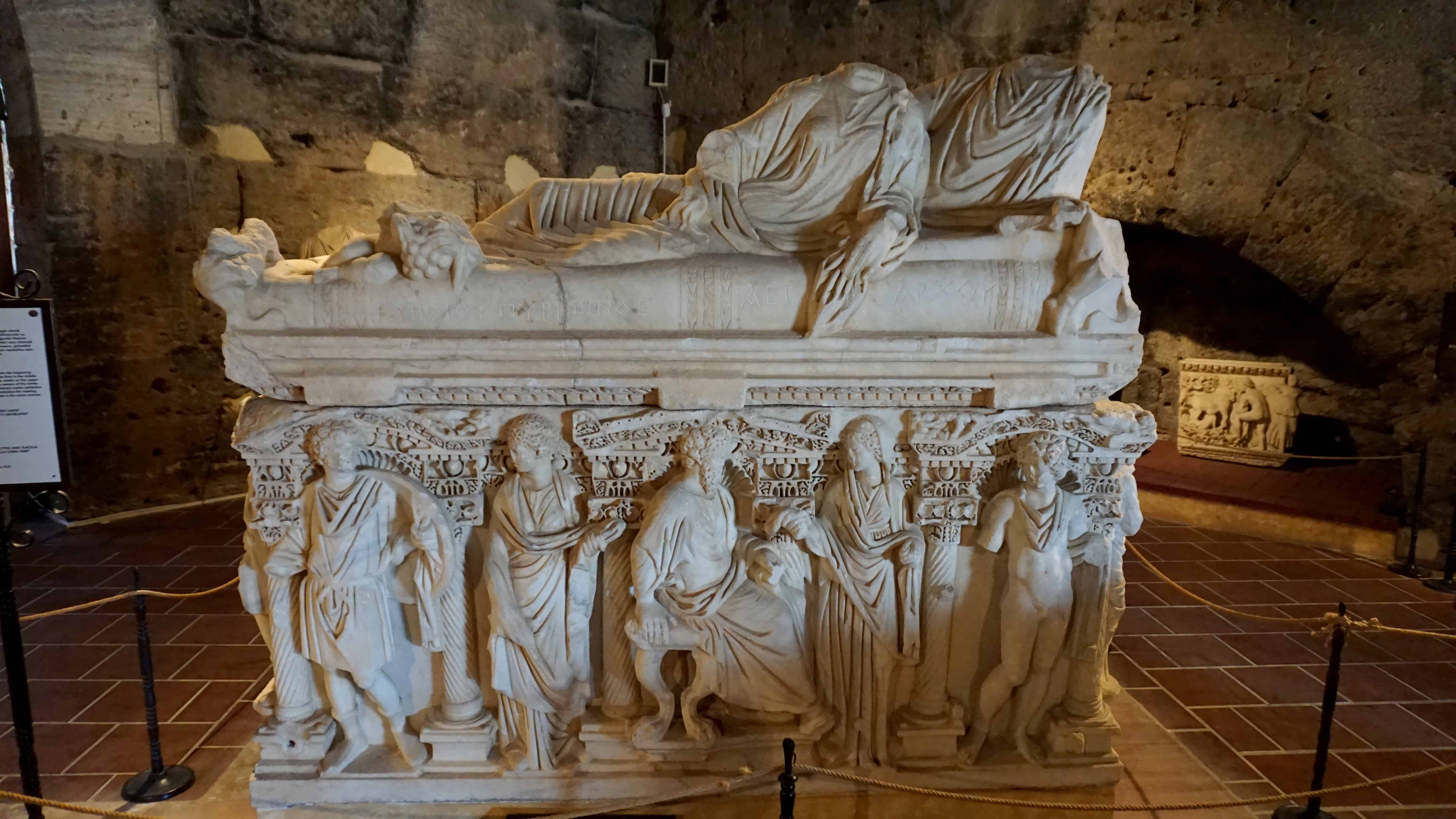 Another major building that has been revitalized is the old bath house. It is very big, as is to be expected in a resort town. Today it is used as a museum housing many artifacts from throughout the archaeological site. One gallery displays stone artwork from the theater. Another has magnificent sepulchers.