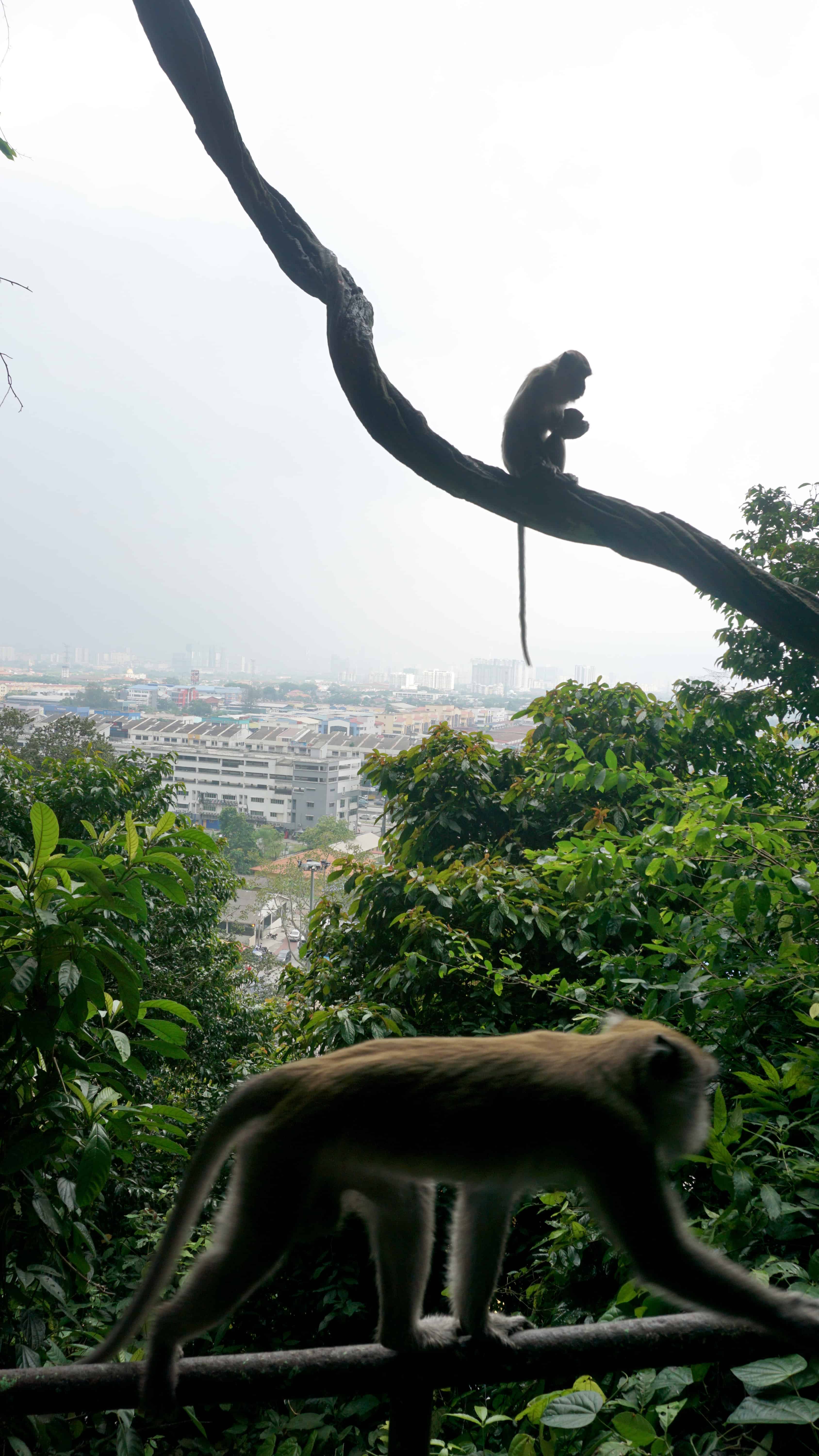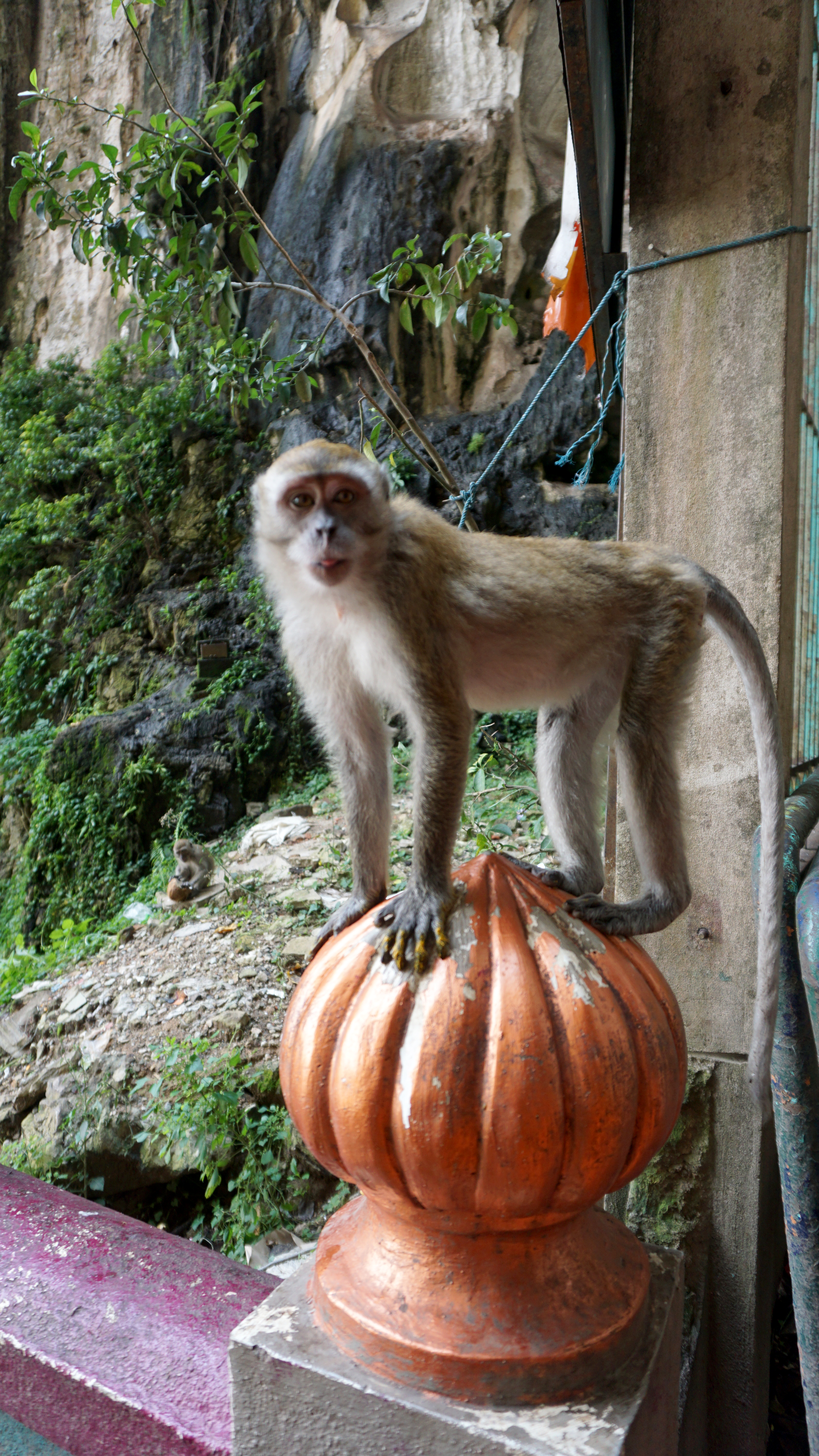 The hill is also home to some monkeys. They climb up and down the steps hoping for some food. Even with signs all over saying not to feed the monkeys, people still bring snacks to share, mostly fruit. Monkeys are cute but also a little scary when up close and they are being defensive of their treat or territory.