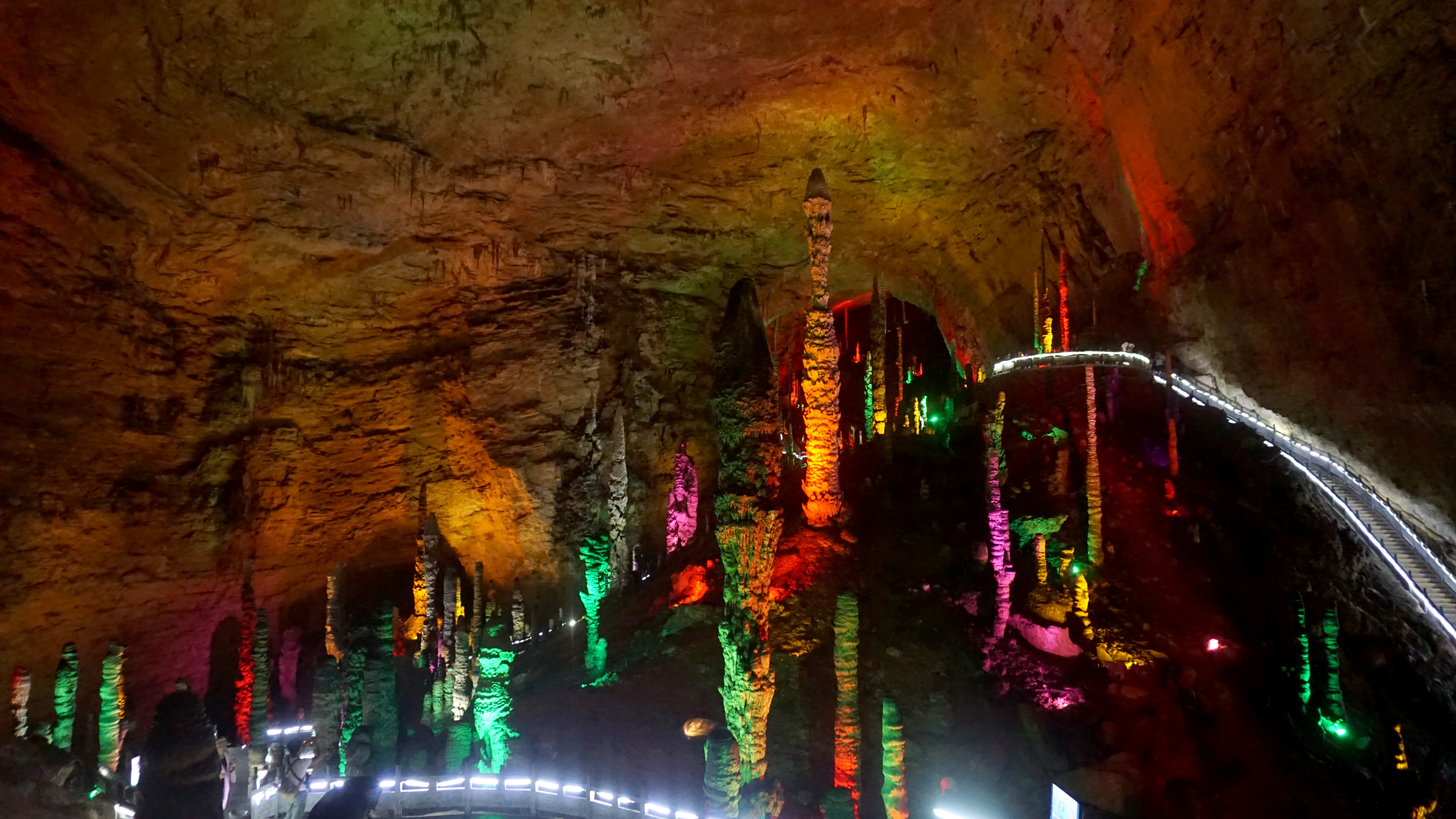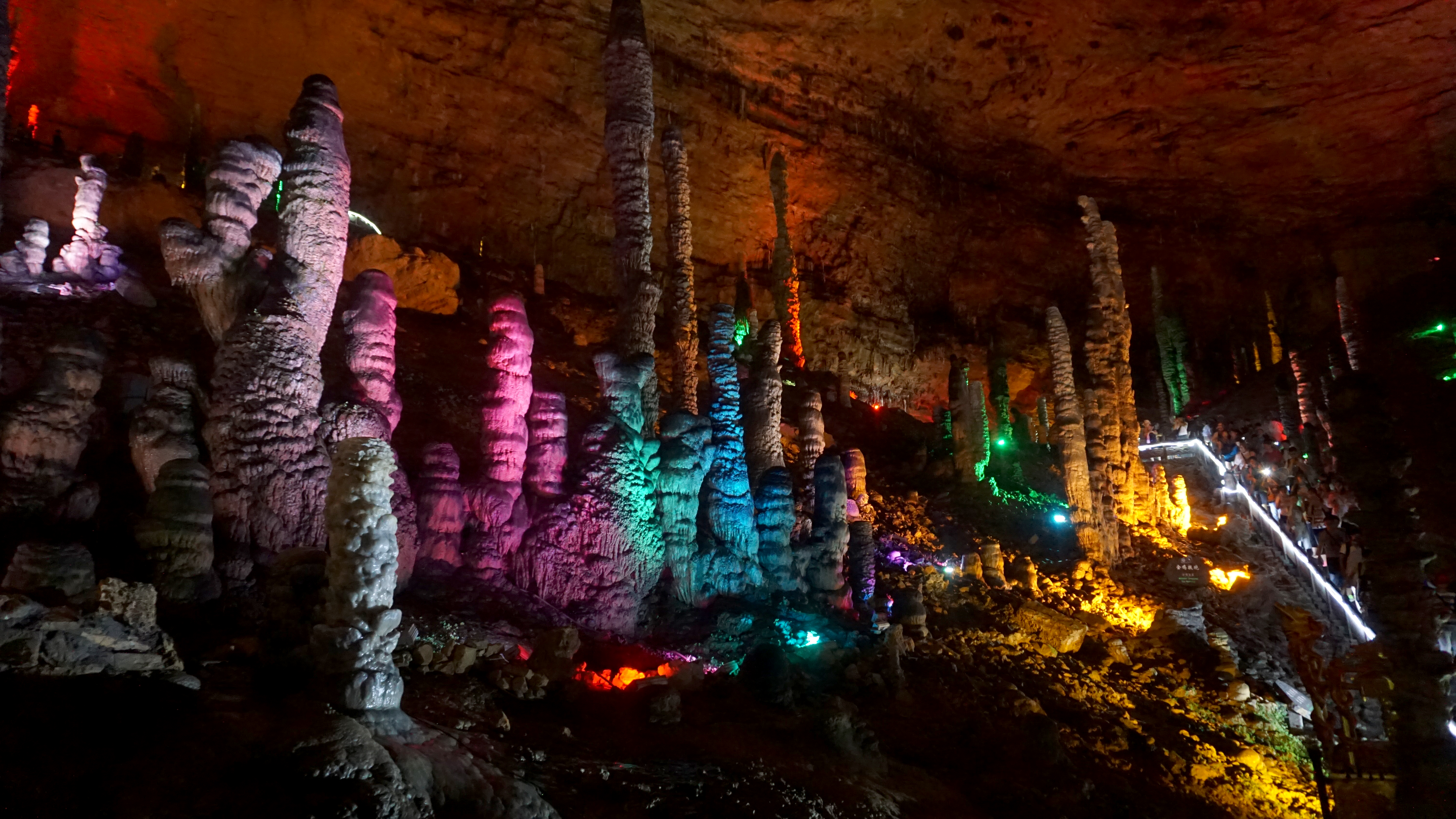 After hiking down Tianzi Mountain in Zhangjiajie National Forest Park, we still had some evening hours left, so we went to Huanglong Cave (Yellow Dragon Cave). This cave system is part of the UNESCO World Heritage designation and is very accessible from Wulingyuan. We just had to ride a city bus (route 1) for about 20. We didn’t know what to expect at the caverns, but having been to Chinese caves before we had an idea of colored lights, people touching formations, and loud groups. And, that’s what we got.