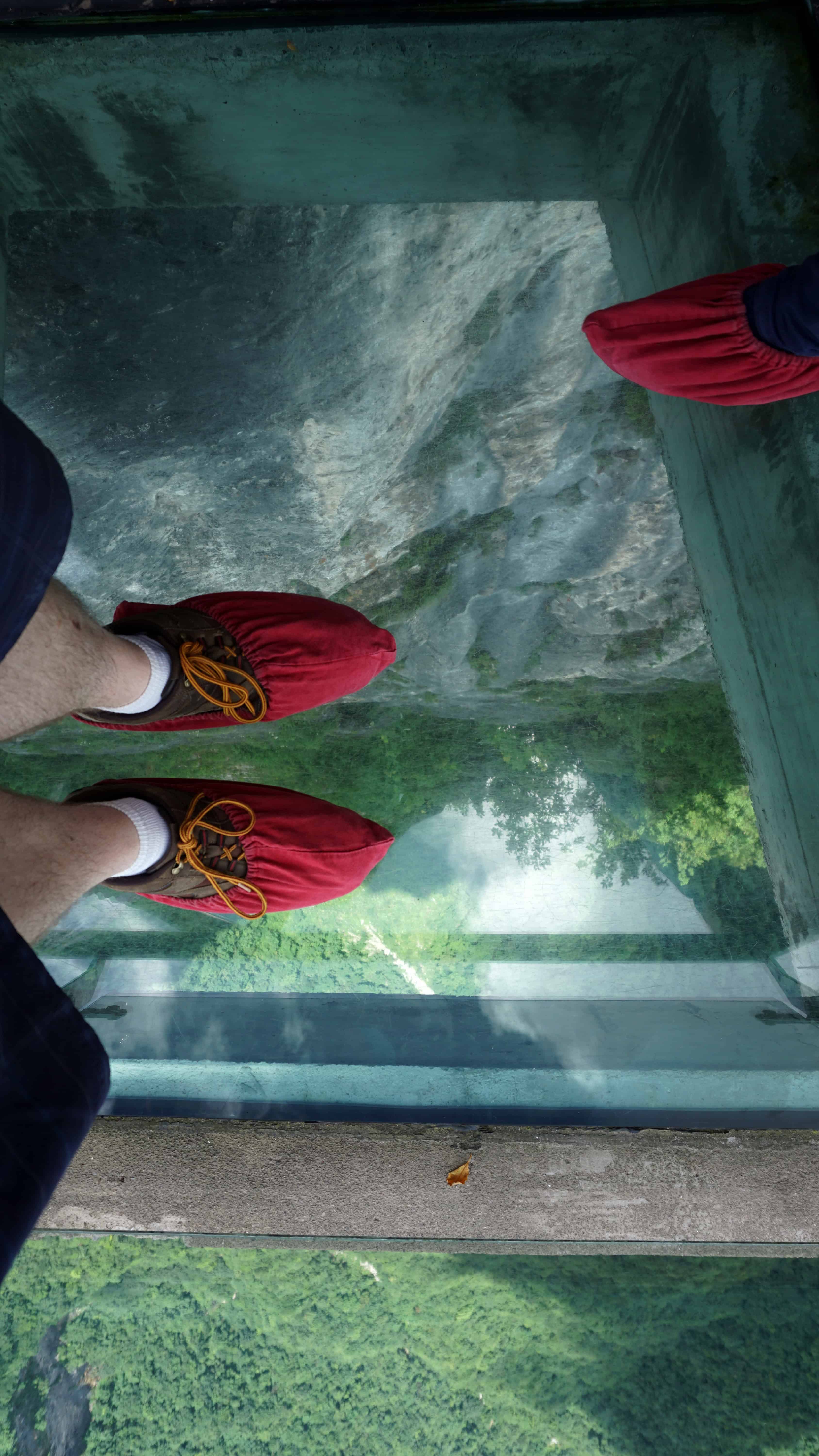 At the top there are three colored routes for visitors to follow. The most traveled is the red route that goes along the west side of the mountain. The path boasts spectacular views. The trail is suspended off the cliff side and winds around the edge of the mountain. At one point there is even a glass-bottomed path you can pay a few extra yuan to walk on. It isn’t scary, but people were still freaking out and hugging the wall.