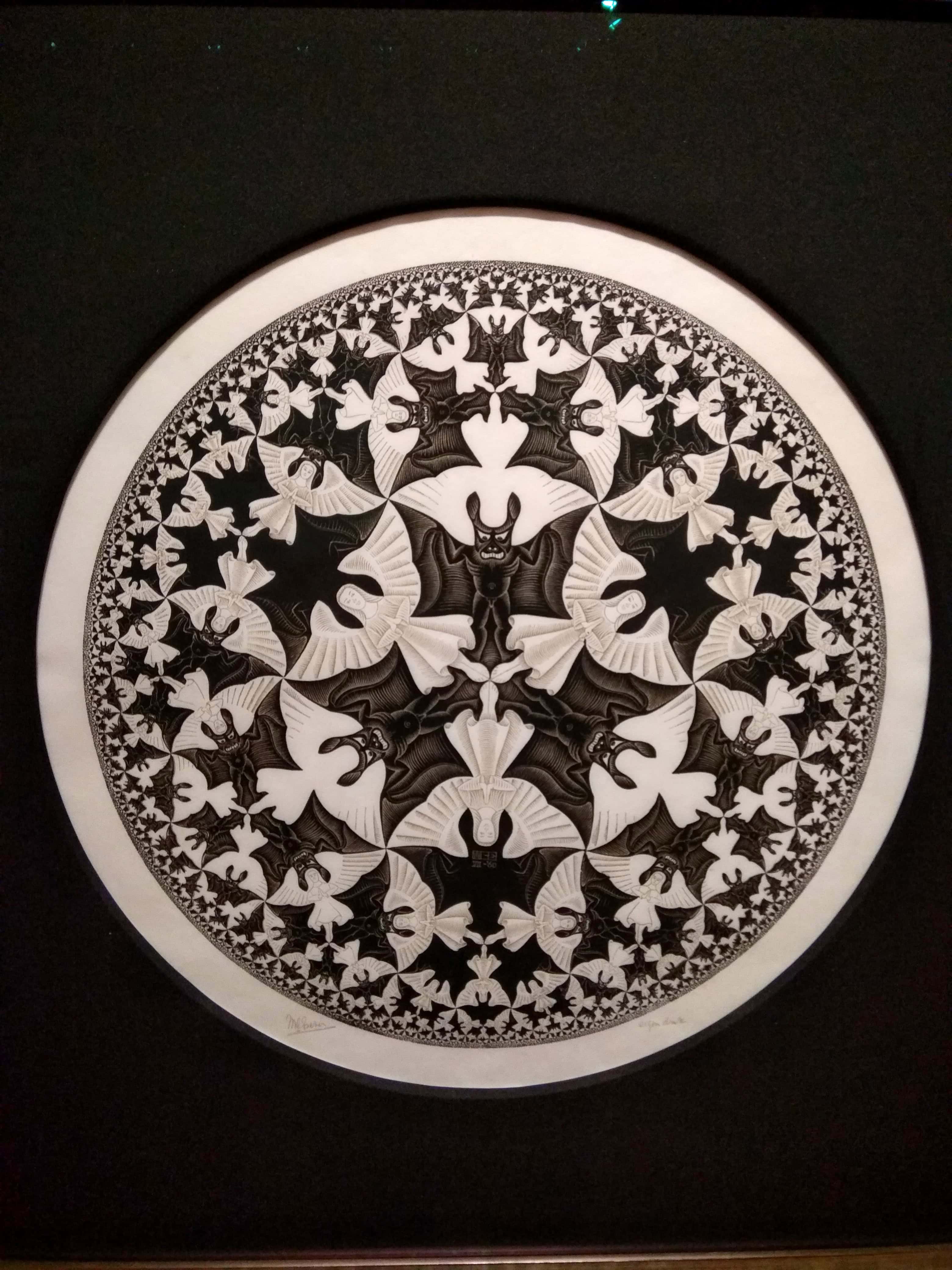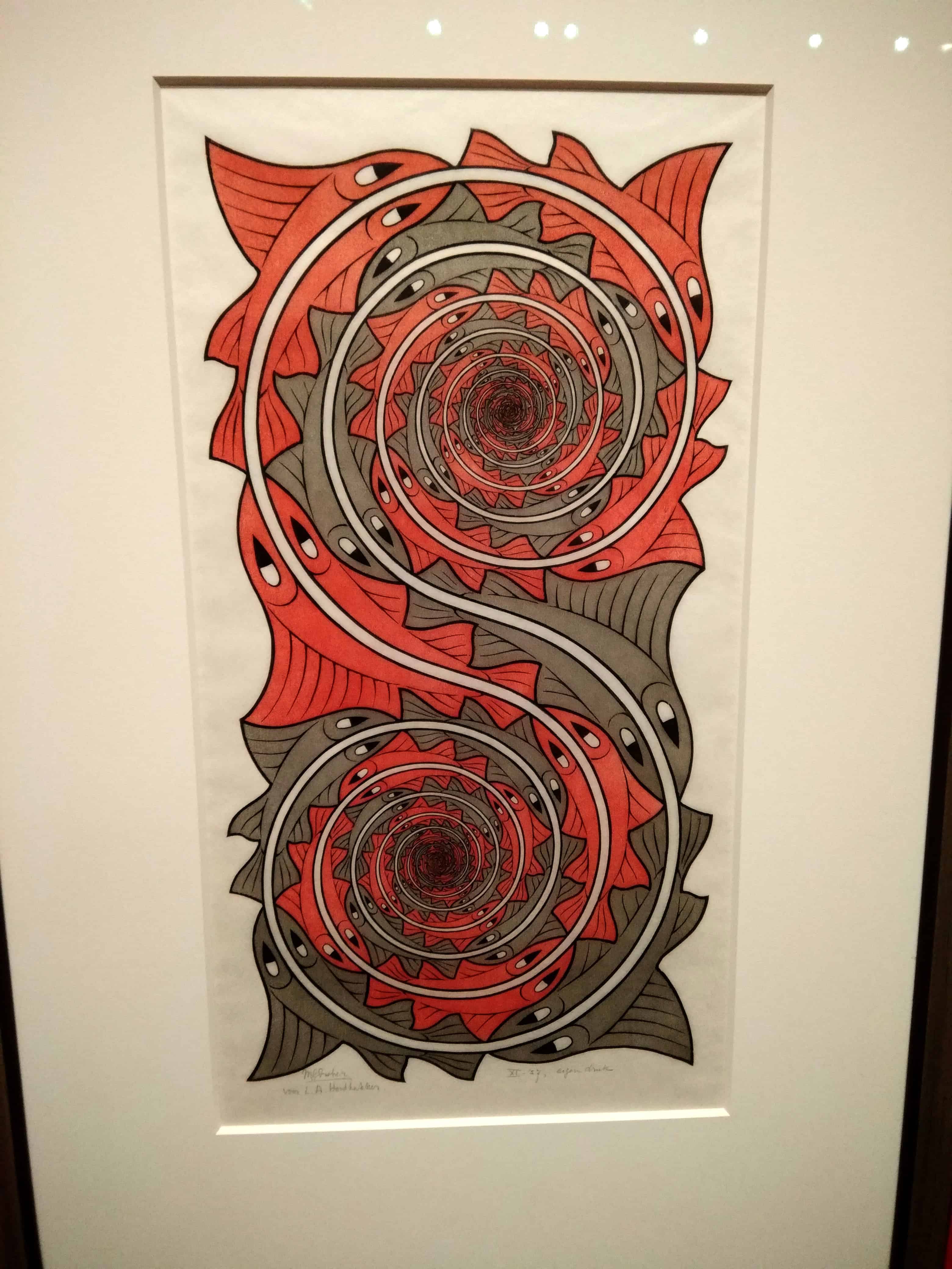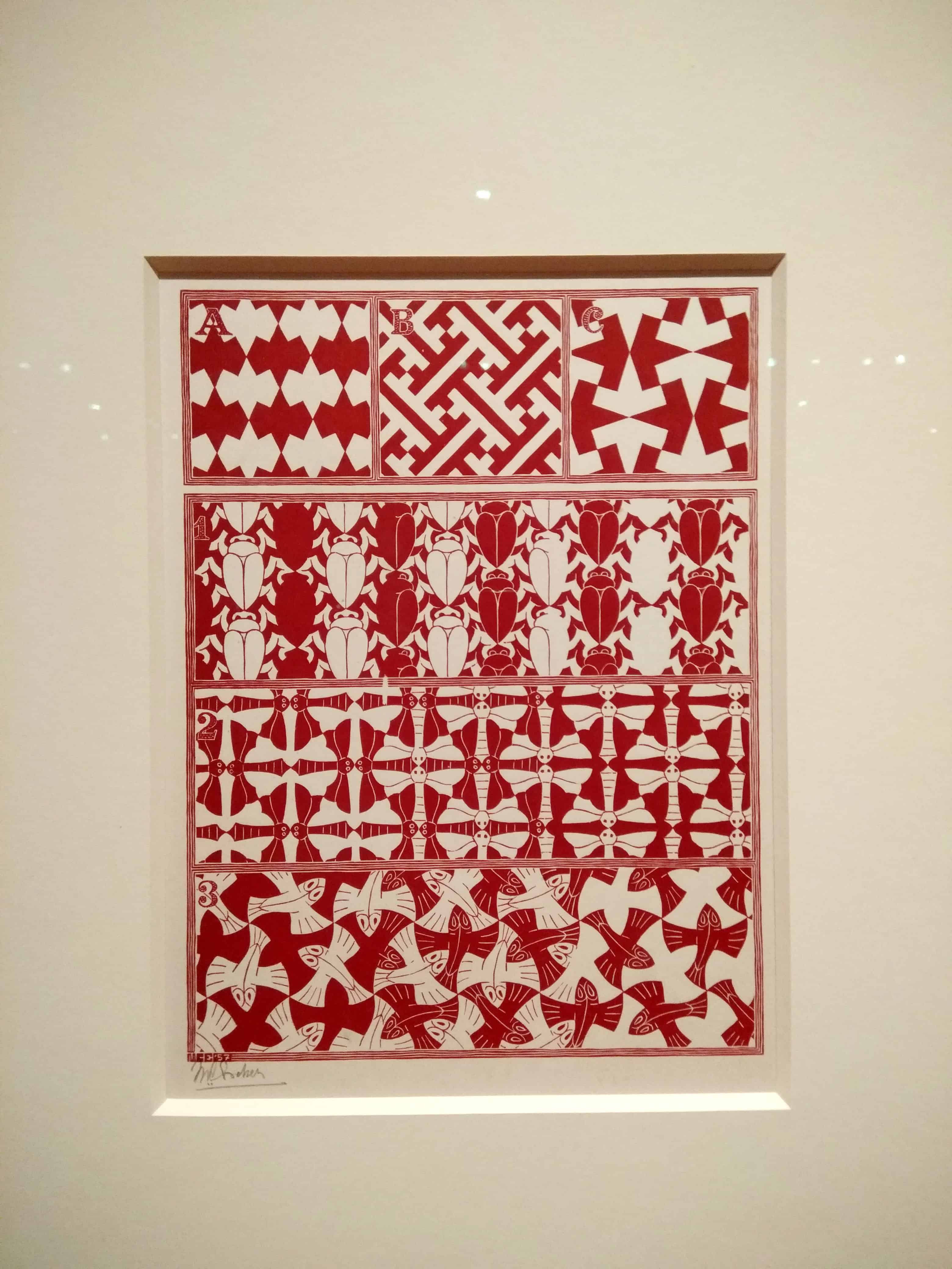 Since art classes as kids, many of us have been fascinated by the works of M.C. Escher. He never really considered himself an artist, and during his day was more celebrated by mathematicians. His tessellations and impossible sketched illusions wake the wonder in most people who see it. I had only seen his work in books previously even though I tried replicating it in a 9th grade art class. Seeing it in person was thrilling. I could get up close and examine the change from one from to the next in the tessellations. I could follow the winding stairs to nowhere and marvel the architectural forms only possible in two dimensions.