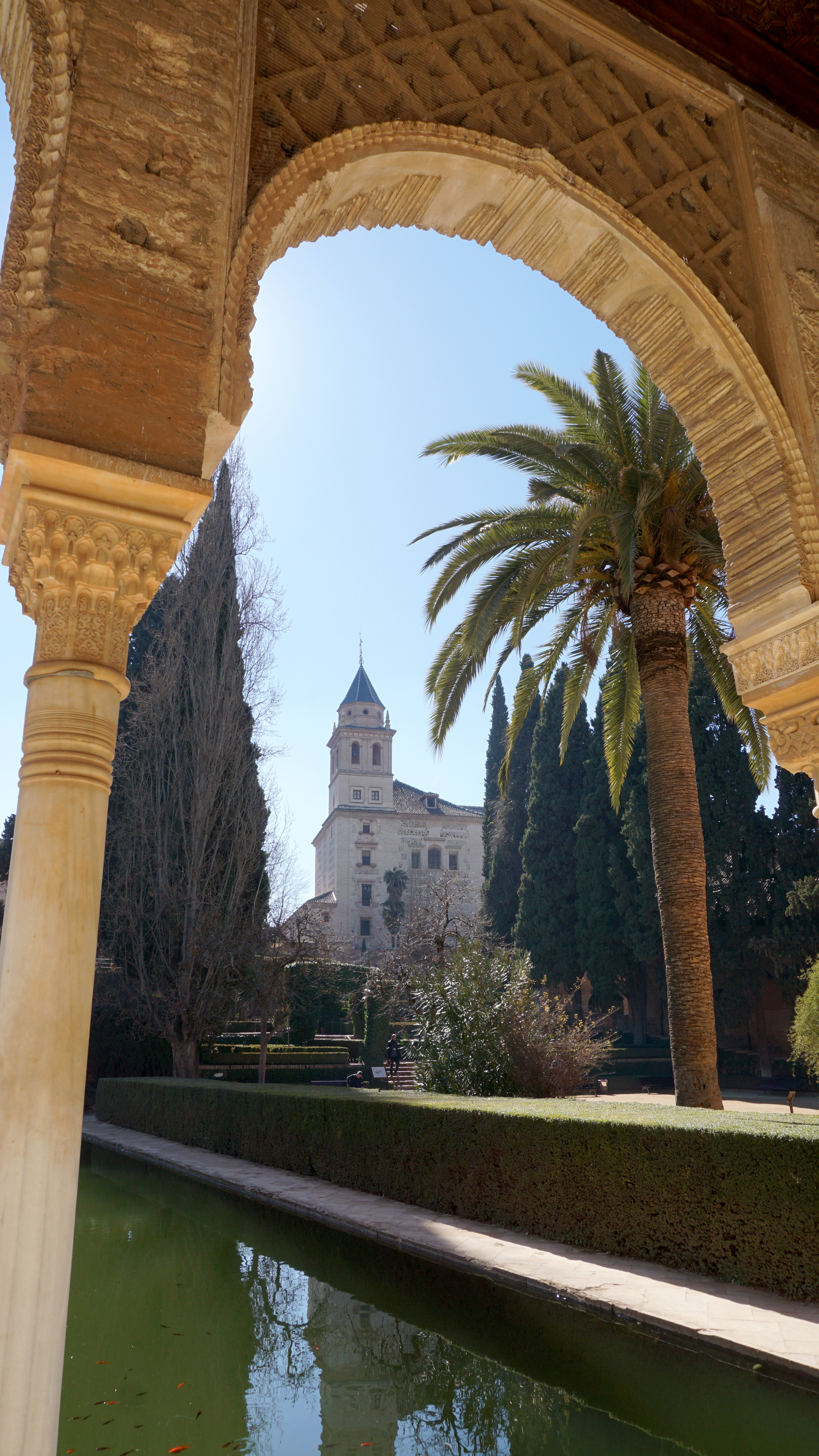 The highlight of the Alhambra is the Nasrid Palace. This 13th century palace is the pinnacle of Spanish Islamic architecture. Even after the Reconquista at the end of the 15th century, the Spanish monarchies maintained the architectural details of the Nasrid Palace. They made small alterations or added on, but they left the intricate plaster work and colorful mosaic tiles. I find it a bit ironic that Spanish monarchs who perpetuated some great crimes in the name of Christianity by means of the Spanish Inquisition spent time in a palace decorated with Arabic verses from the Koran. Perhaps they didn’t know what it was. Meaning that in this case ignorance was bliss.