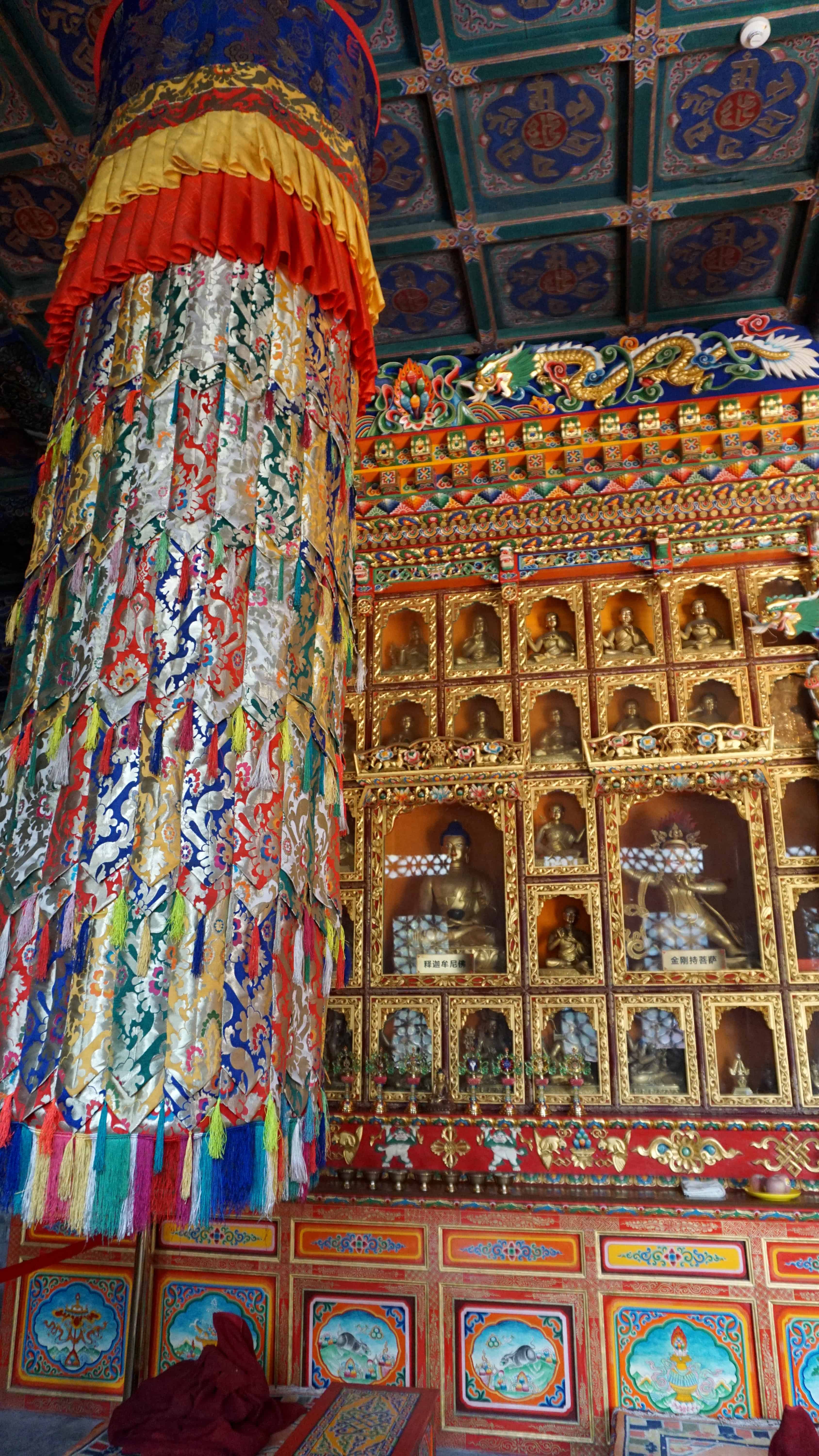 Such wonderful colors fill the place! Colorful braided ribbons drape around the lions’ necks. In two front halls, a collection of vibrant chromatic paintings and tapestries hangs. And, because this is an active and important temple, the halls are well maintained and brightly painted.