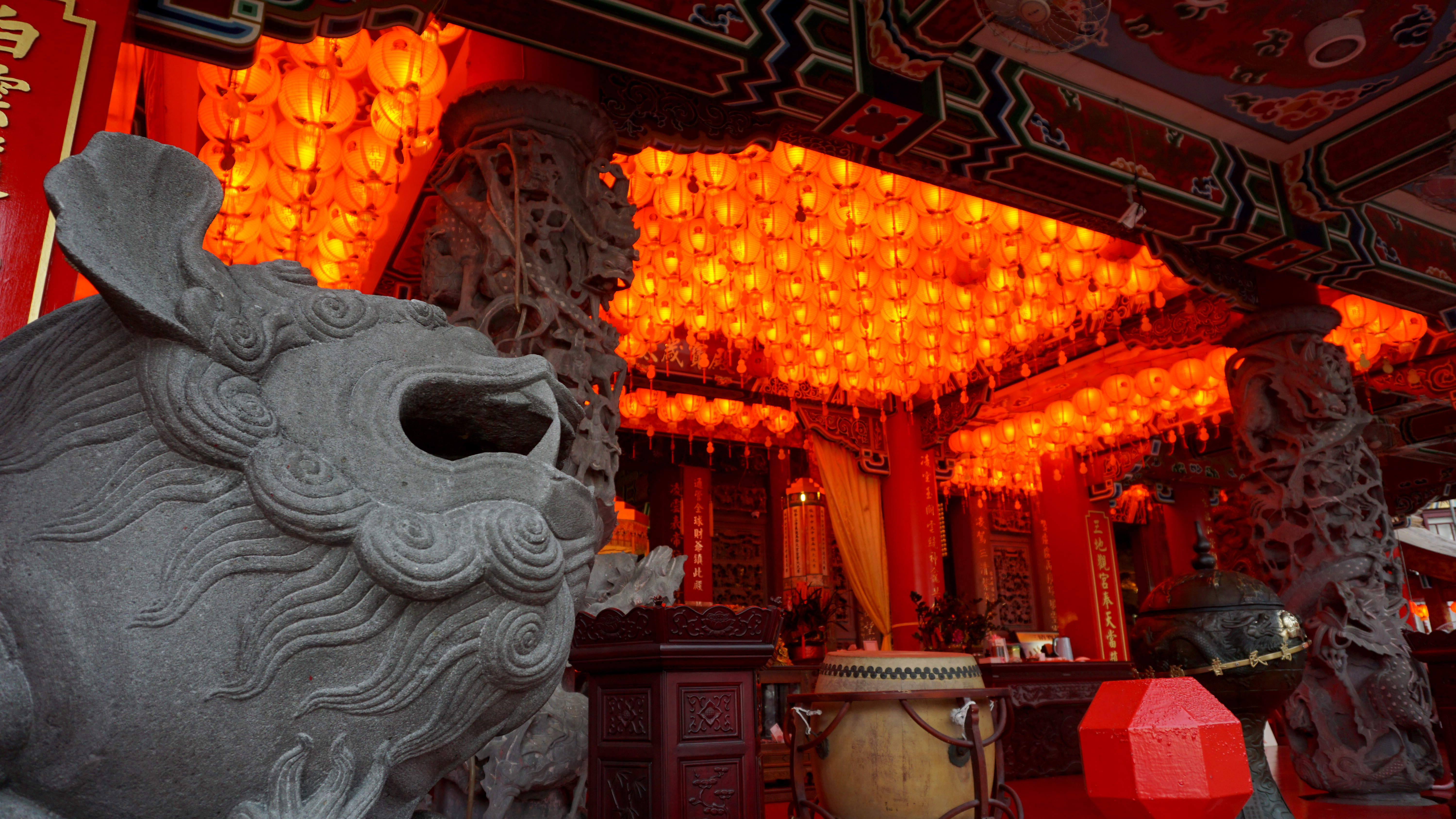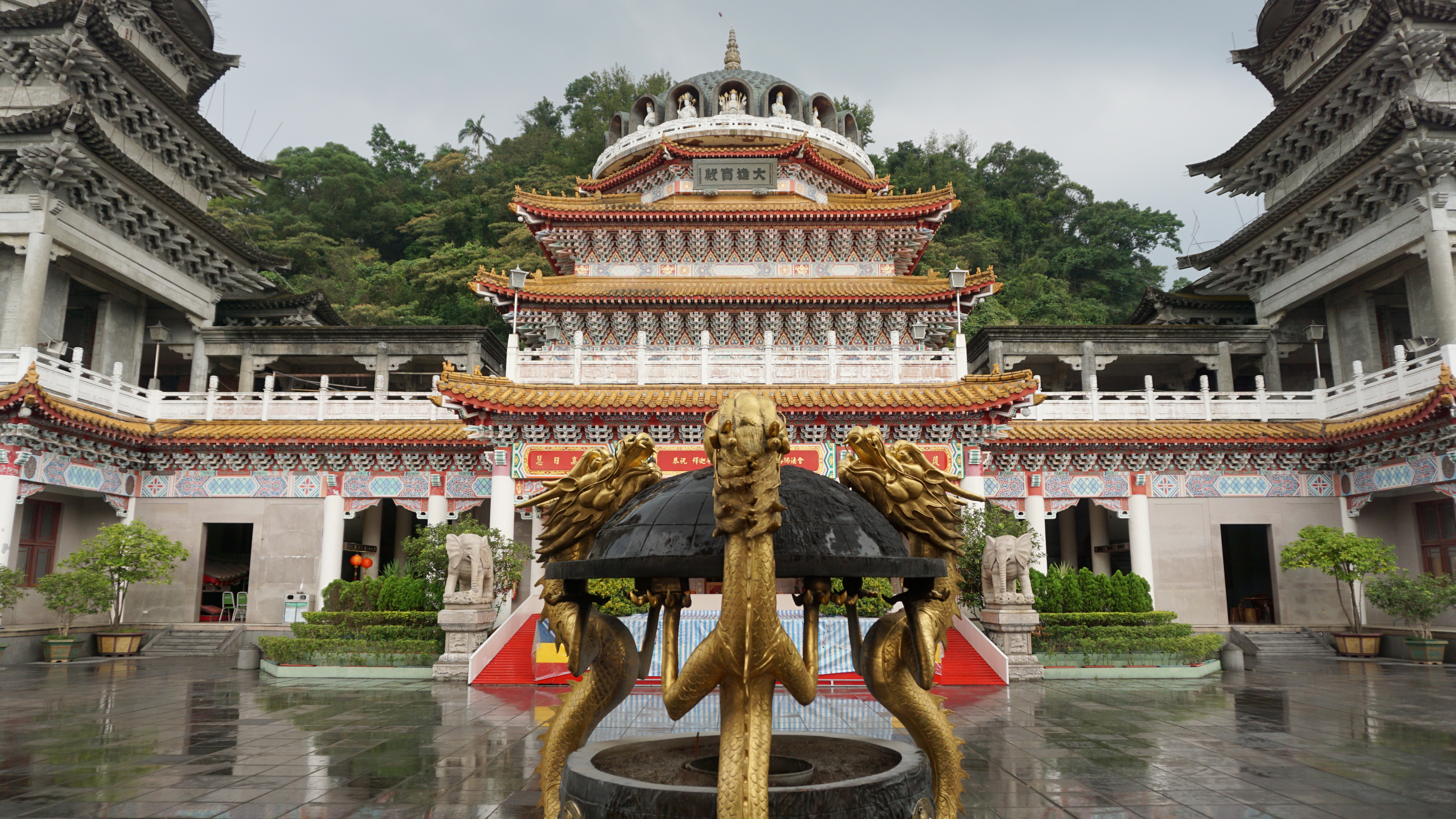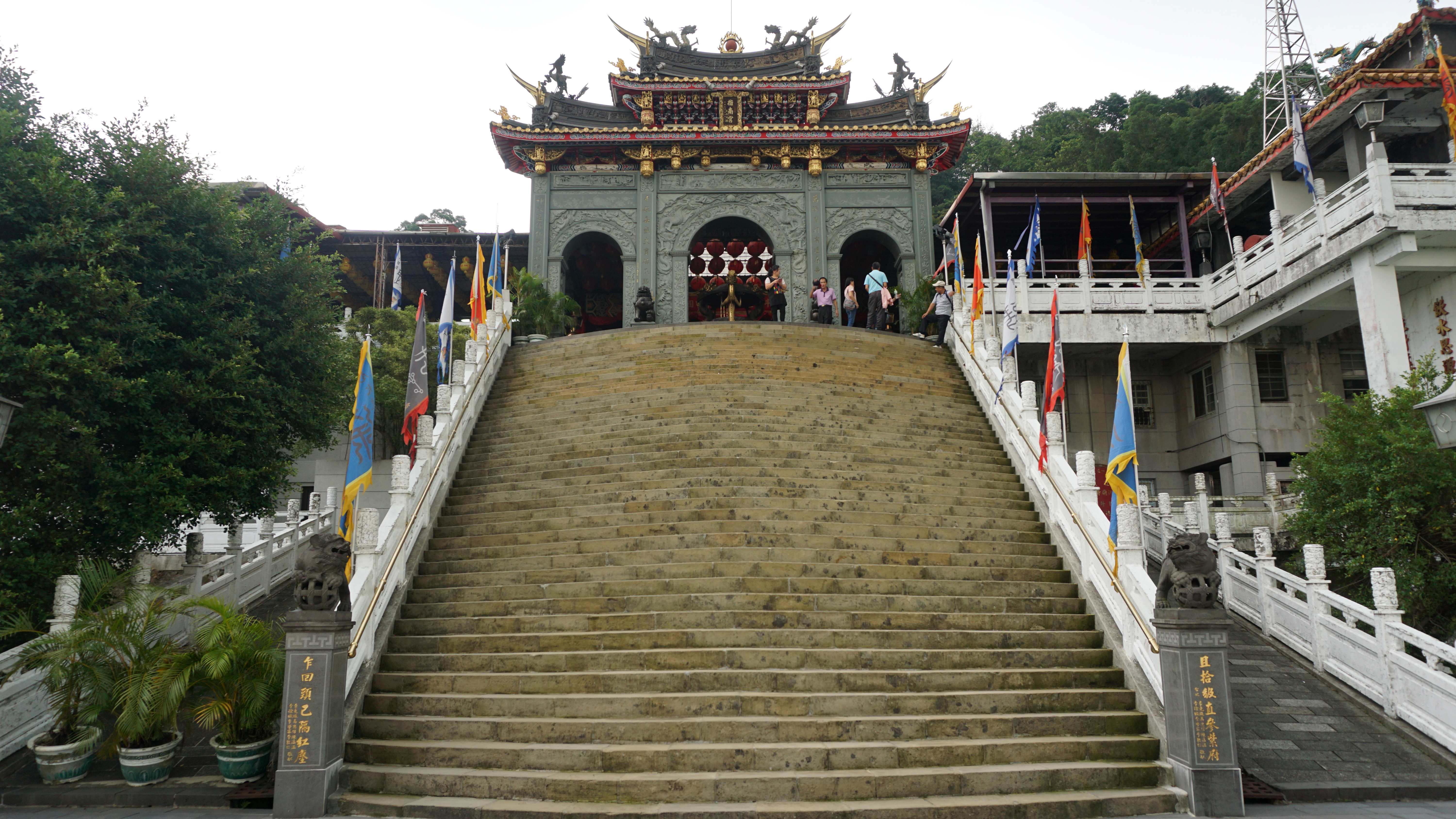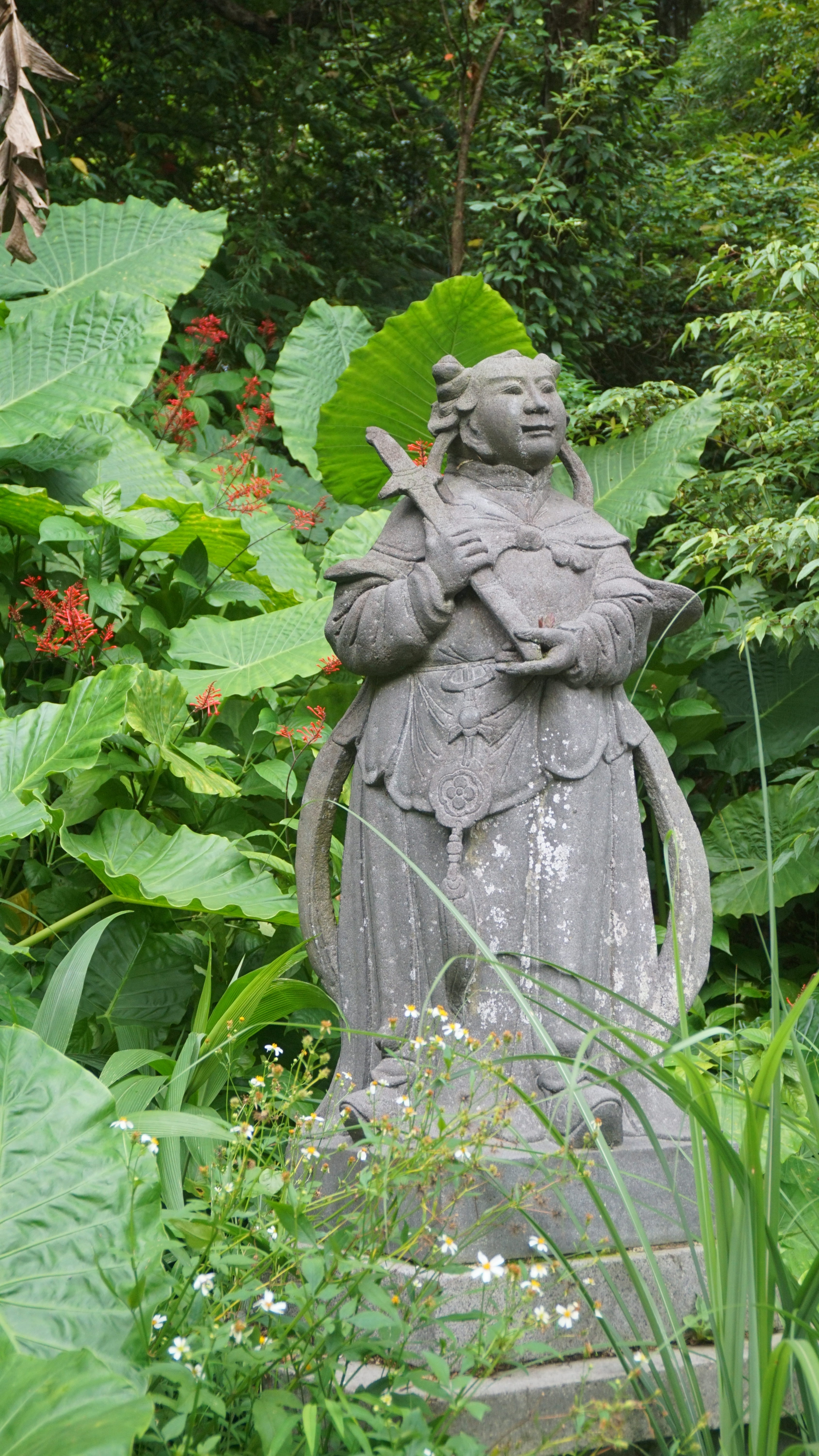 The trail came out at a Taoist temple. I asked the woman there for some water, which she gladly gave. I paused for the view that included Taipei 101 and continued to the road. I continued up the hill along some steps toward a beautiful looking temple. Sculptures lined the trail.