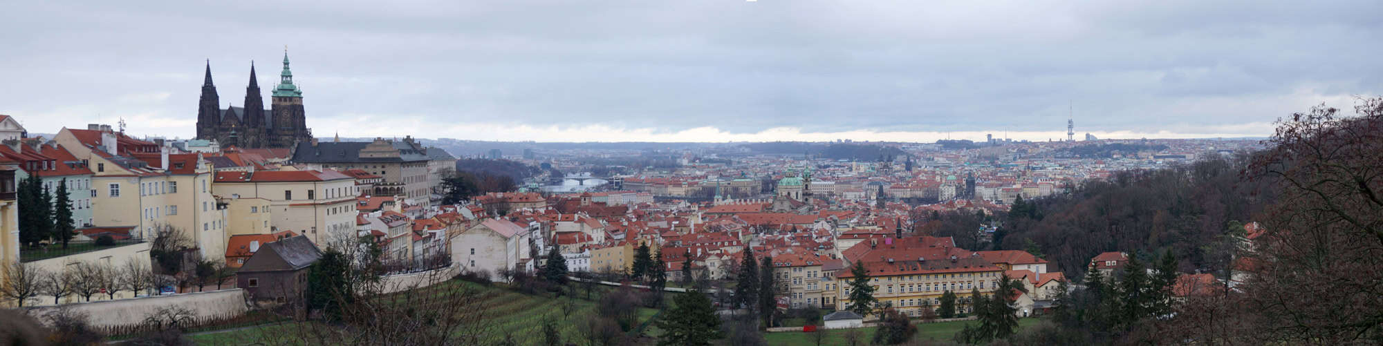 Hanavsky Pavilion was built for the Prague World’s Fair in 1898. It is a restaurant today, but right in front of it is a wonderful view of the city. You can see the castle on the right and Old Town on the left with the Charles Bridge right there.